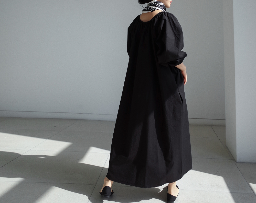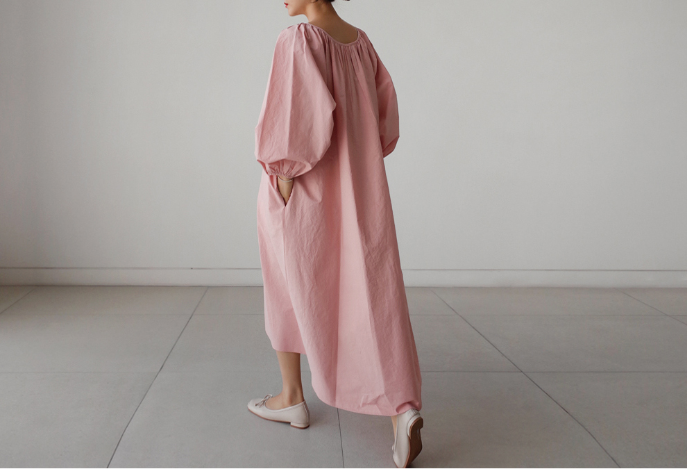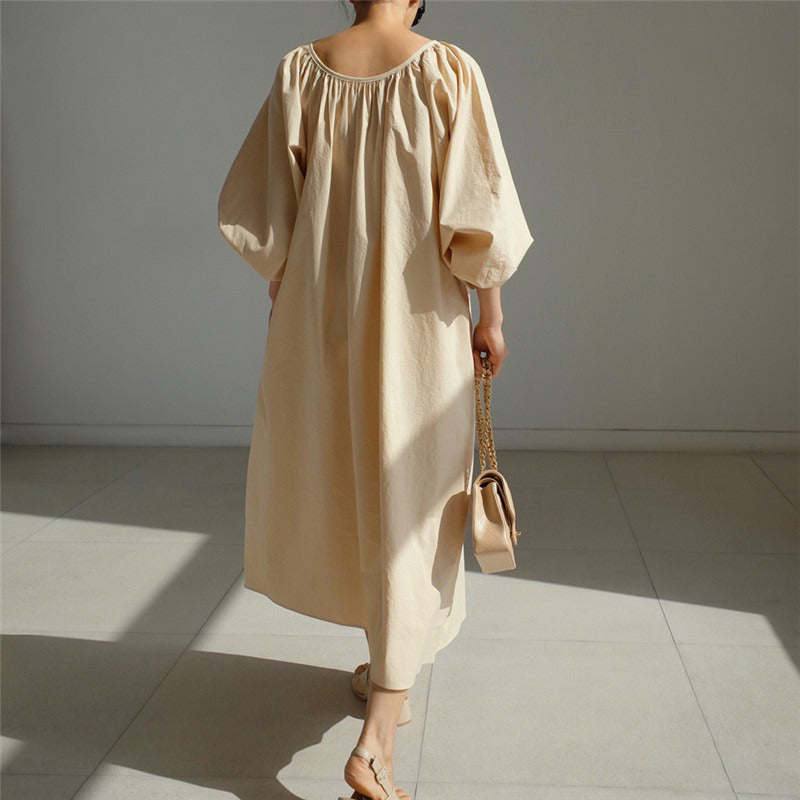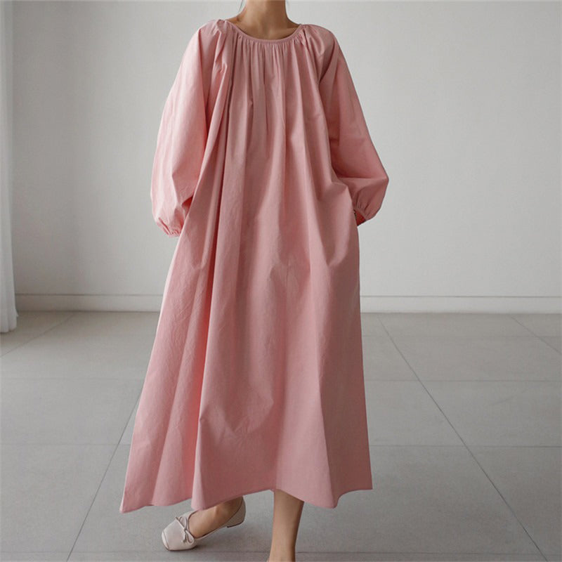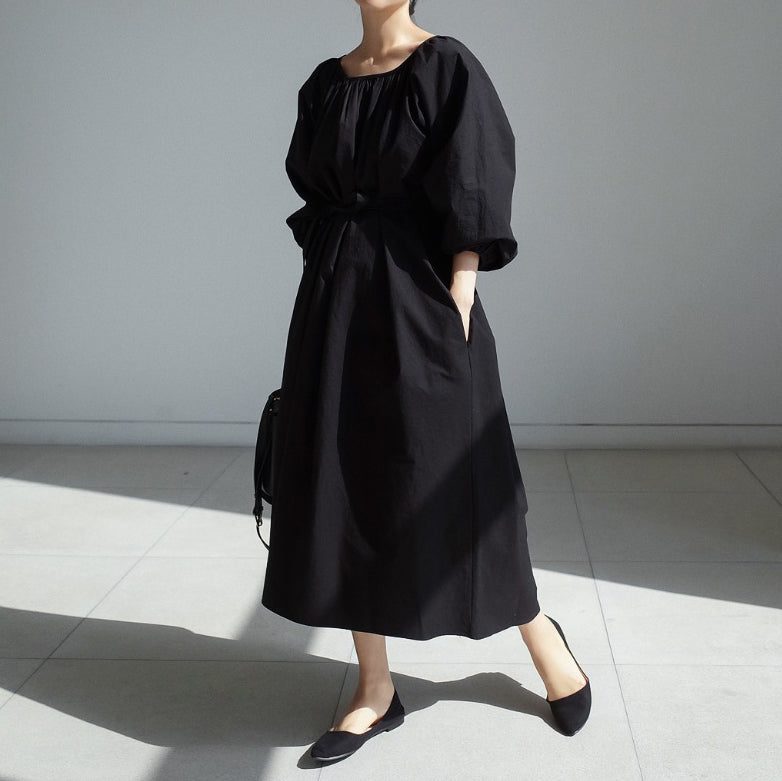 【商品名】【ワンピース】ゆったり 大きいサイズ  リボン ランタンスリーブ 長袖ワンピース