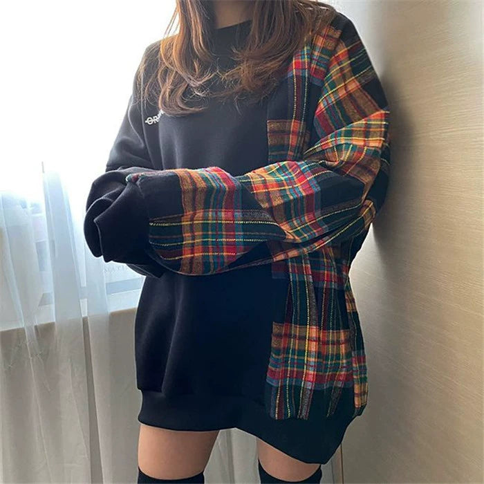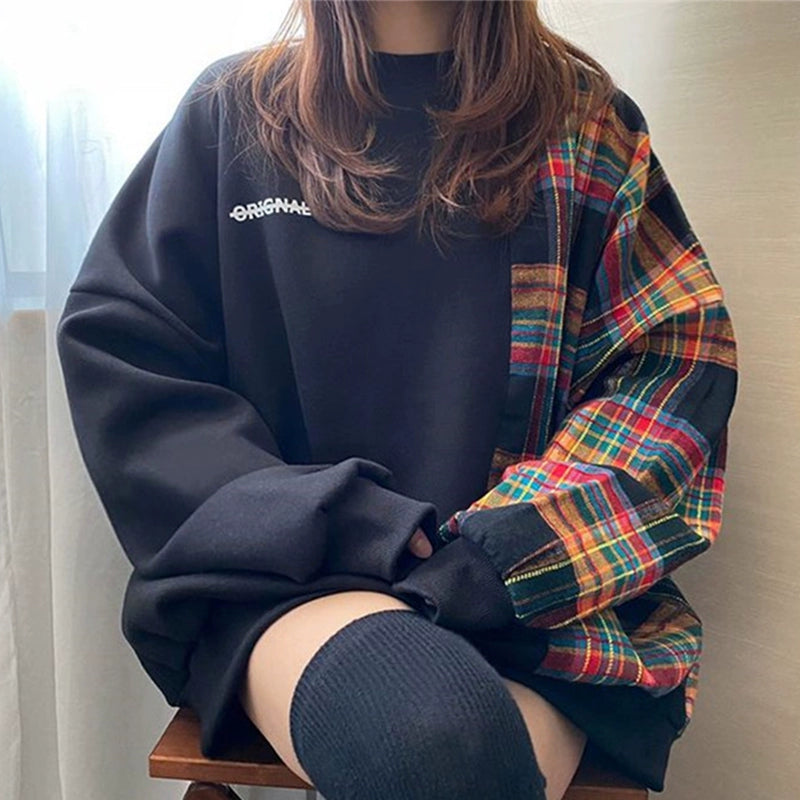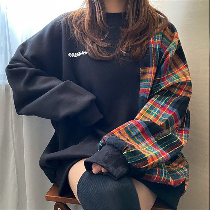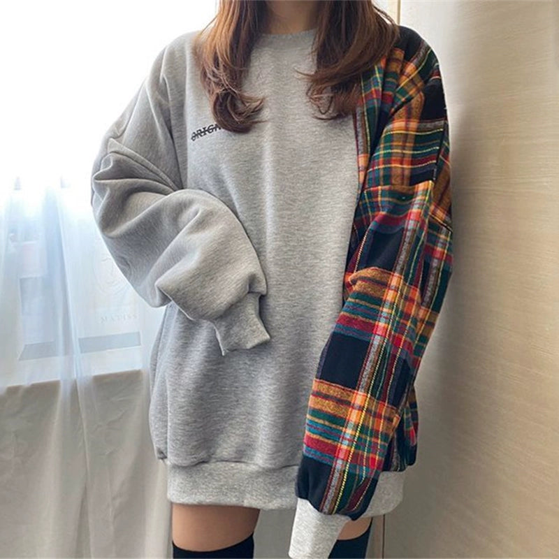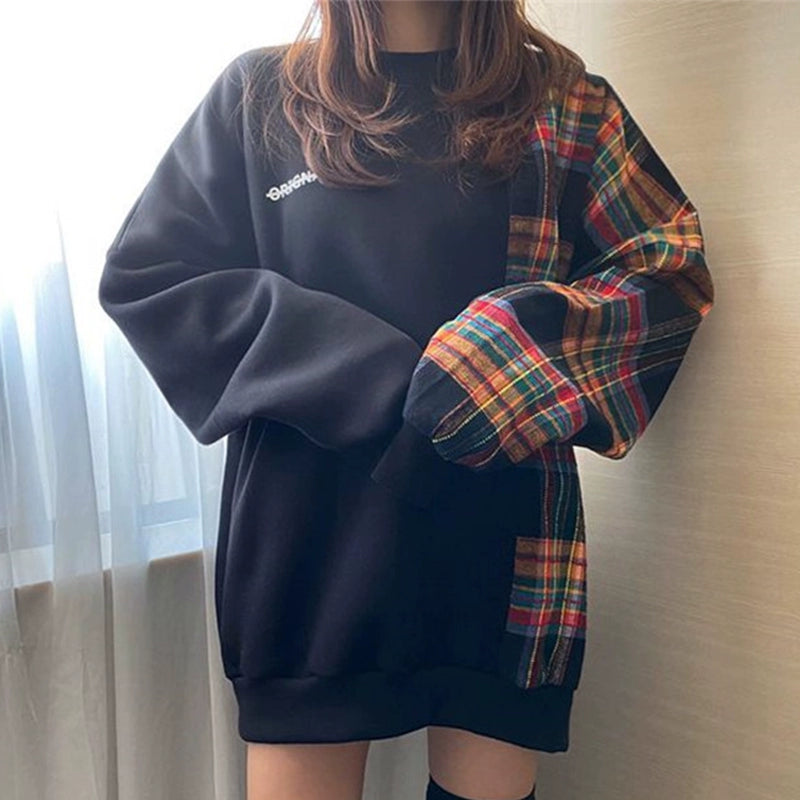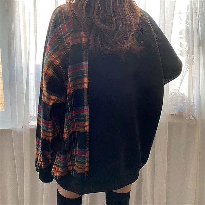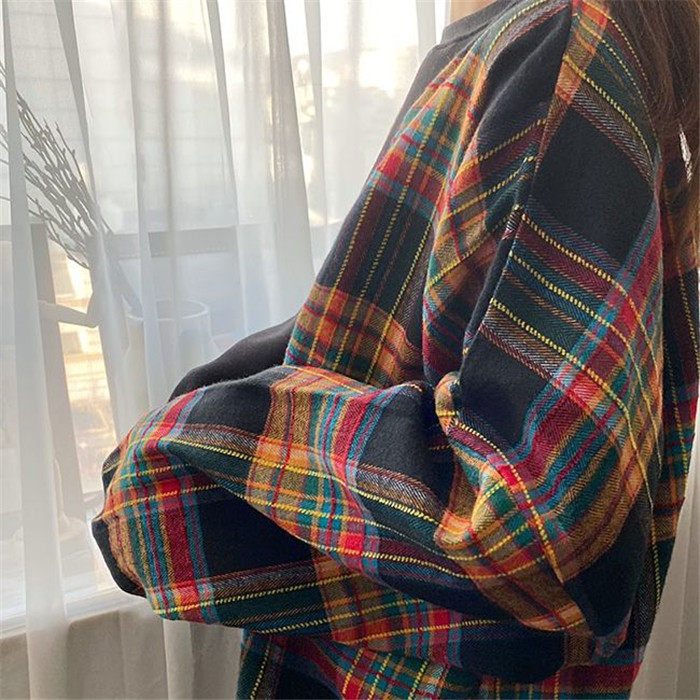 【トップス】秋冬 ラウンドネック チェック柄 パフスリーブ プルオーバー パーカー