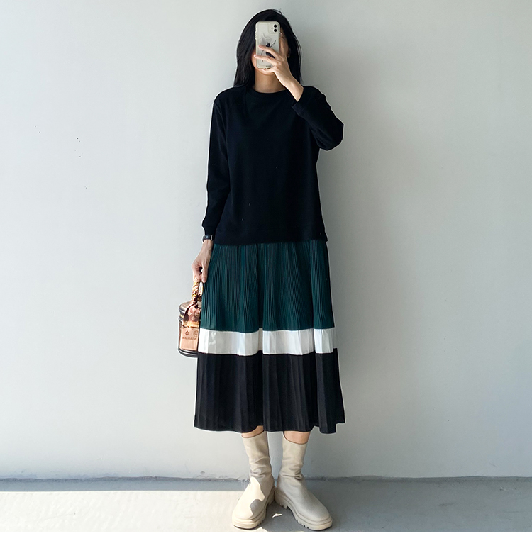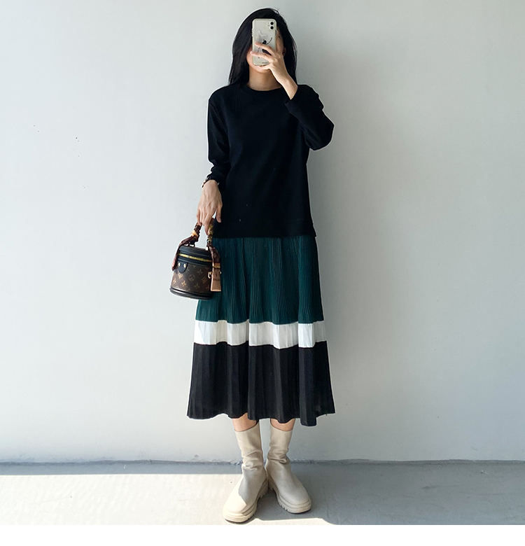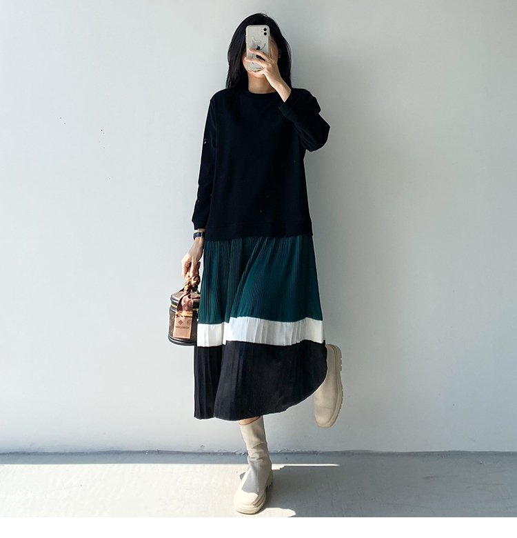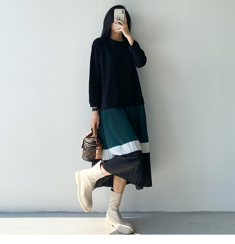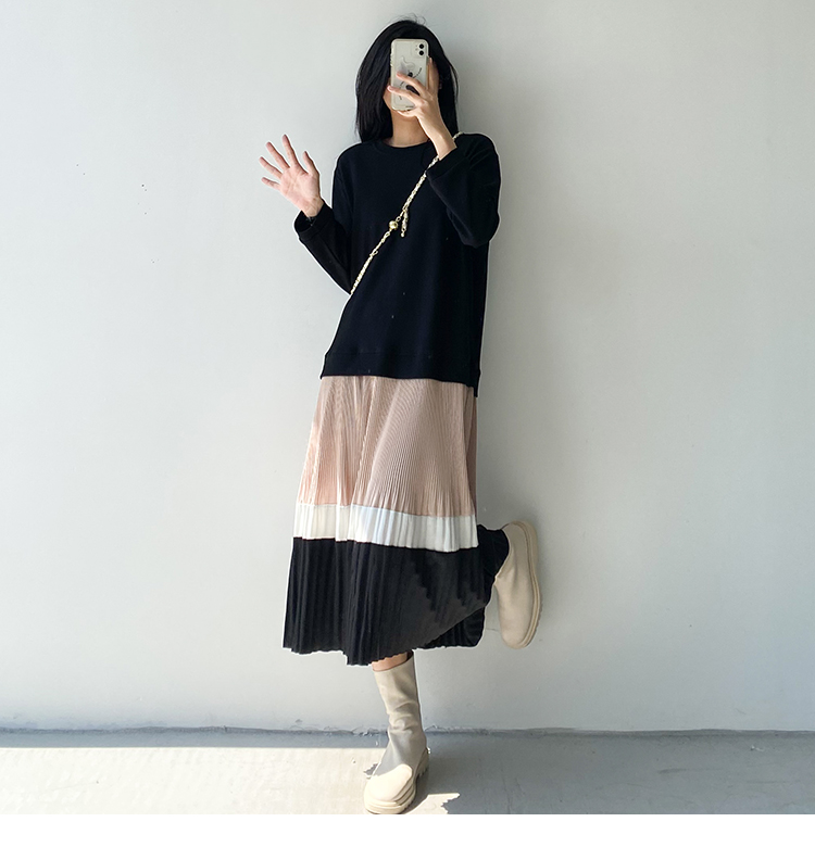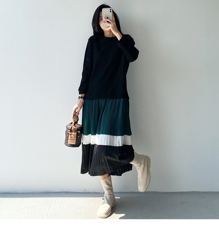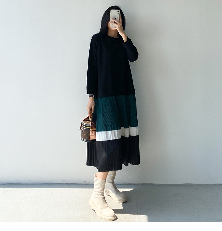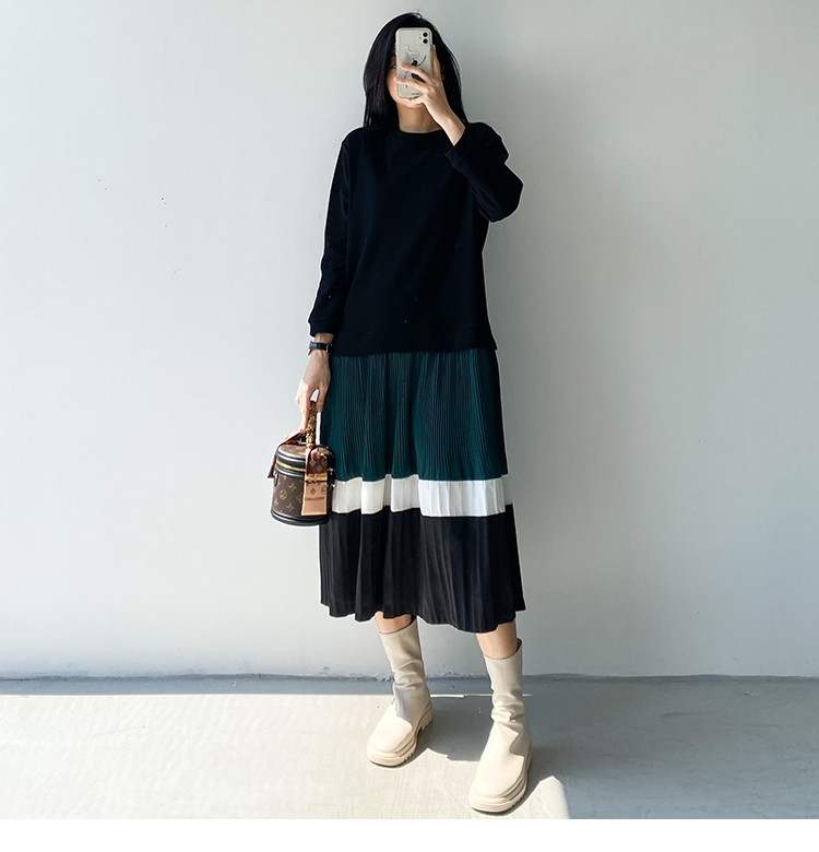 【ワンピース】春秋冬 フェイクツーピース 大きいサイズ プリーツ 長袖ワンピース