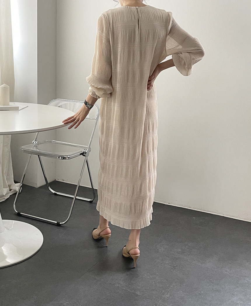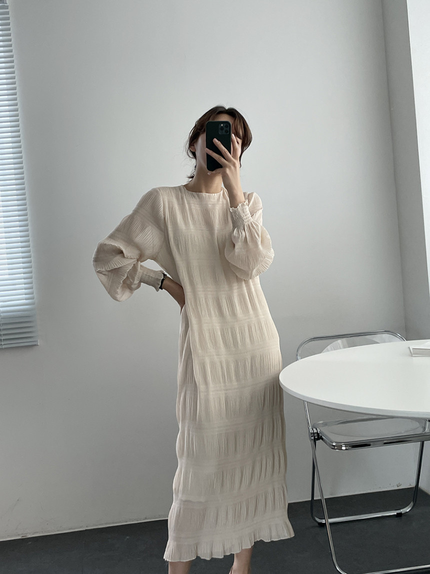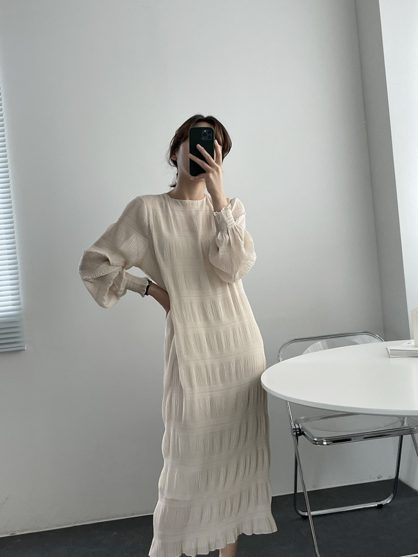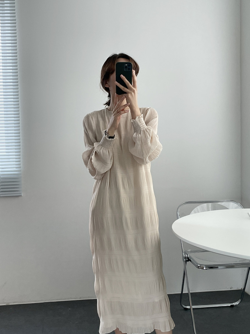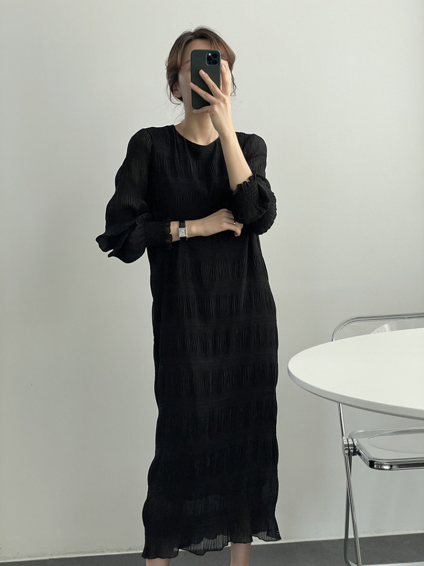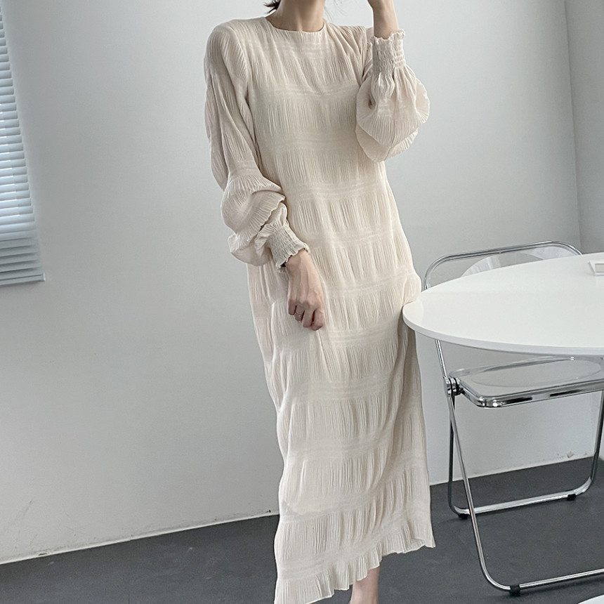 【ワンピース】春秋 プリーツ ランタン袖 シフォン ラウンドネック 気質 ドレス 長袖ワンピース