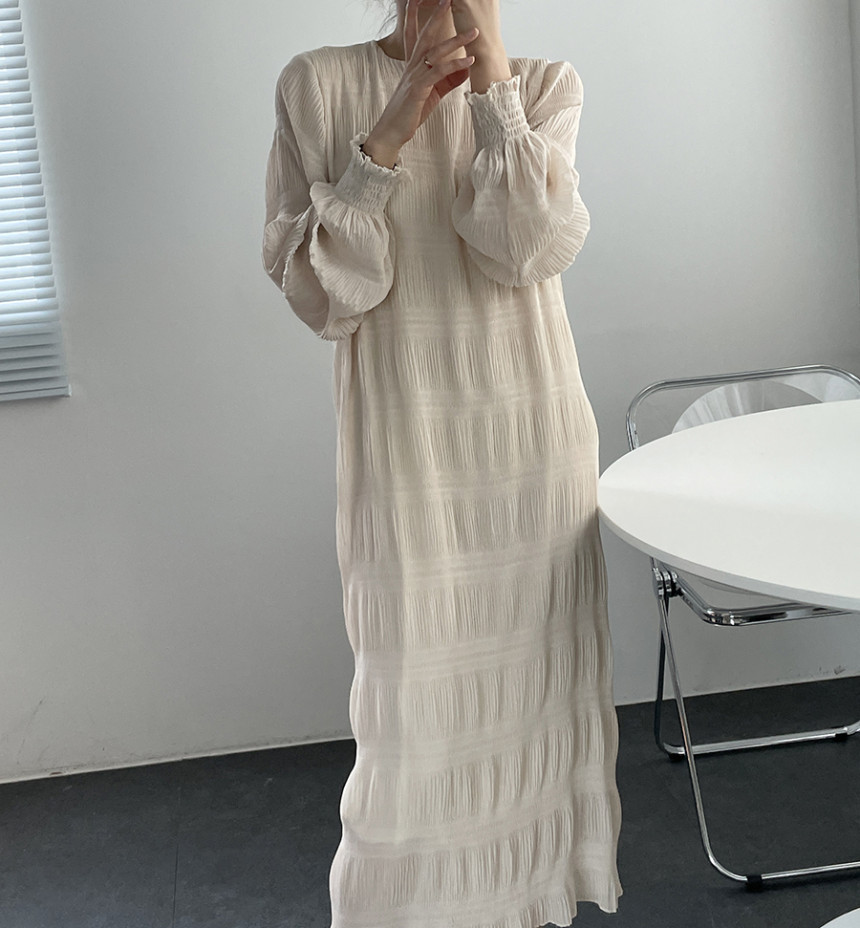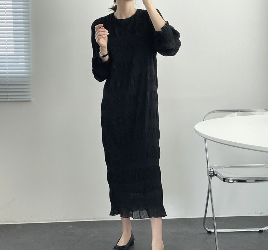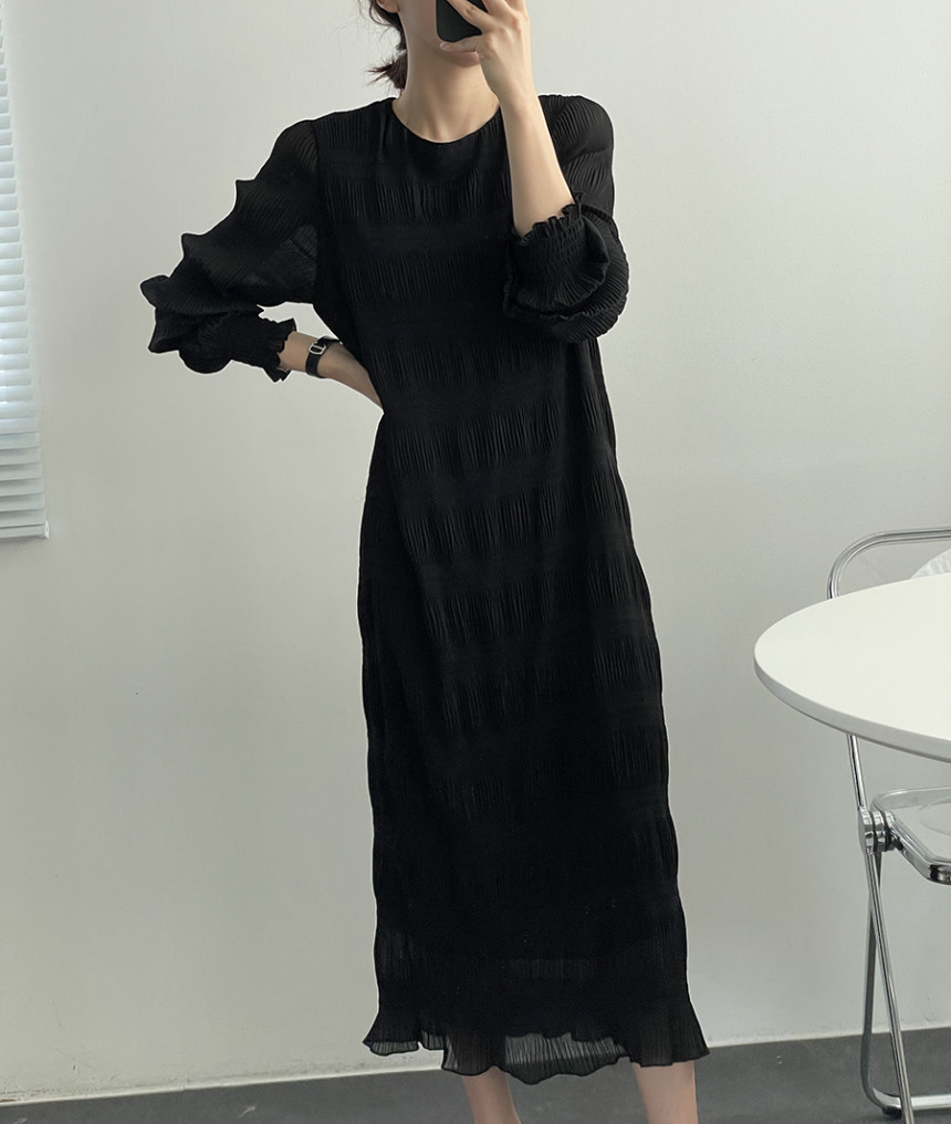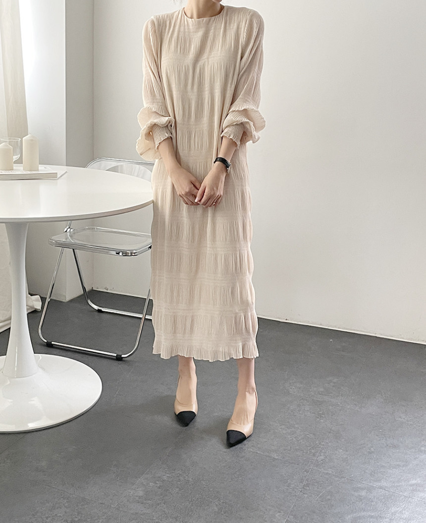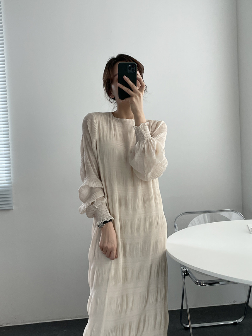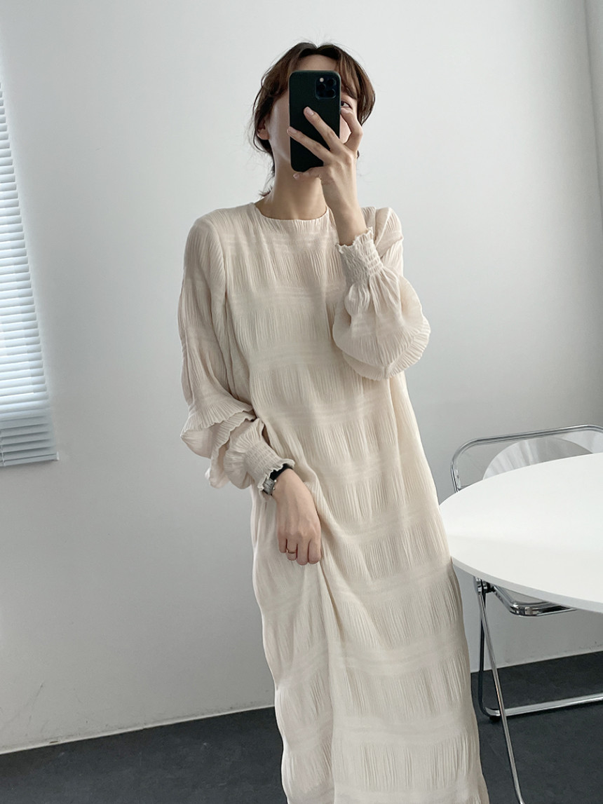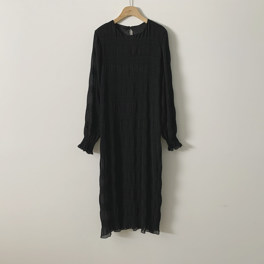 【ワンピース】春秋 プリーツ ランタン袖 シフォン ラウンドネック 気質 ドレス 長袖ワンピース