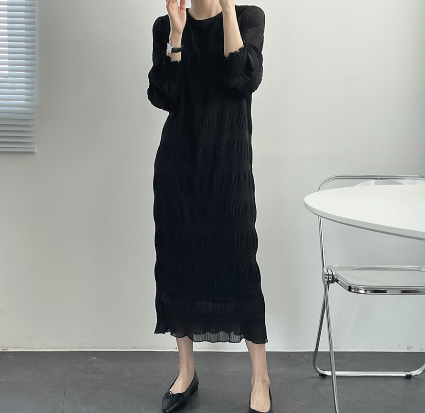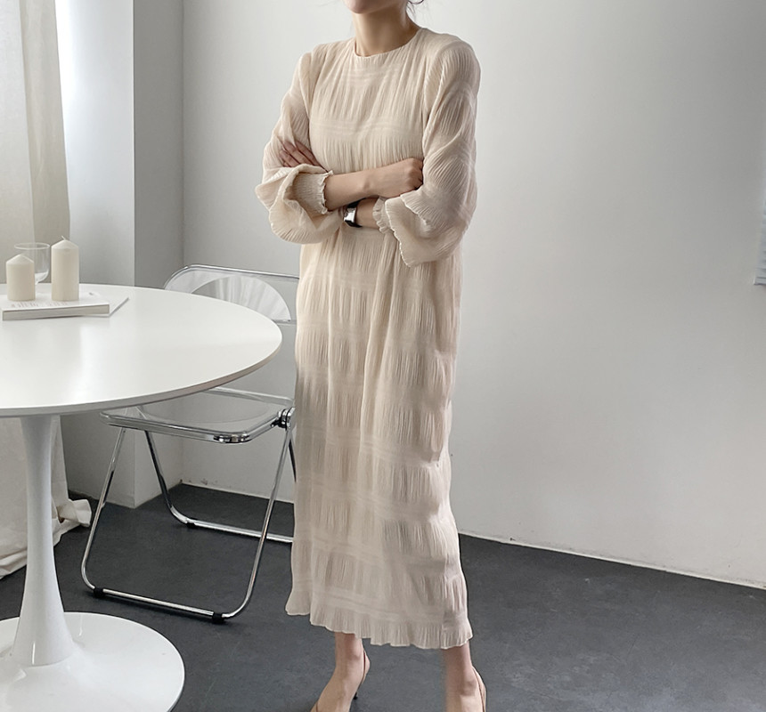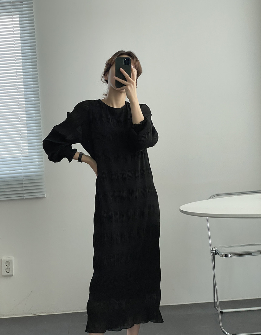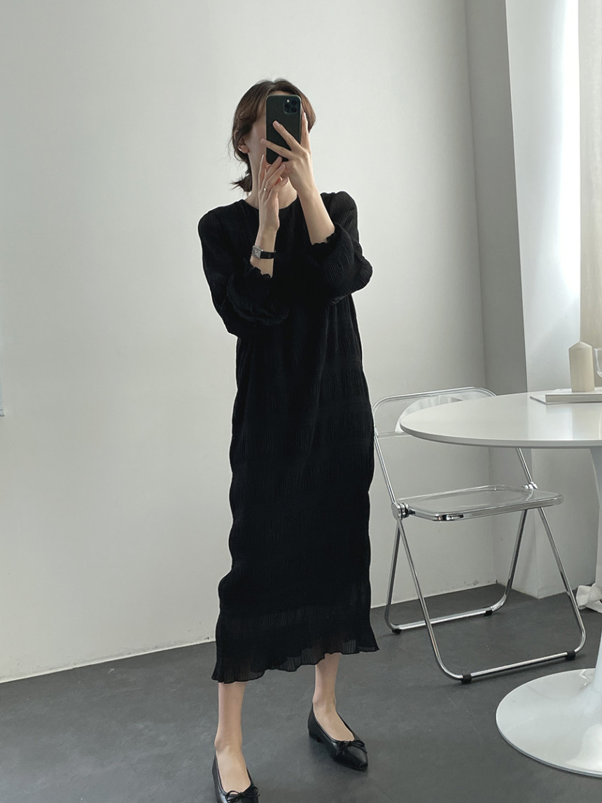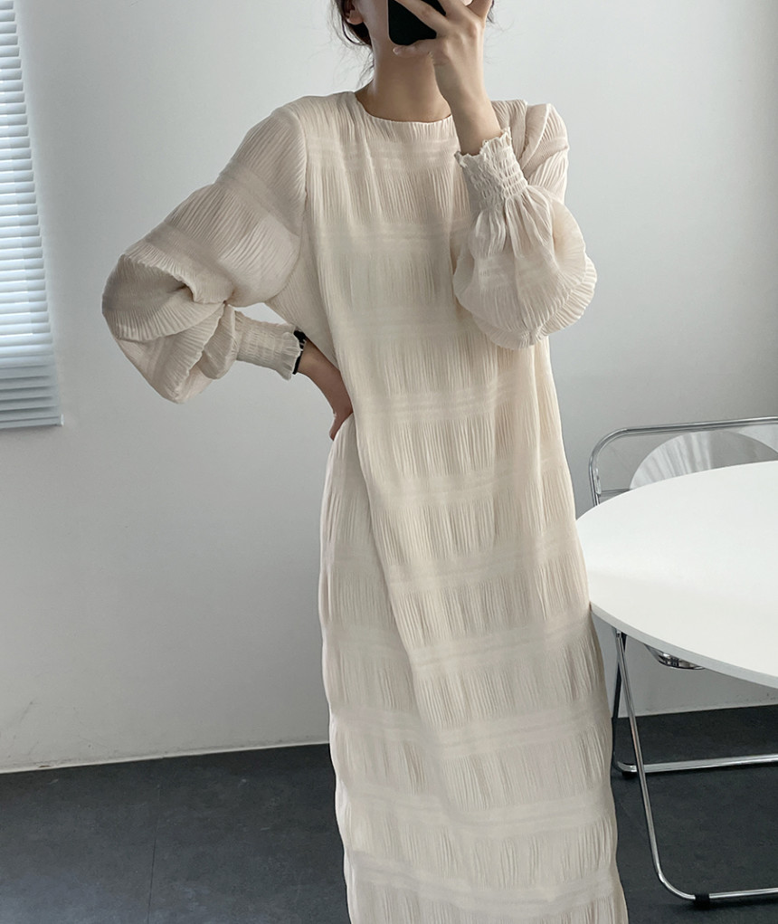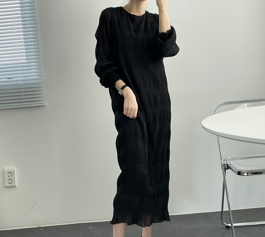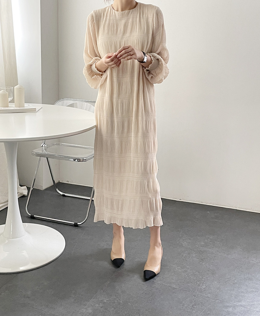 【ワンピース】春秋 プリーツ ランタン袖 シフォン ラウンドネック 気質 ドレス 長袖ワンピース
