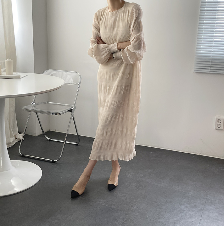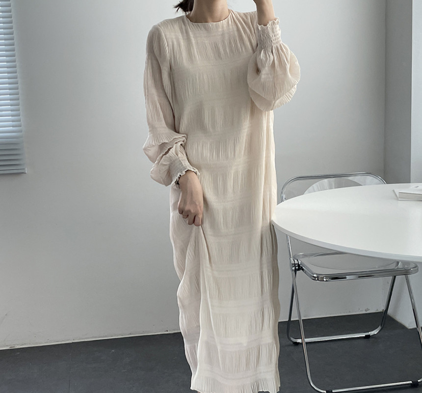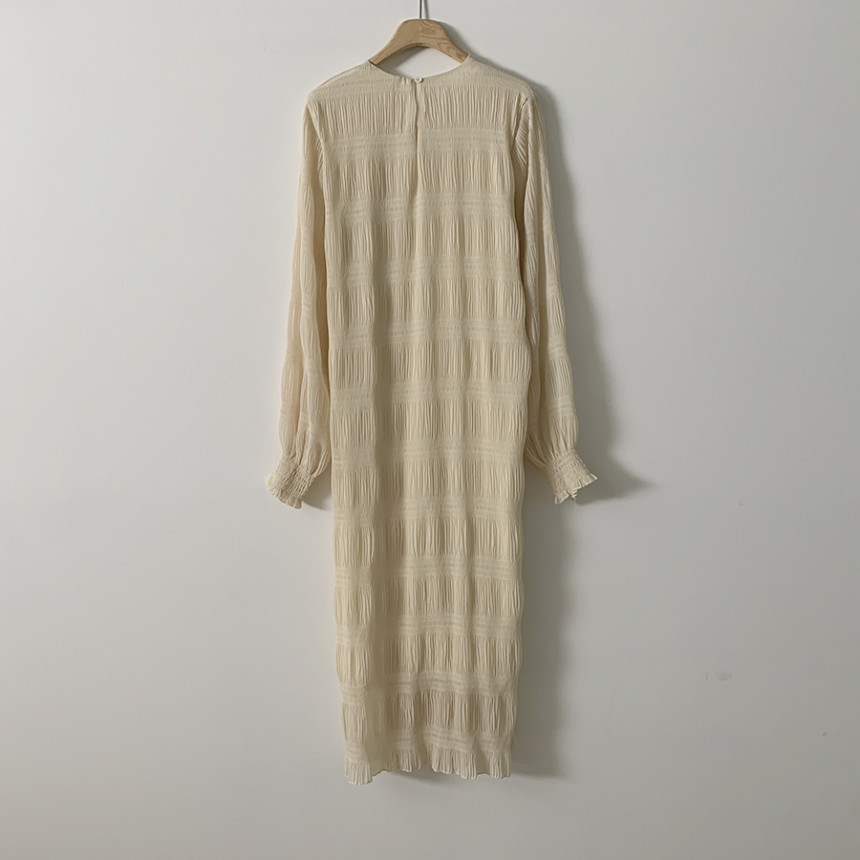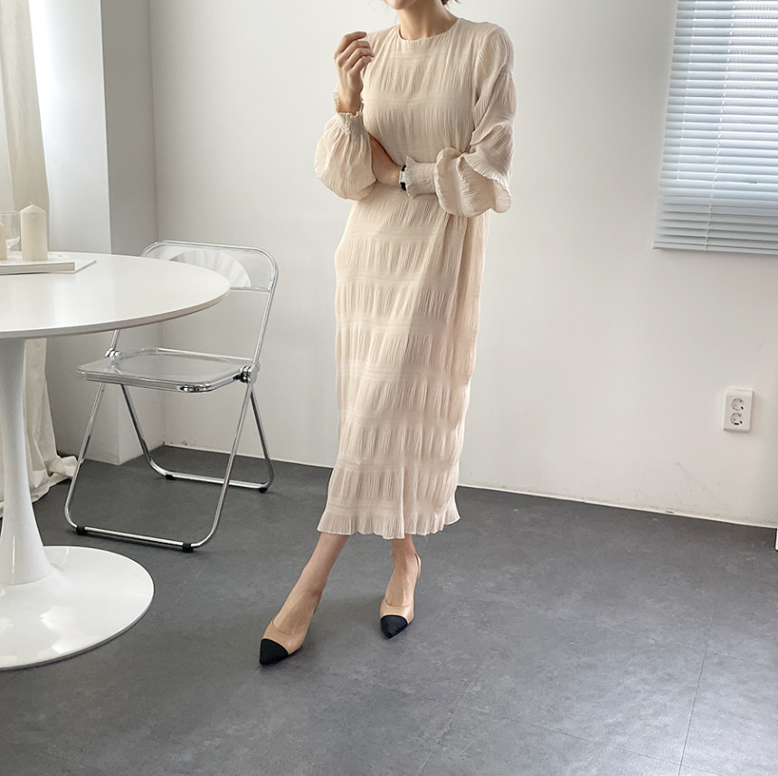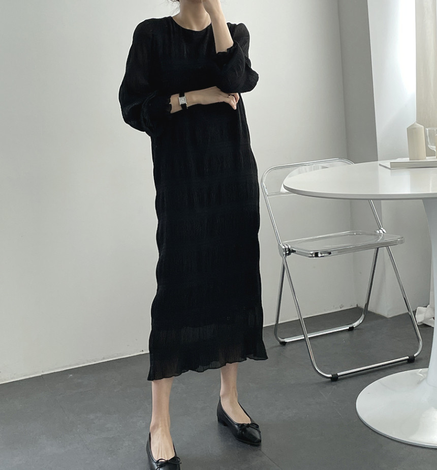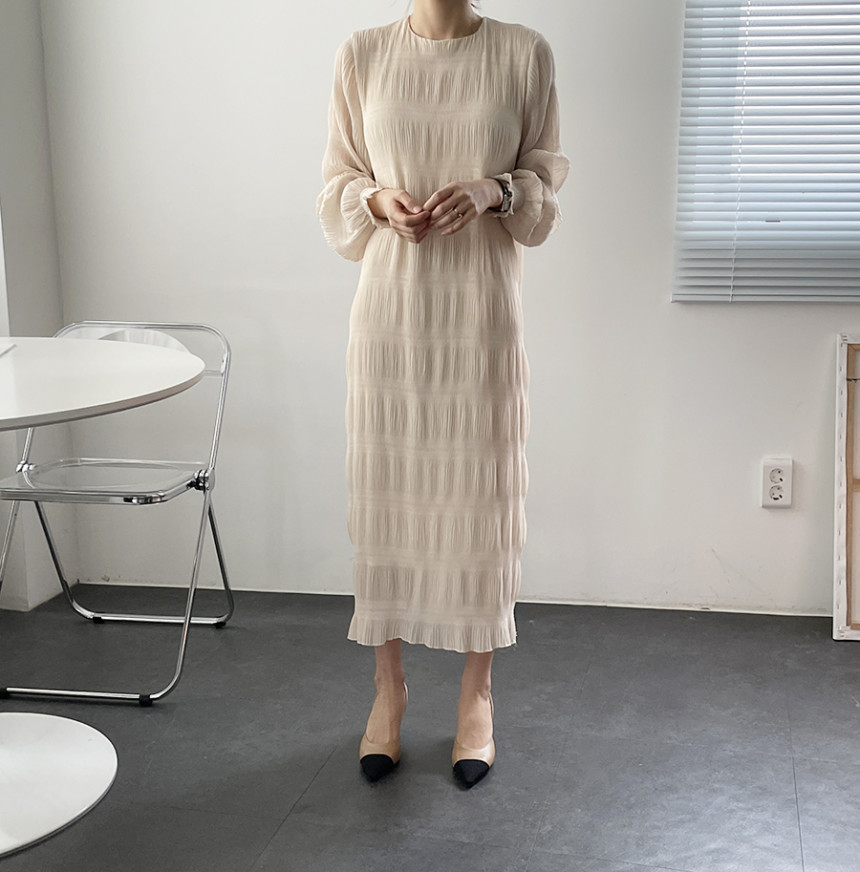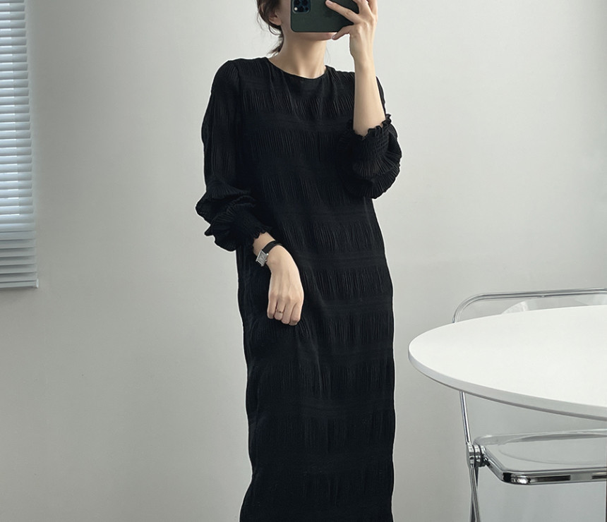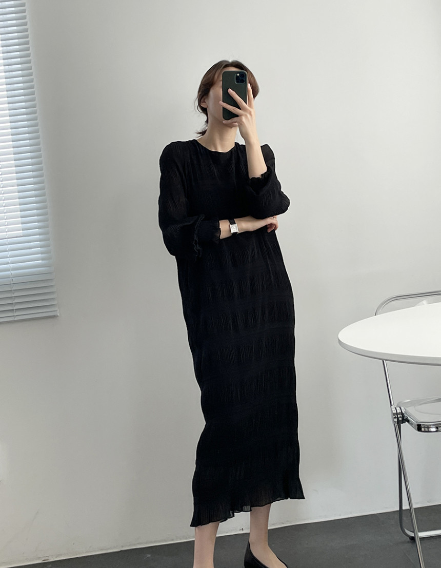 【ワンピース】春秋 プリーツ ランタン袖 シフォン ラウンドネック 気質 ドレス 長袖ワンピース