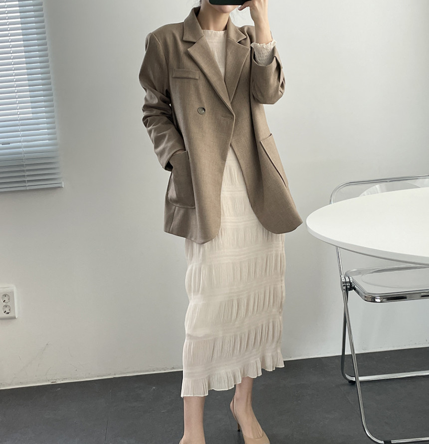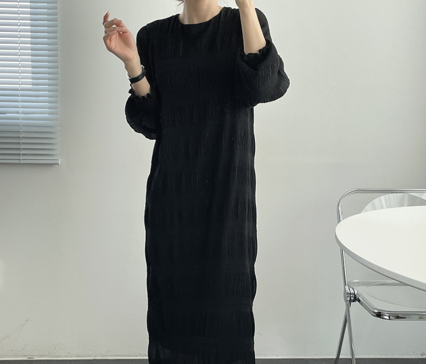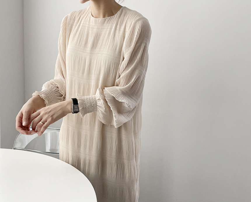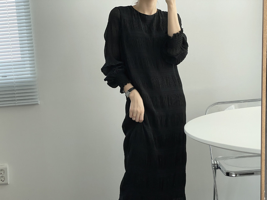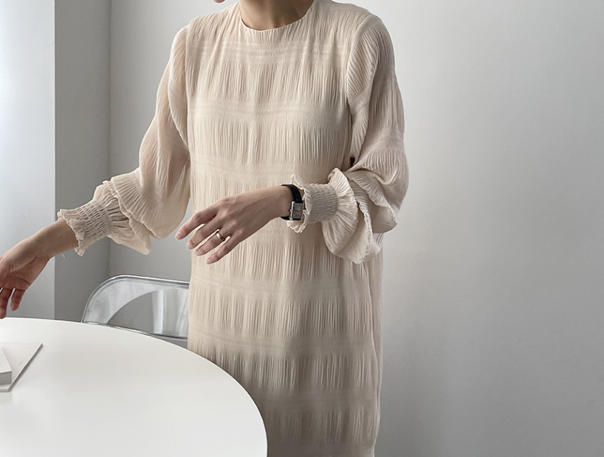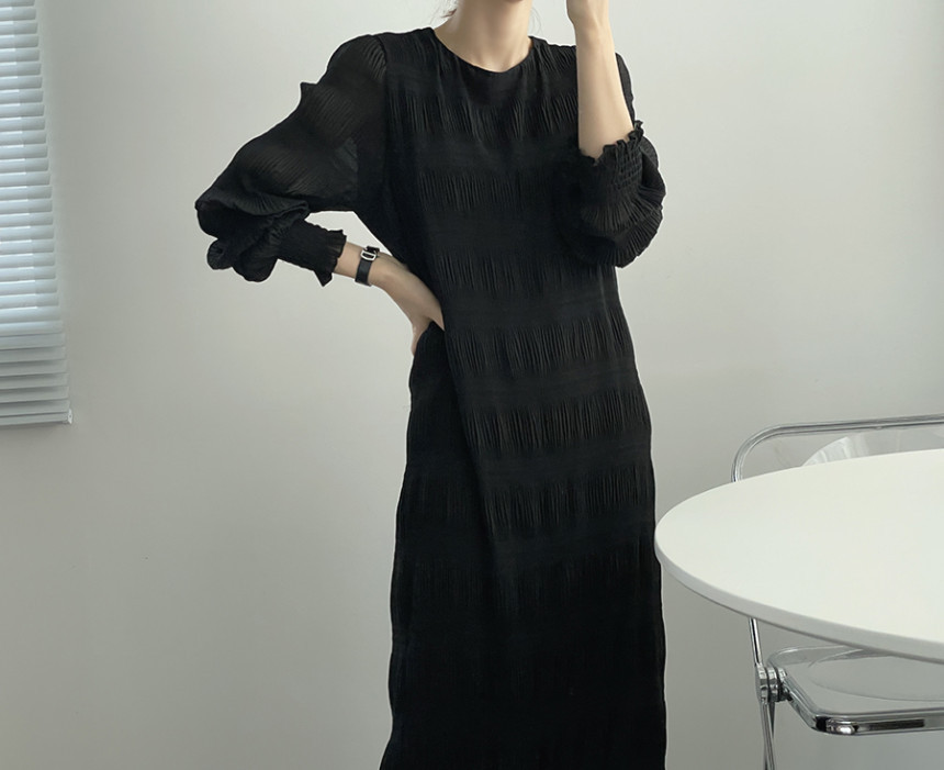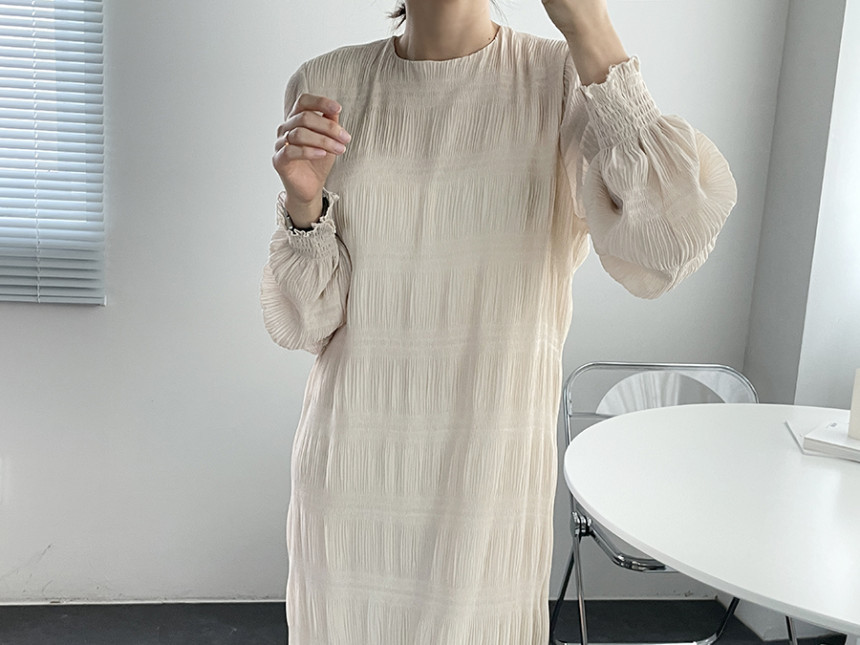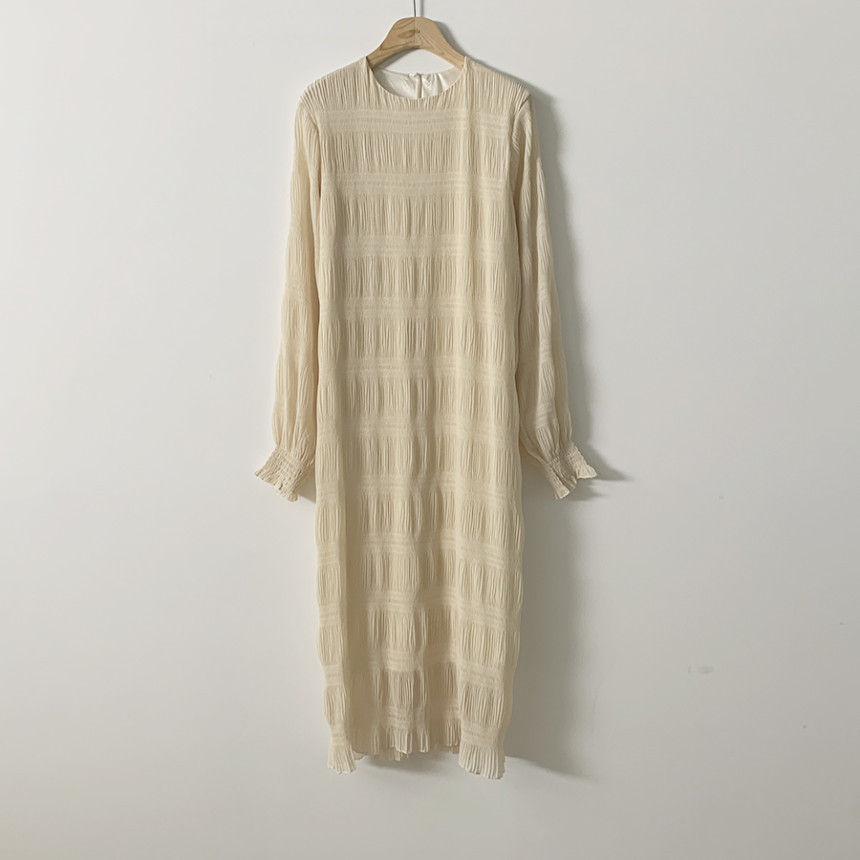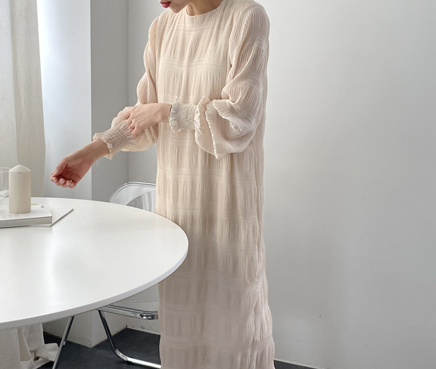 【ワンピース】春秋 プリーツ ランタン袖 シフォン ラウンドネック 気質 ドレス 長袖ワンピース