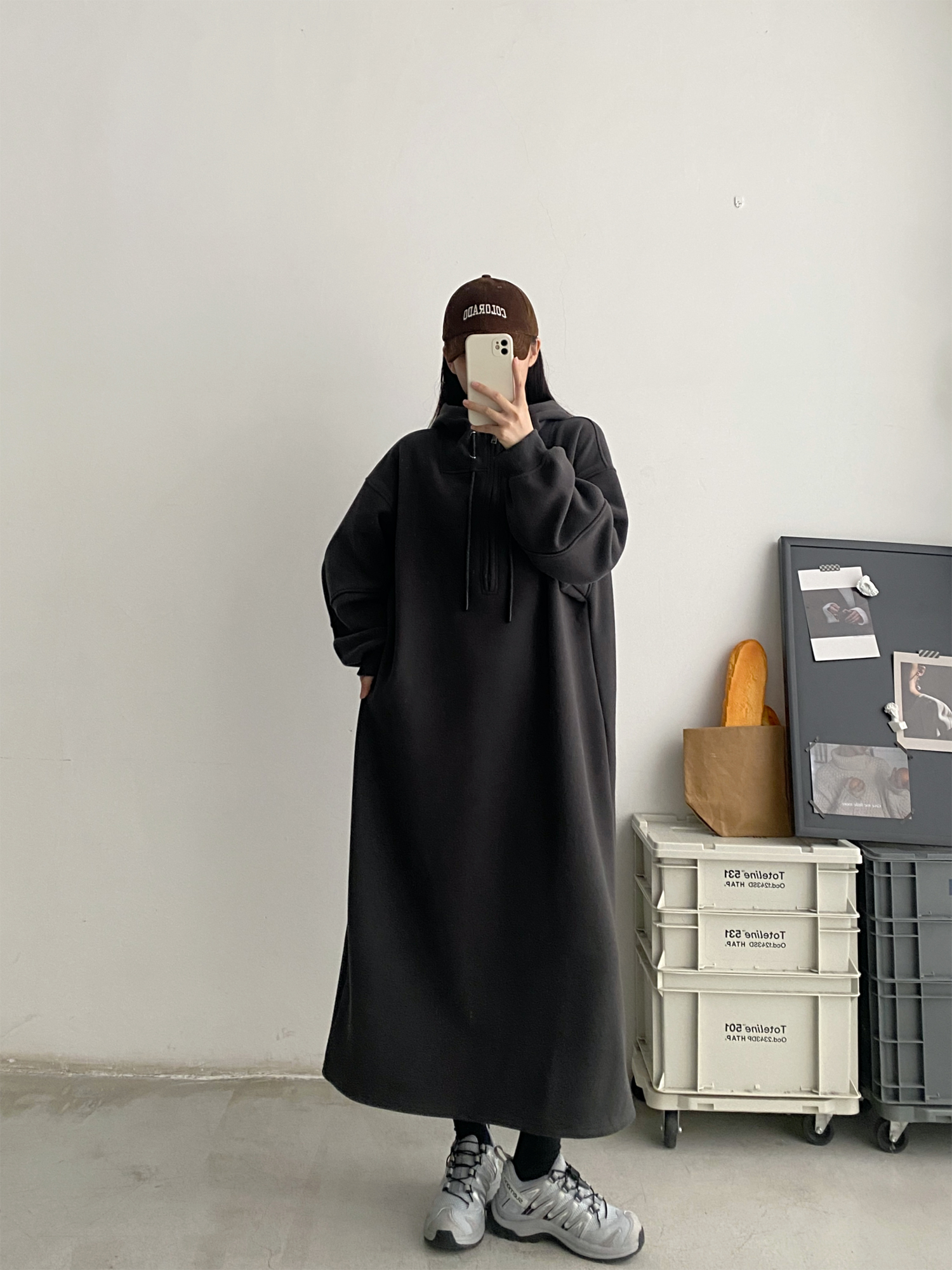 【商品名】【ワンピース】韓国風 ゆったり プラスサイズ 裏起毛 フード付き 長袖ワンピース