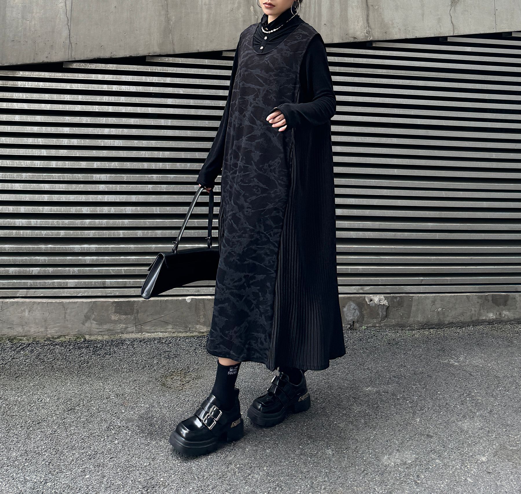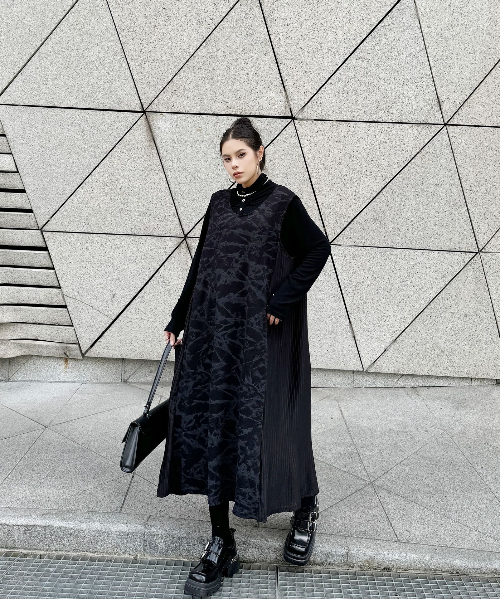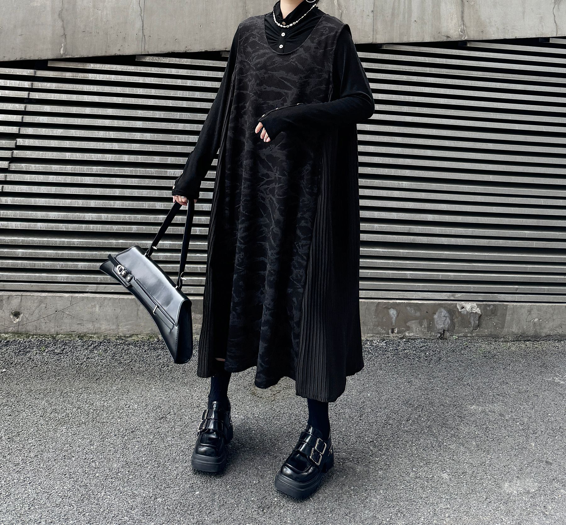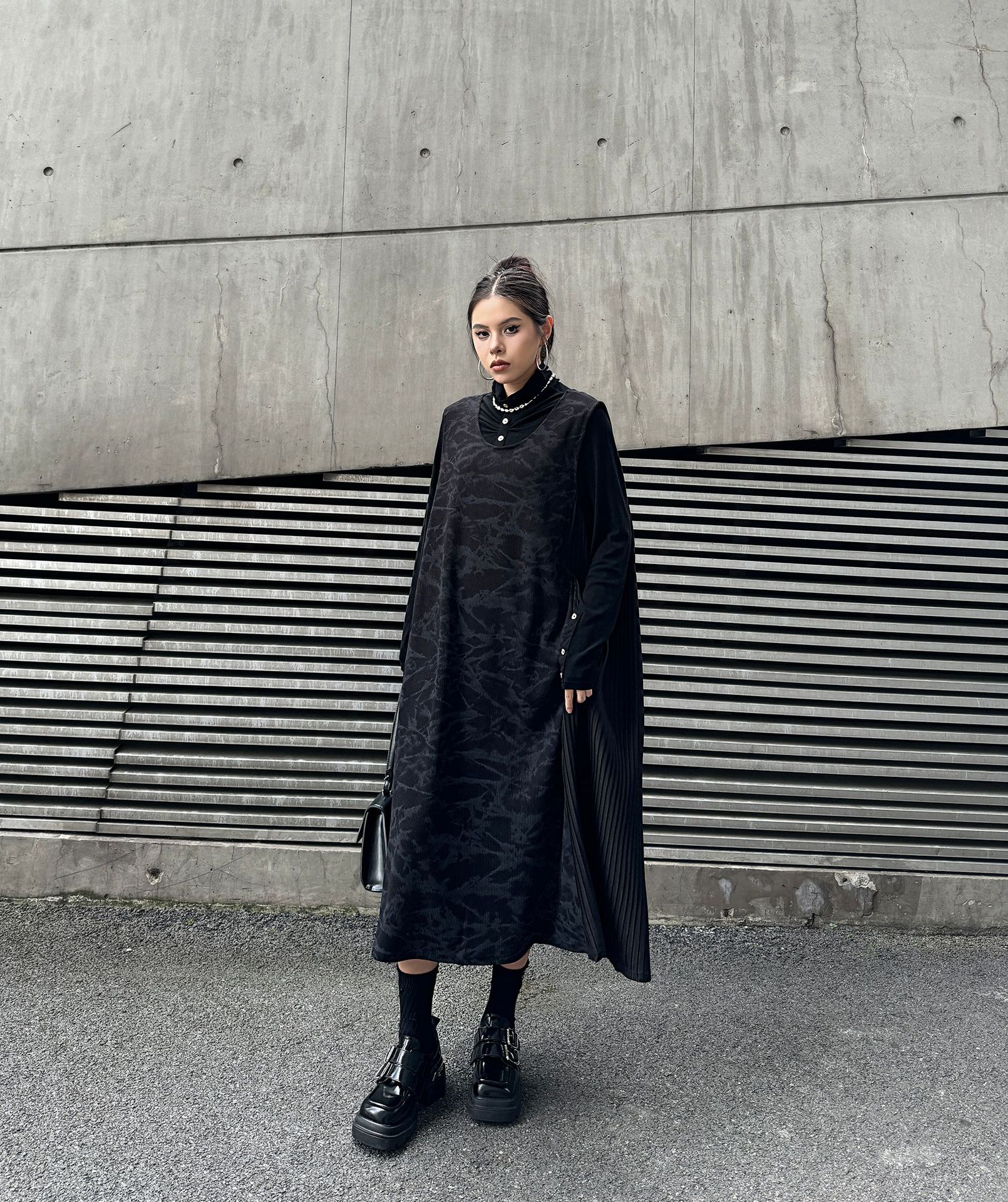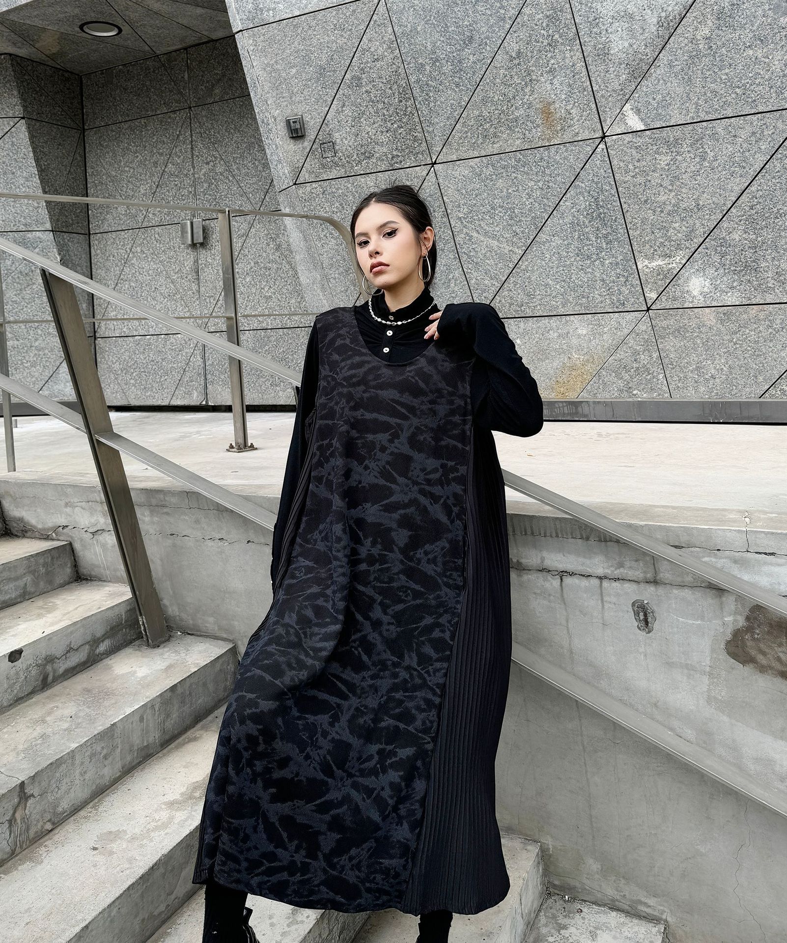 【ワンピース】春秋 プリーツノースリーブ V ネック ドレス 着痩せ ワンピース【AHシリーズ】