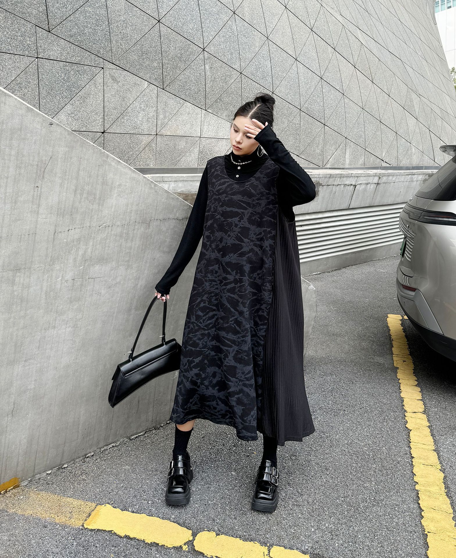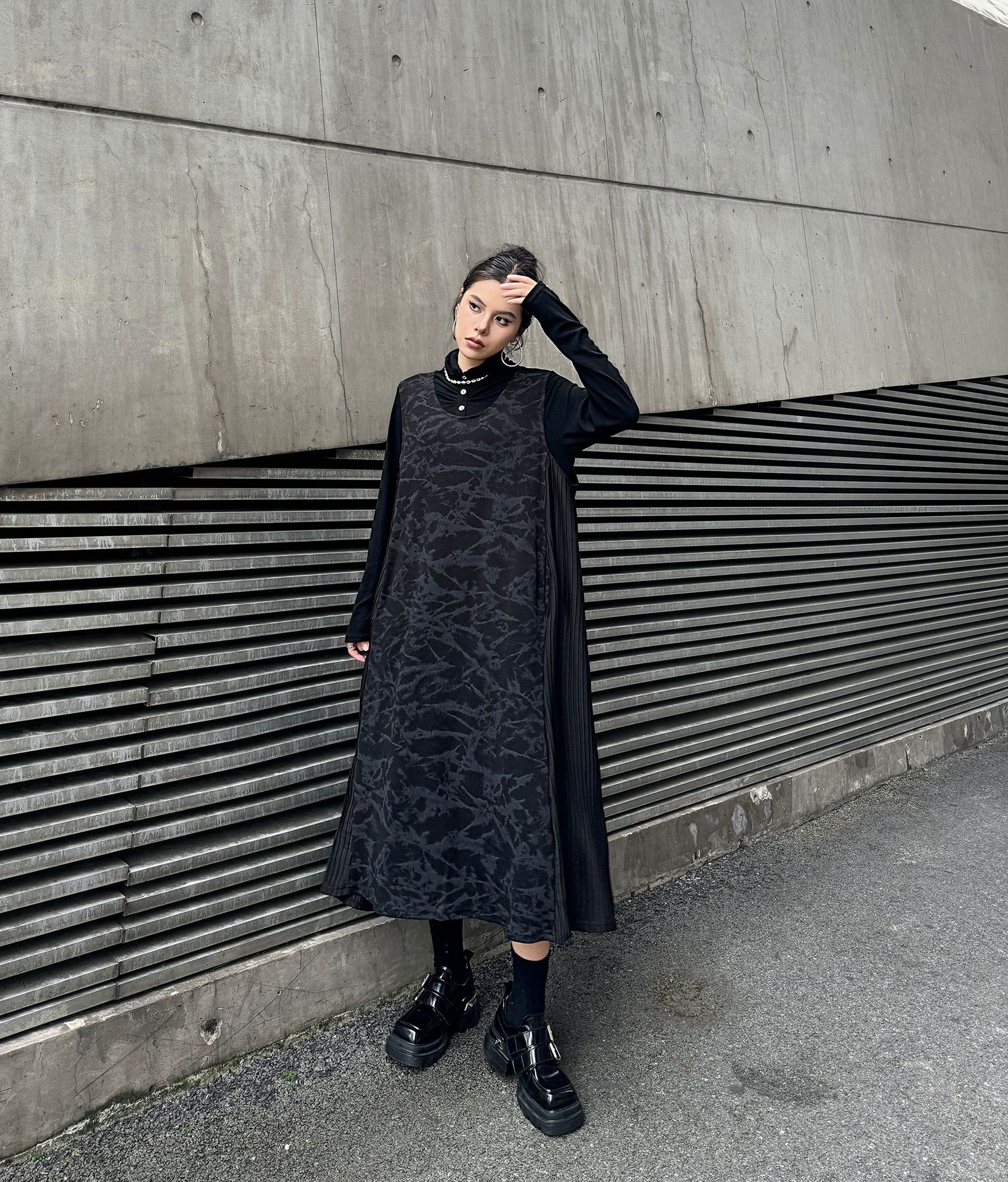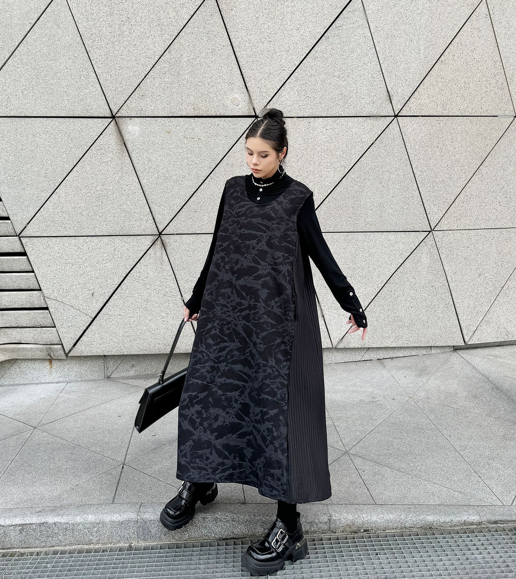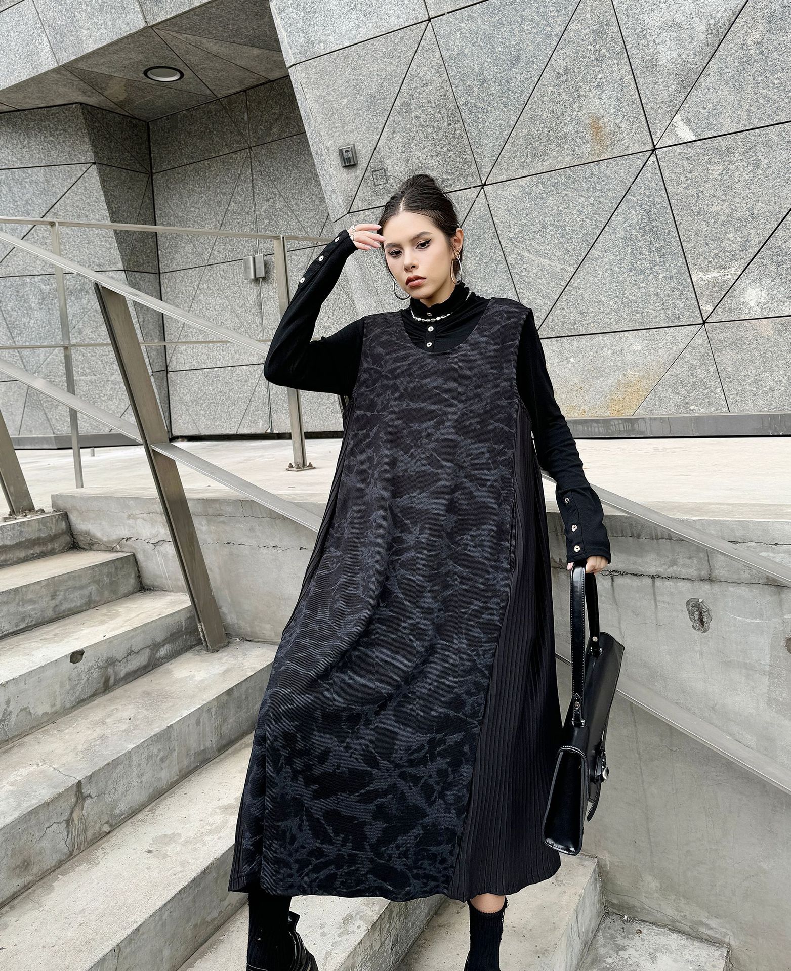 【ワンピース】春秋 プリーツノースリーブ V ネック ドレス 着痩せ ワンピース【AHシリーズ】