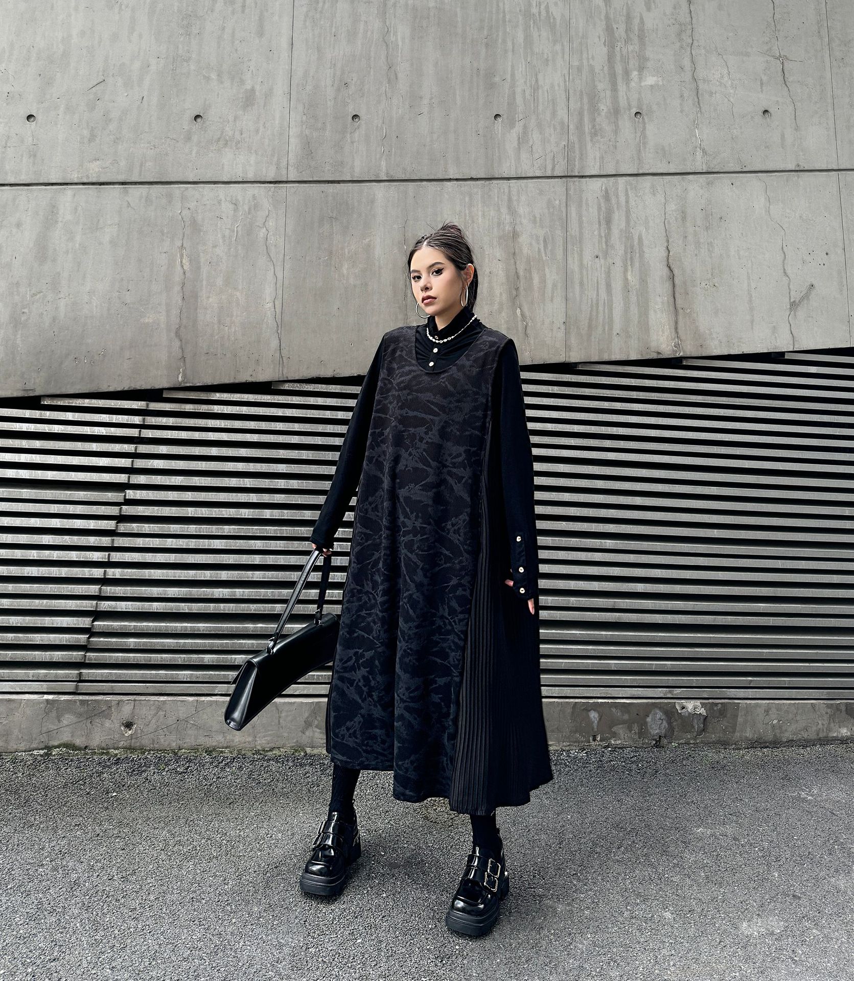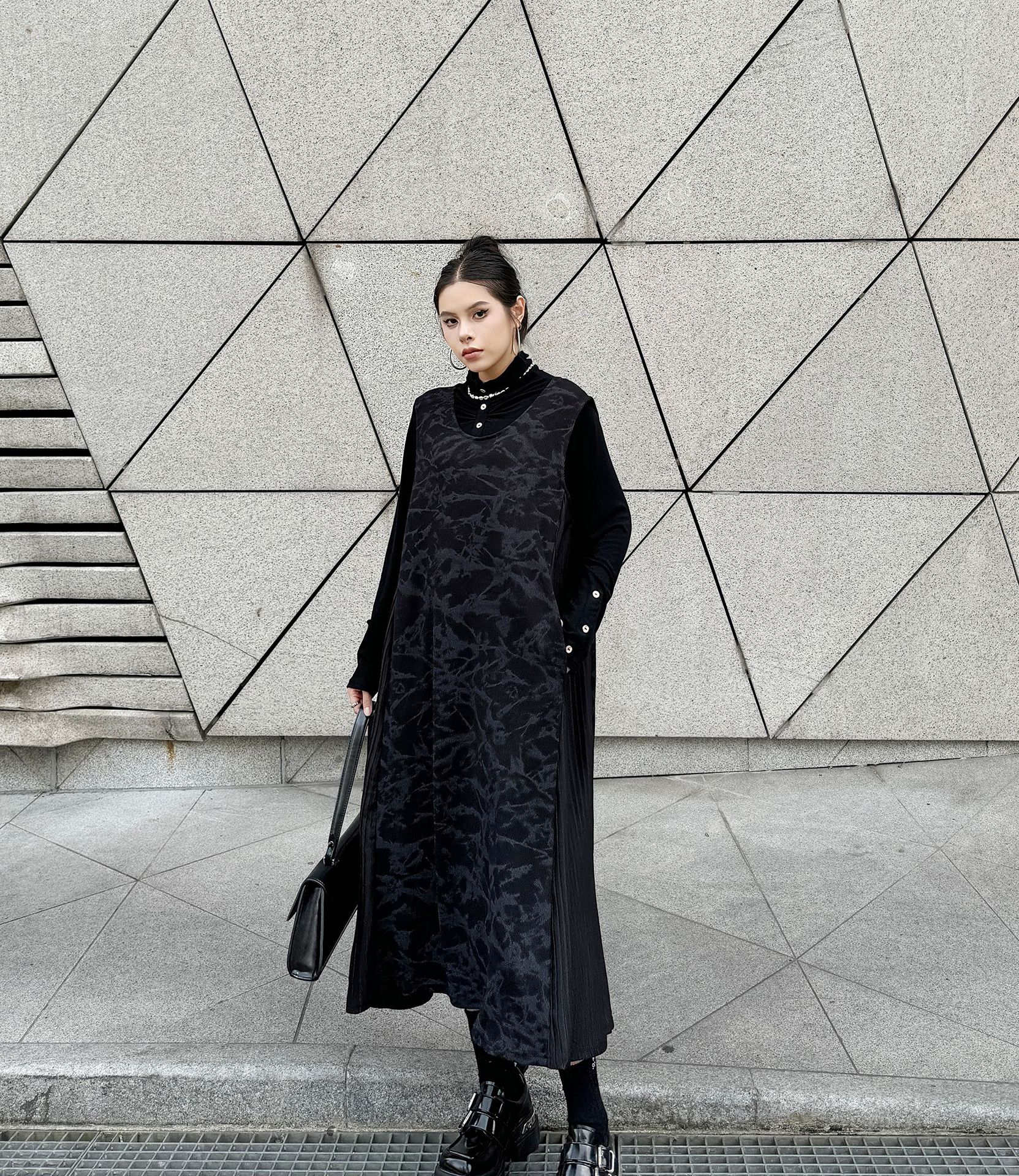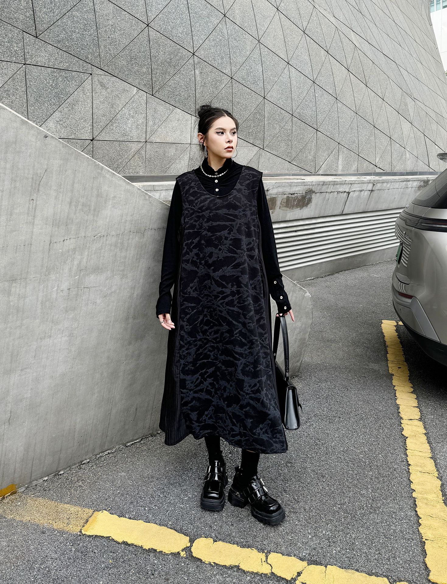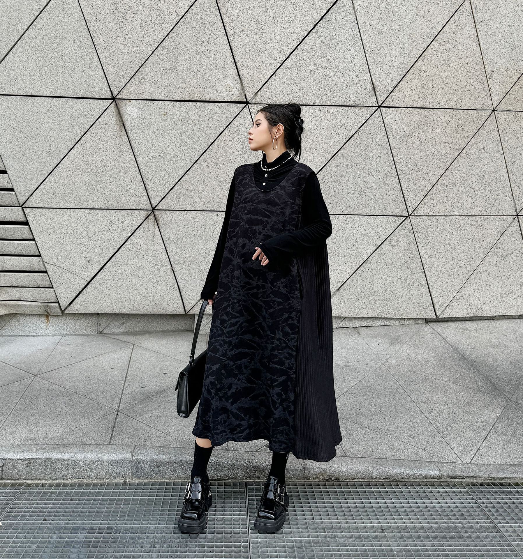 【ワンピース】春秋 プリーツノースリーブ V ネック ドレス 着痩せ ワンピース【AHシリーズ】
