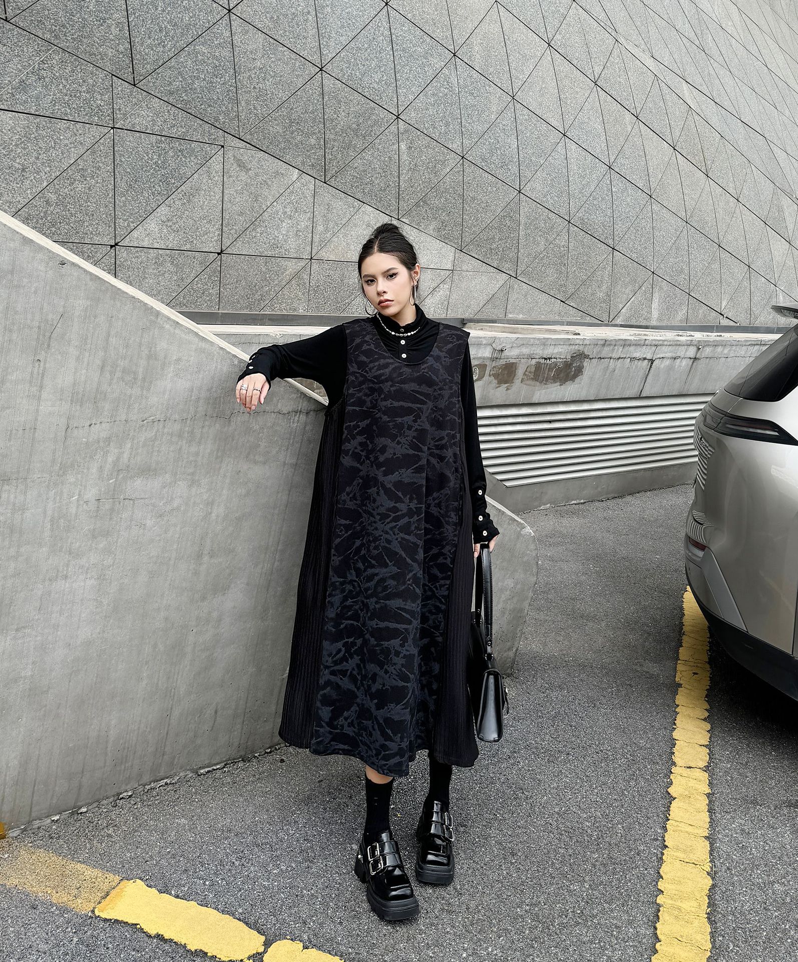 【ワンピース】韓国風 春秋新作 ゆったり大きめサイズ 体型カバー 花柄長袖ミディアムワンピース【SHシリーズ】