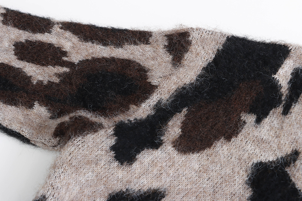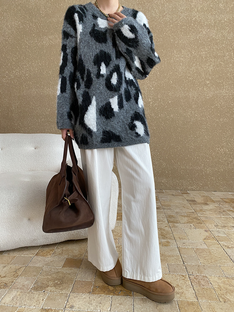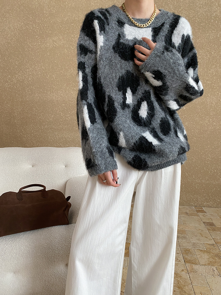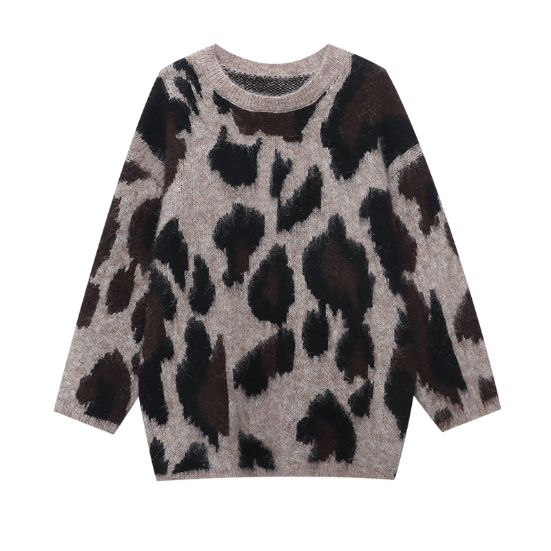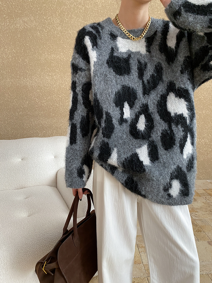 【トップス】レトロ 豹柄 猫 ゆったり ラウンドネック ニットセーター【FCシリーズ】