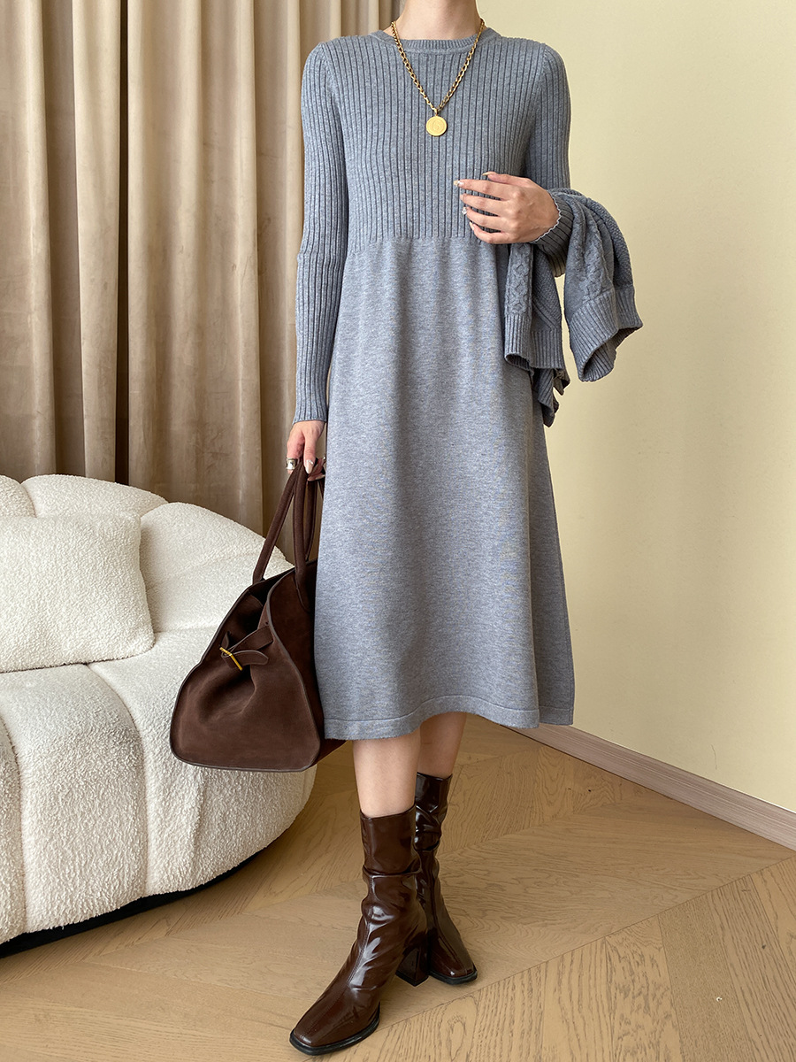 【ワンピース】細見え 日系 Vネック 無地 長袖ワンピース 切替デザイン ゆったり 気質ロング【JZシリーズ】【AHシリーズ】