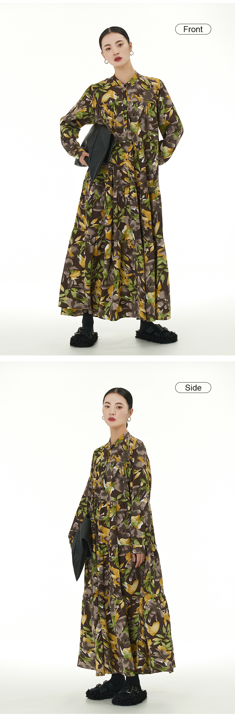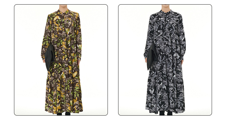 【ワンピース】韓国風 春秋新作 ゆったり大きめサイズ 体型カバー 花柄長袖ミディアムワンピース【SHシリーズ】