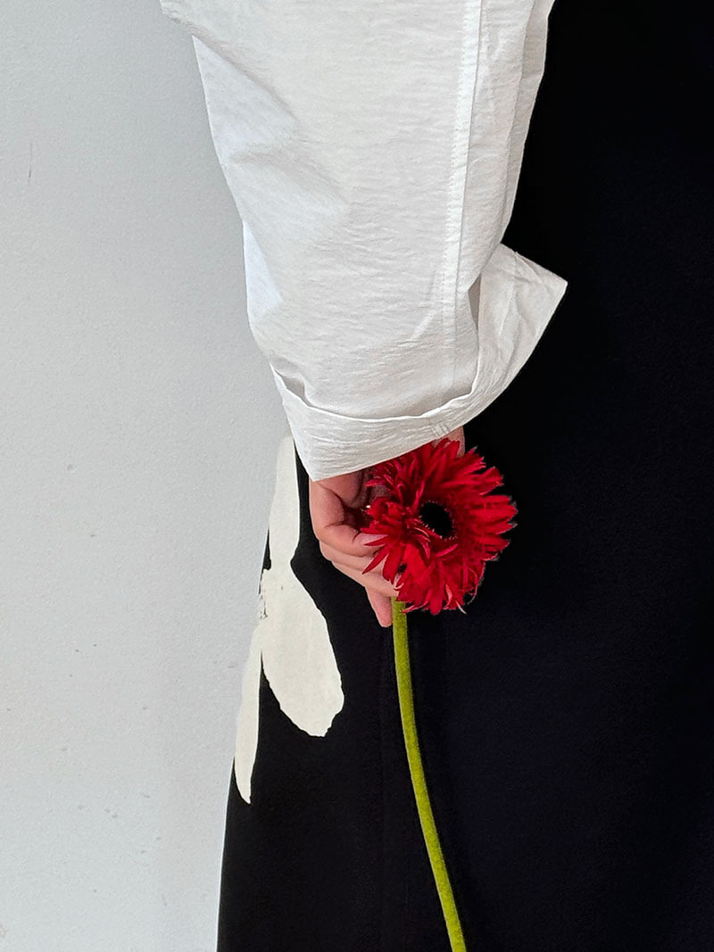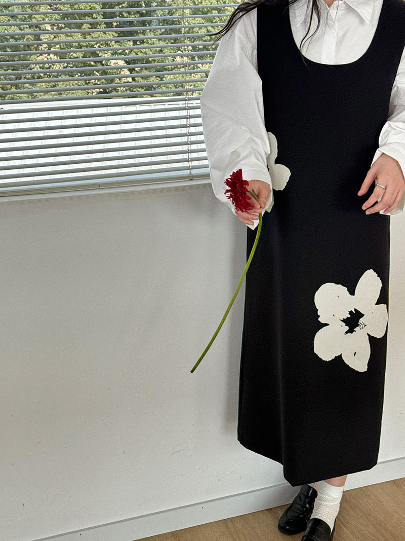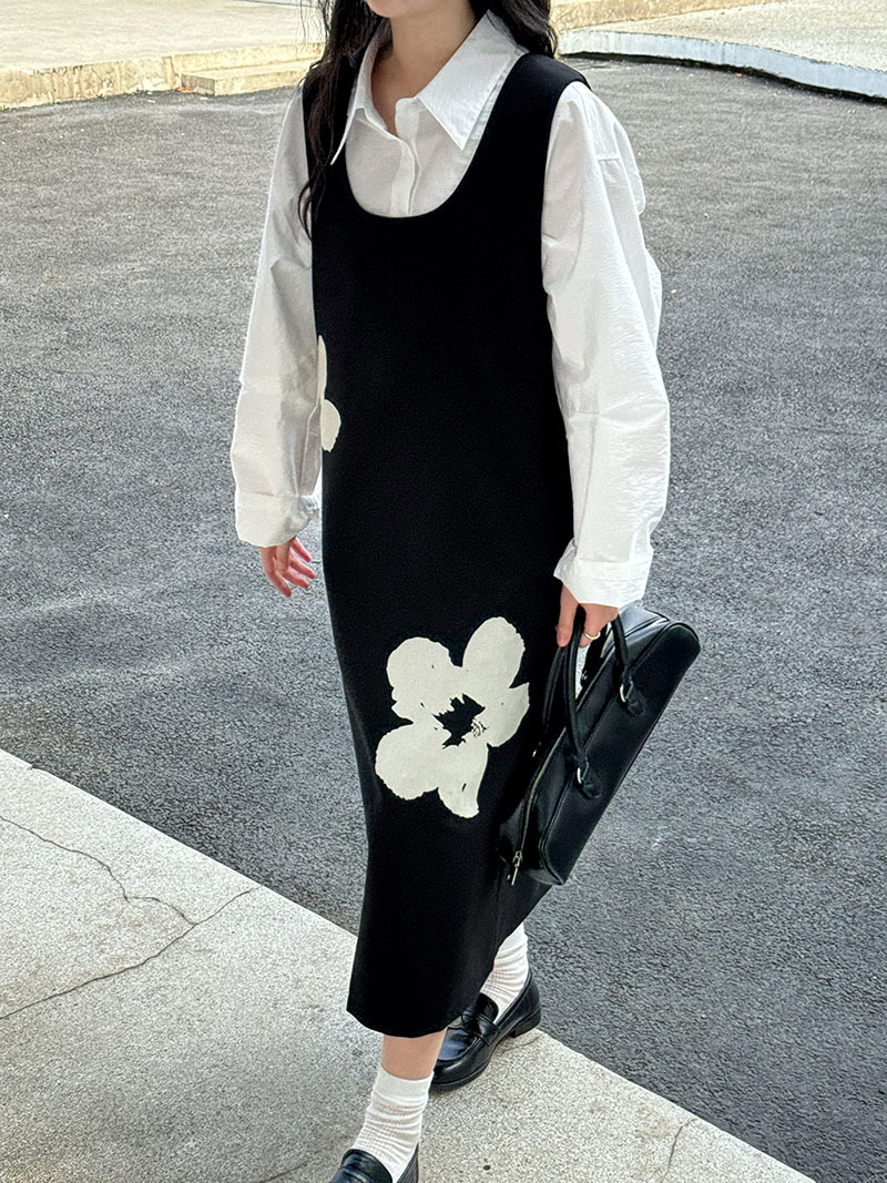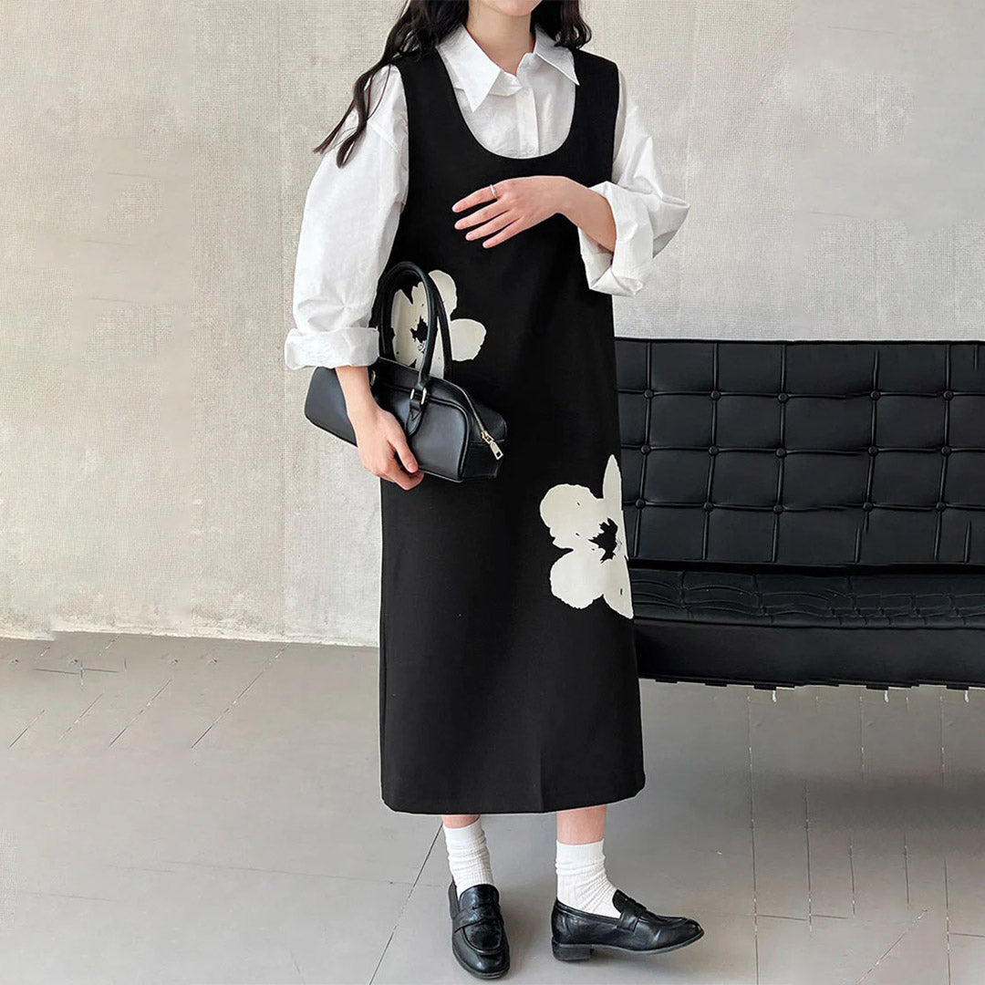 【ワンピース】韓国風 春秋新作 ゆったり大きめサイズ 体型カバー 花柄長袖ミディアムワンピース【SHシリーズ】