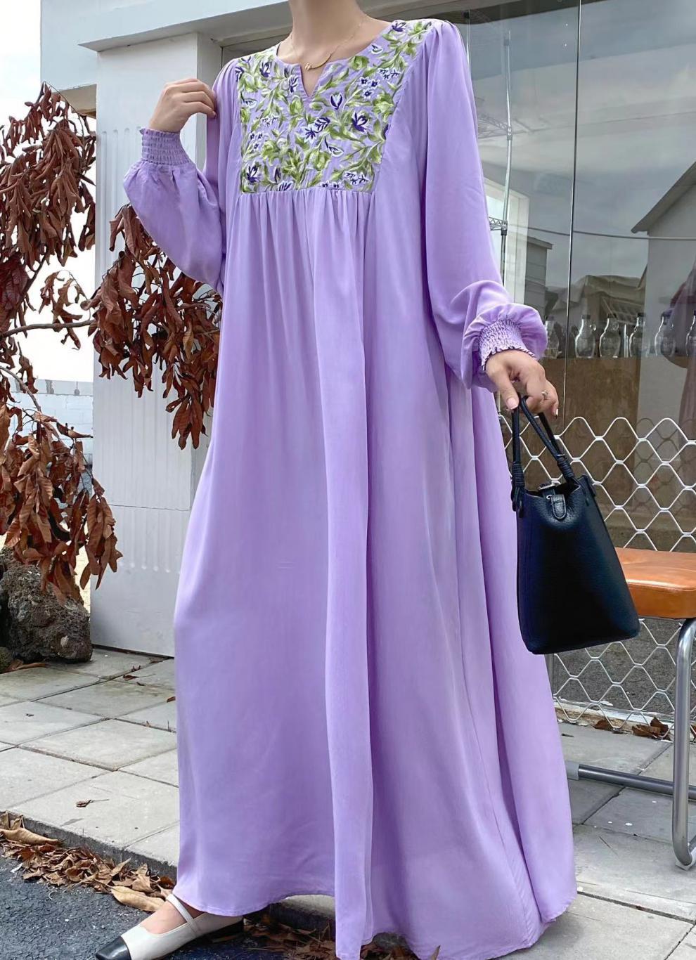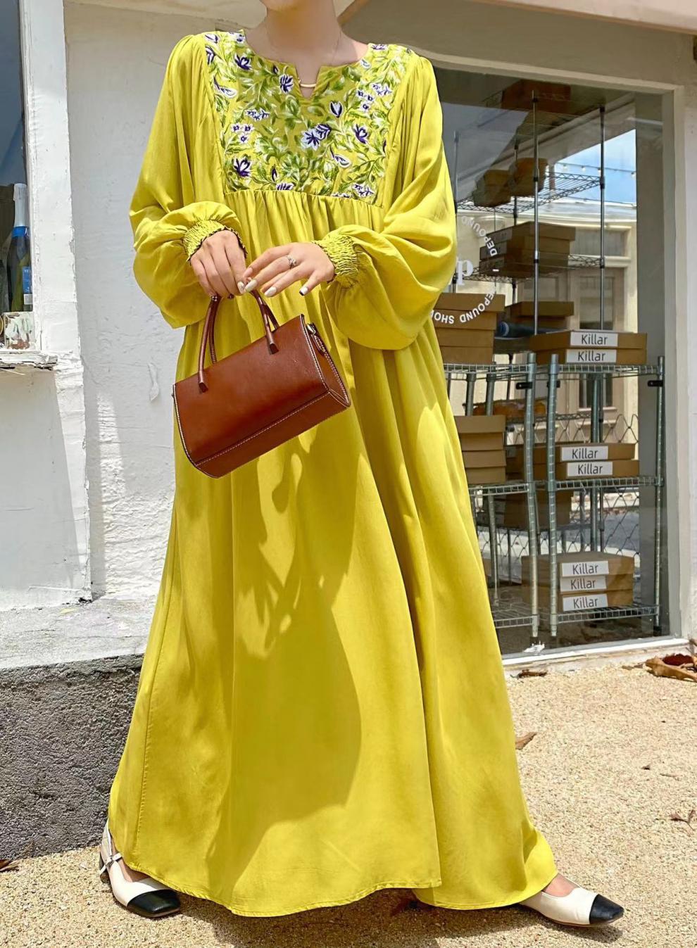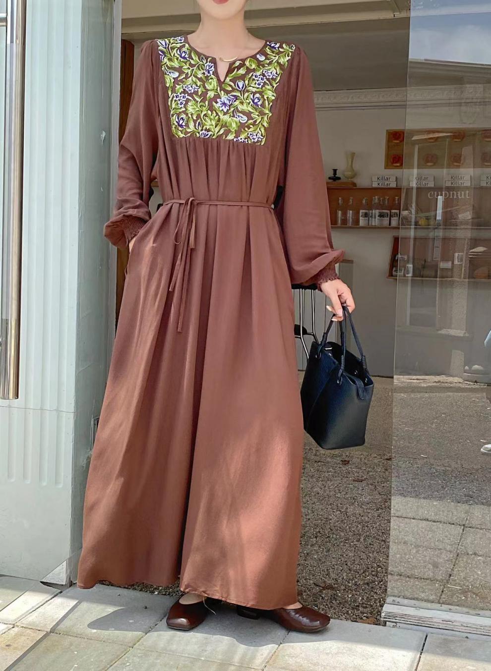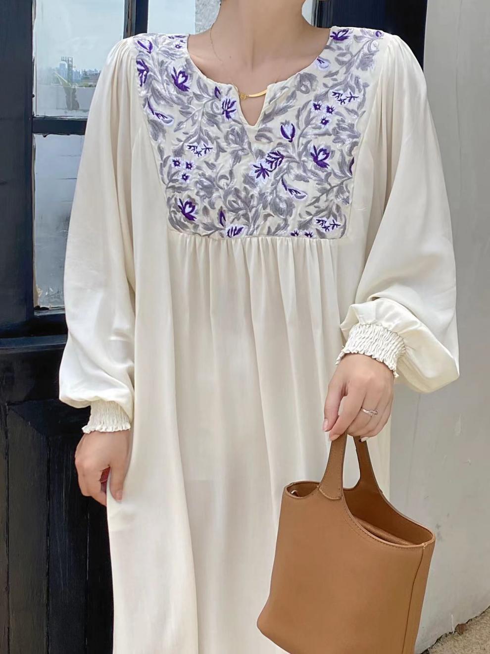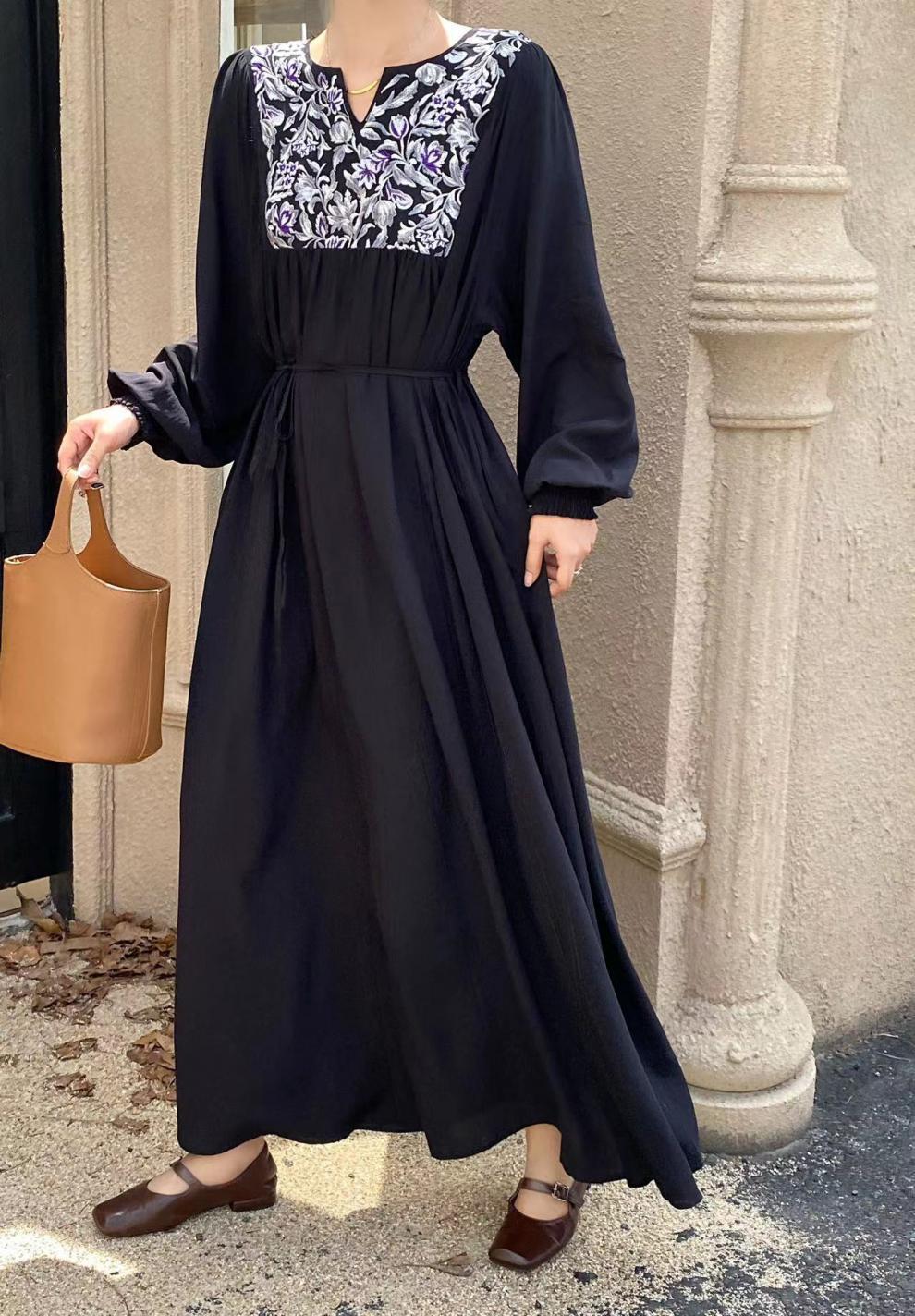 【ワンピース】春秋 レトロアート風 ゆったり 大きいサイズ 刺繍入り 膝下丈 長袖ワンピース