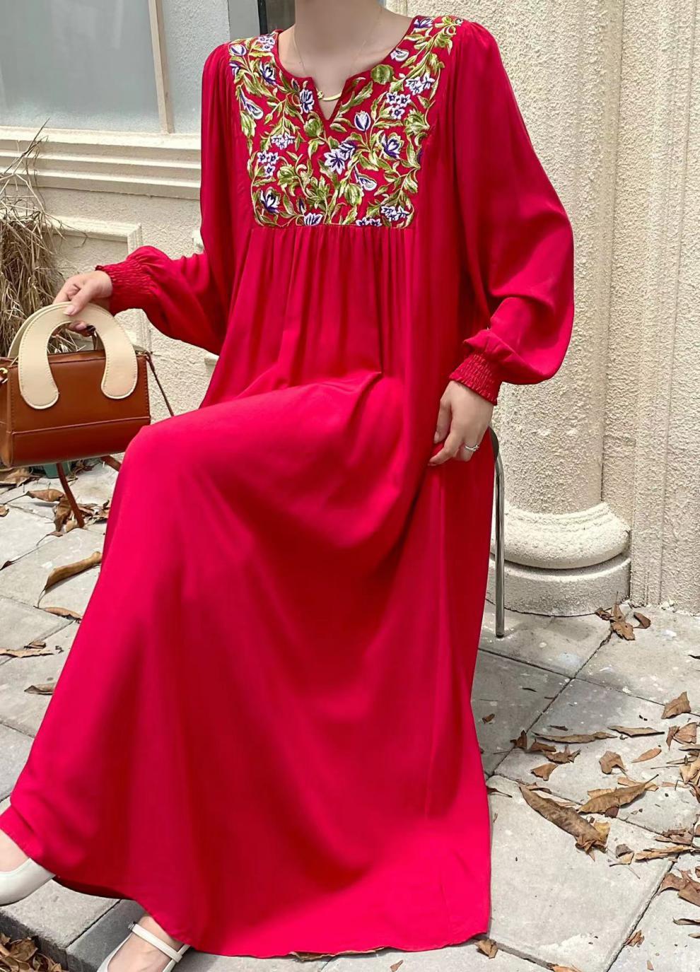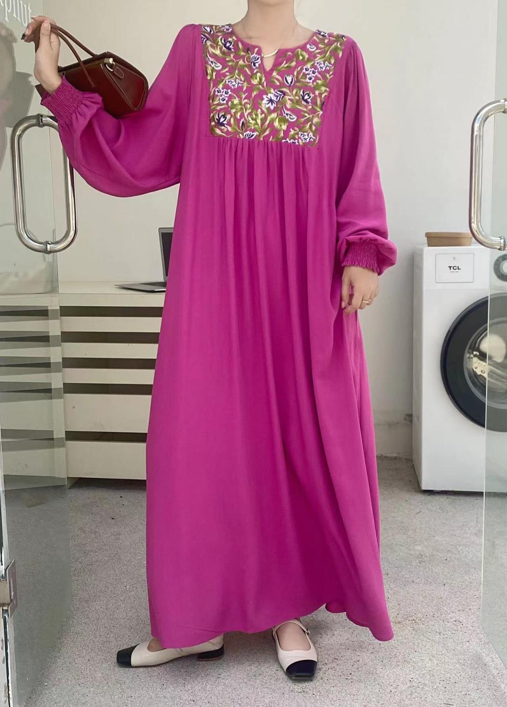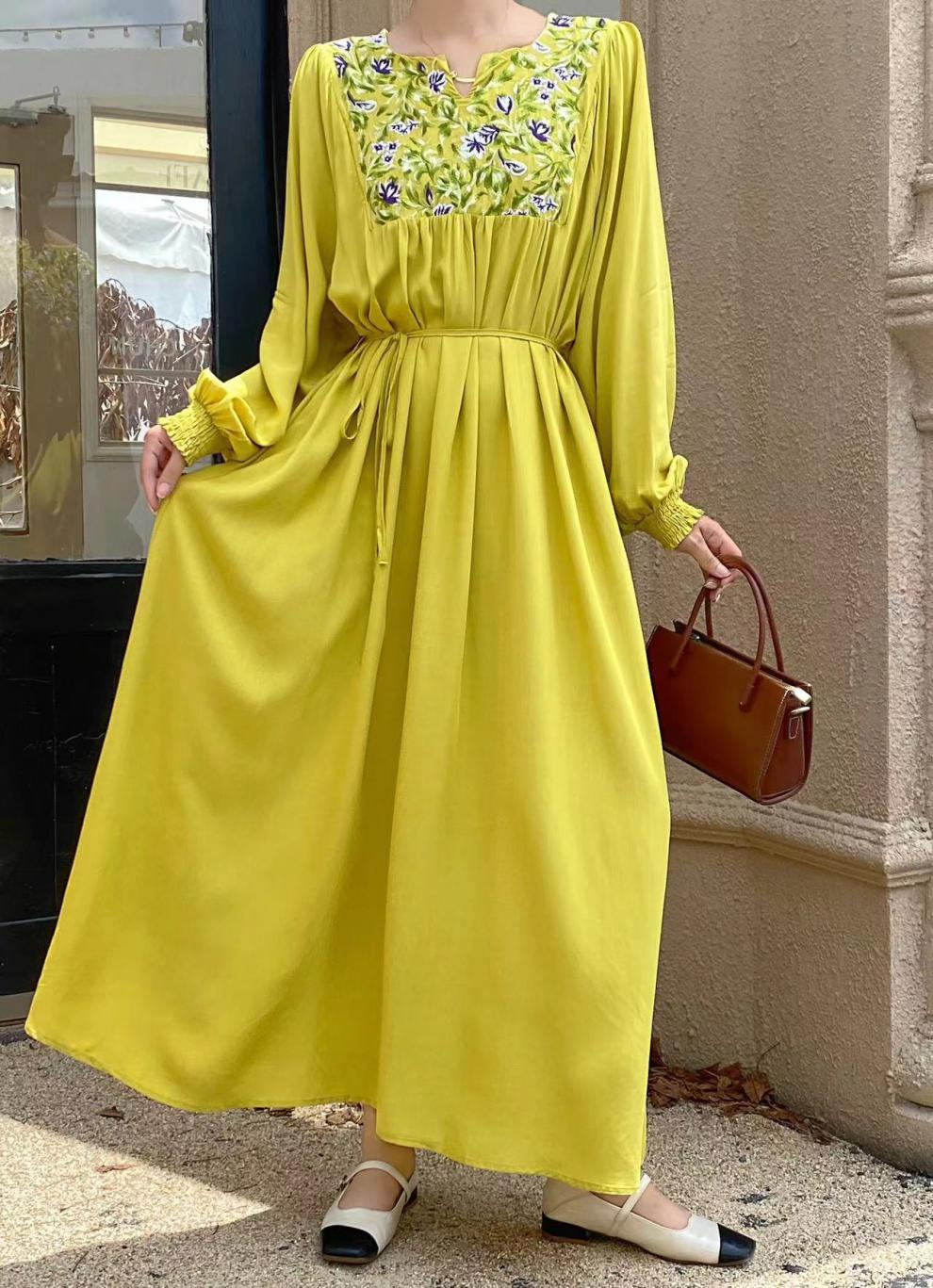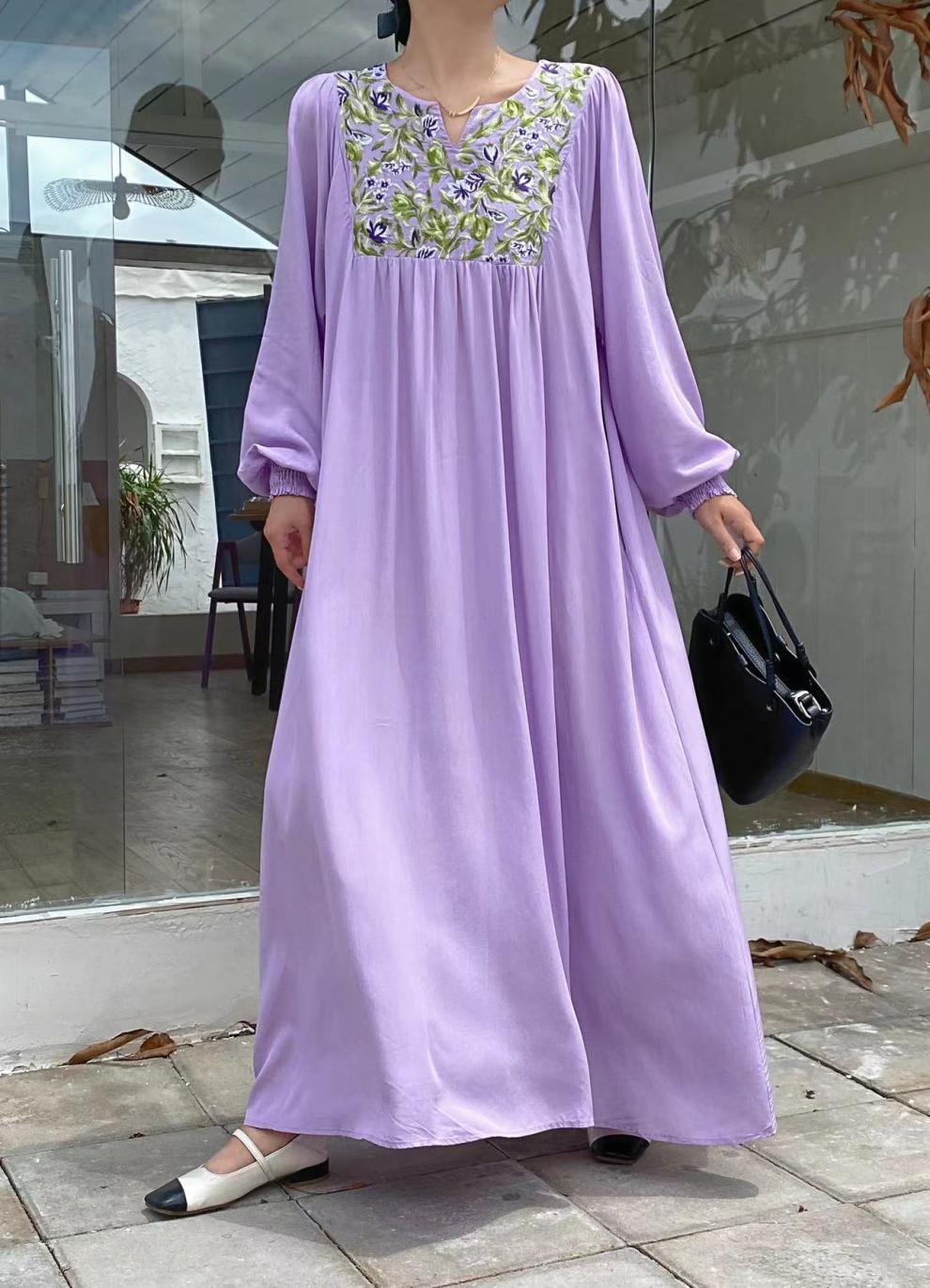【ワンピース】春秋 レトロアート風 ゆったり 大きいサイズ 刺繍入り 膝下丈 長袖ワンピース