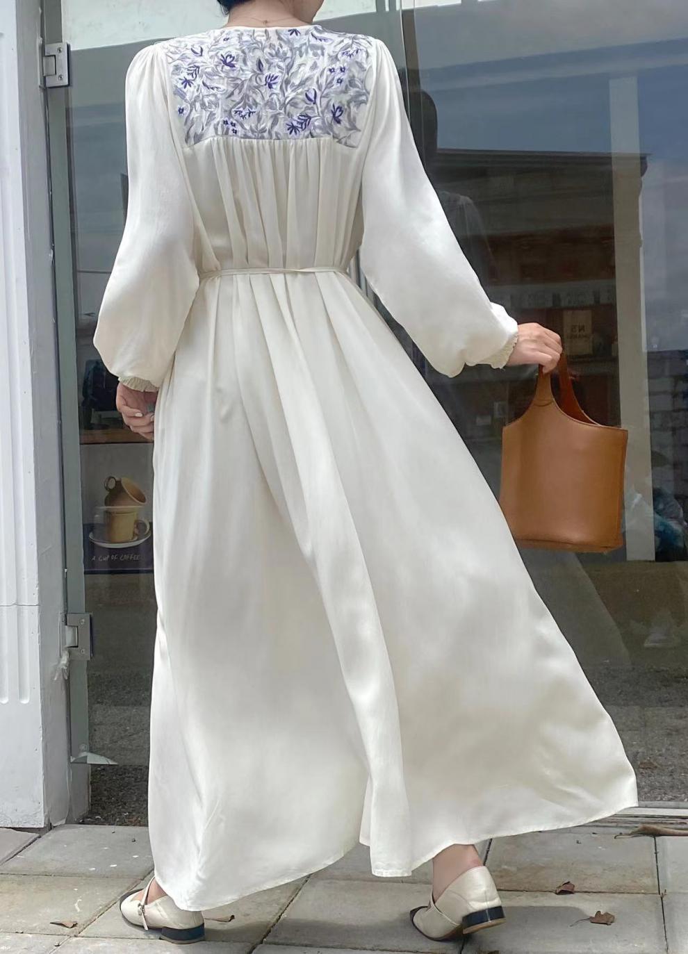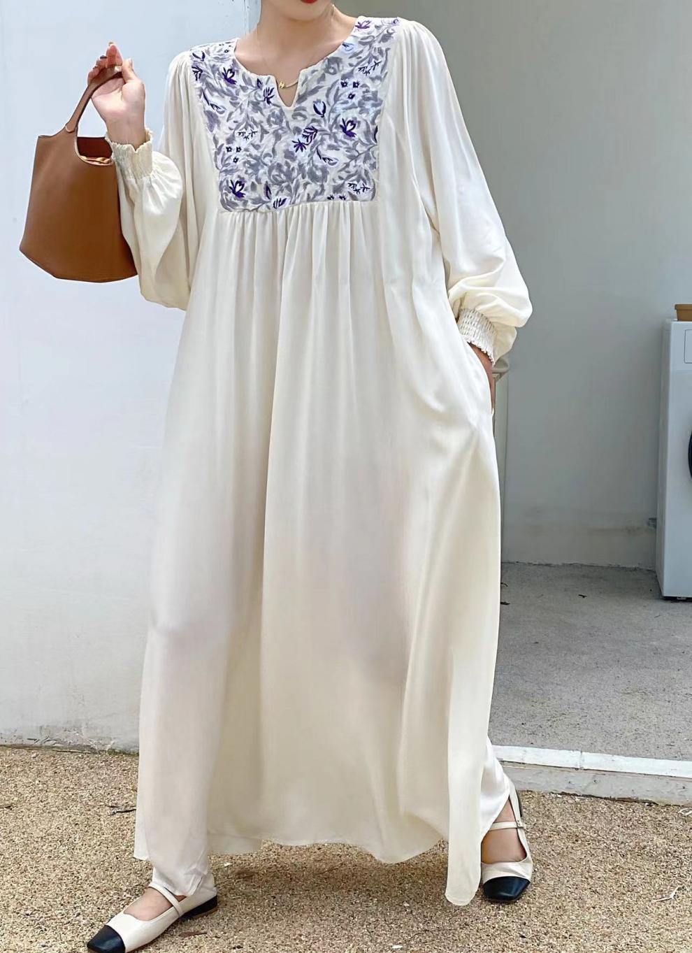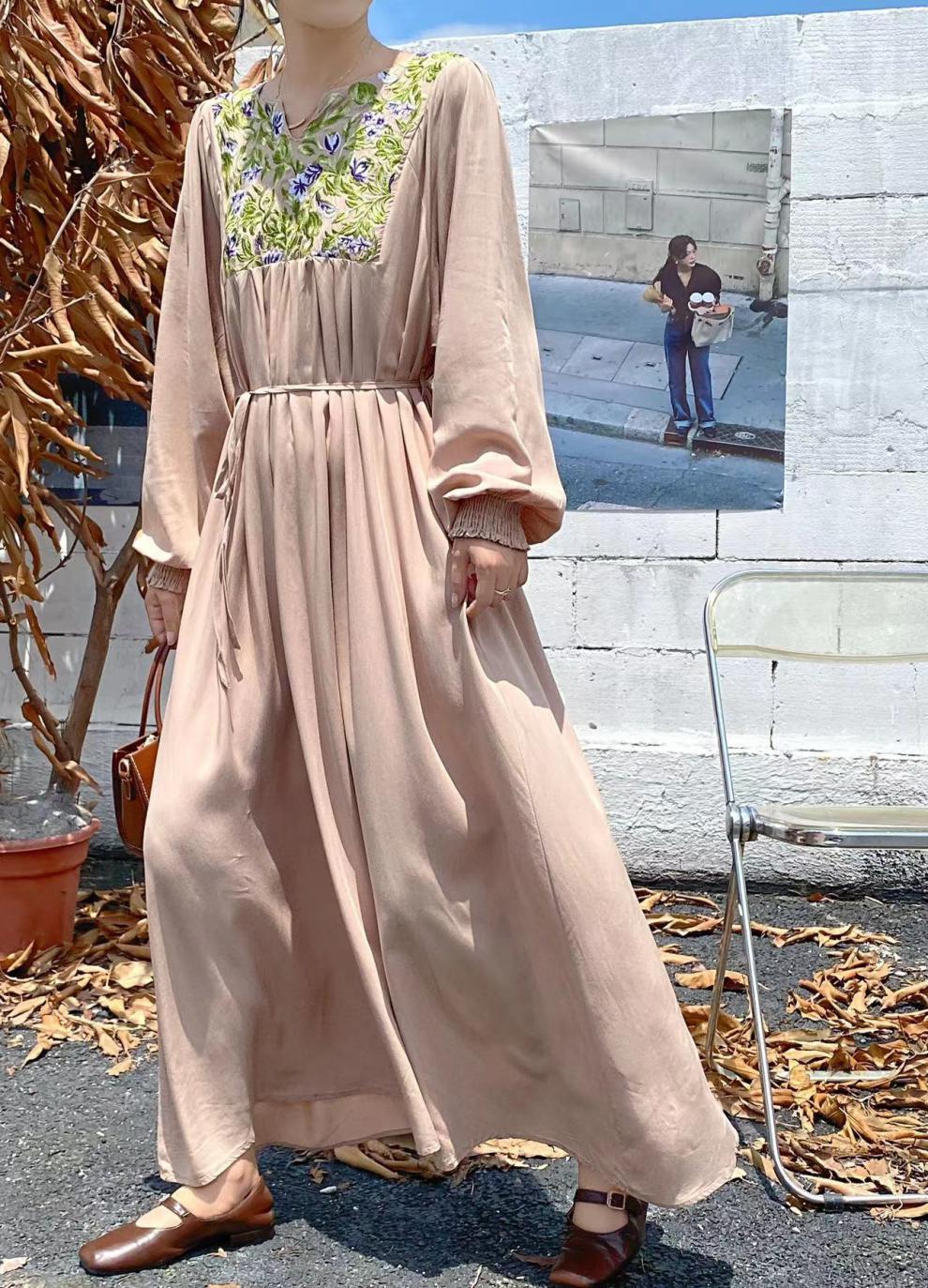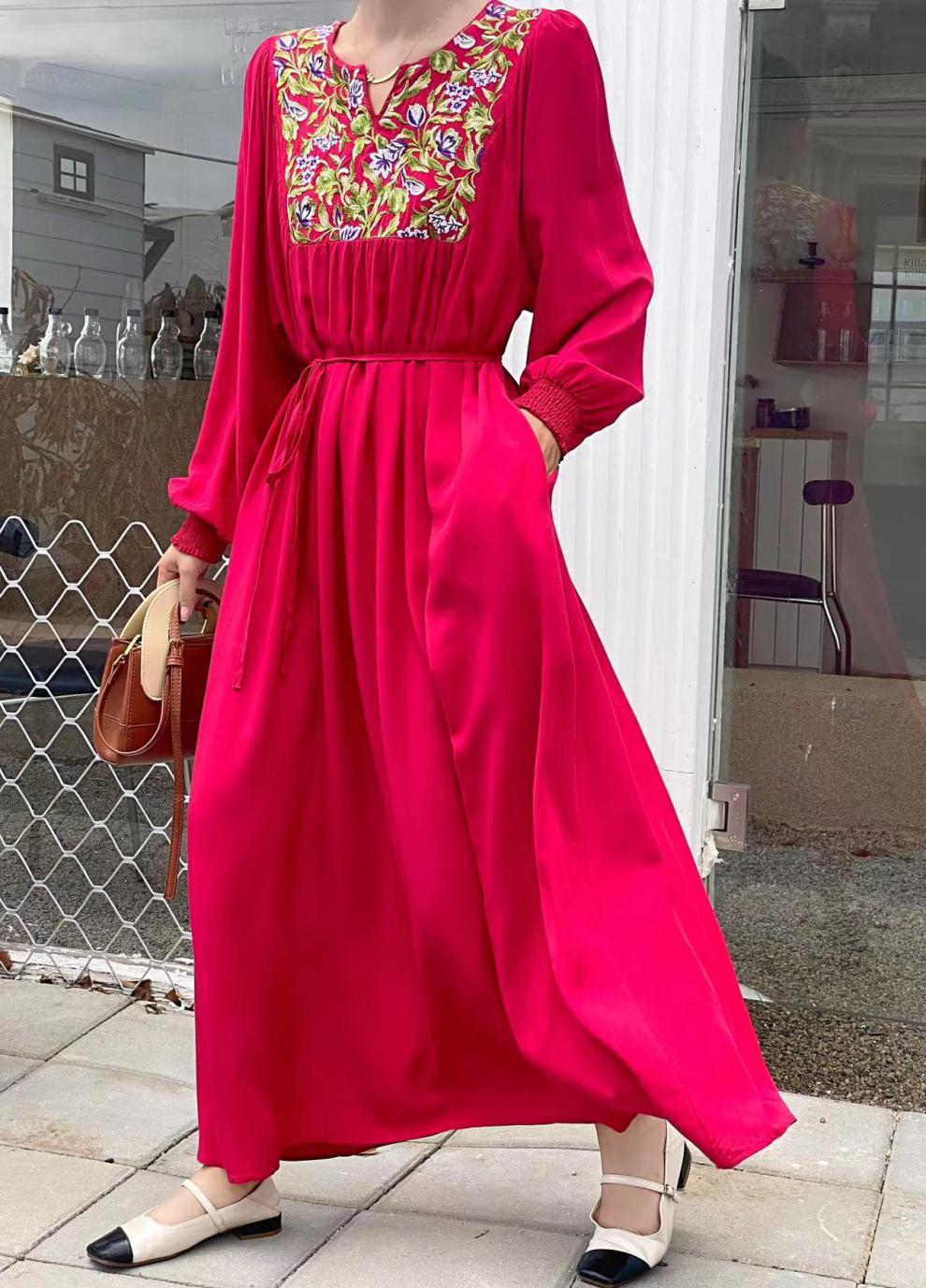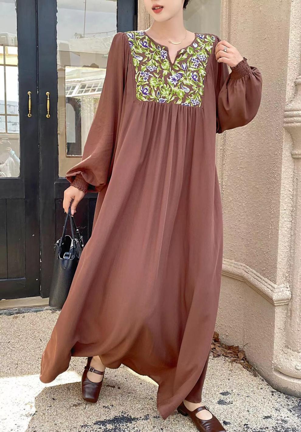 【ワンピース】春秋 レトロアート風 ゆったり 大きいサイズ 刺繍入り 膝下丈 長袖ワンピース