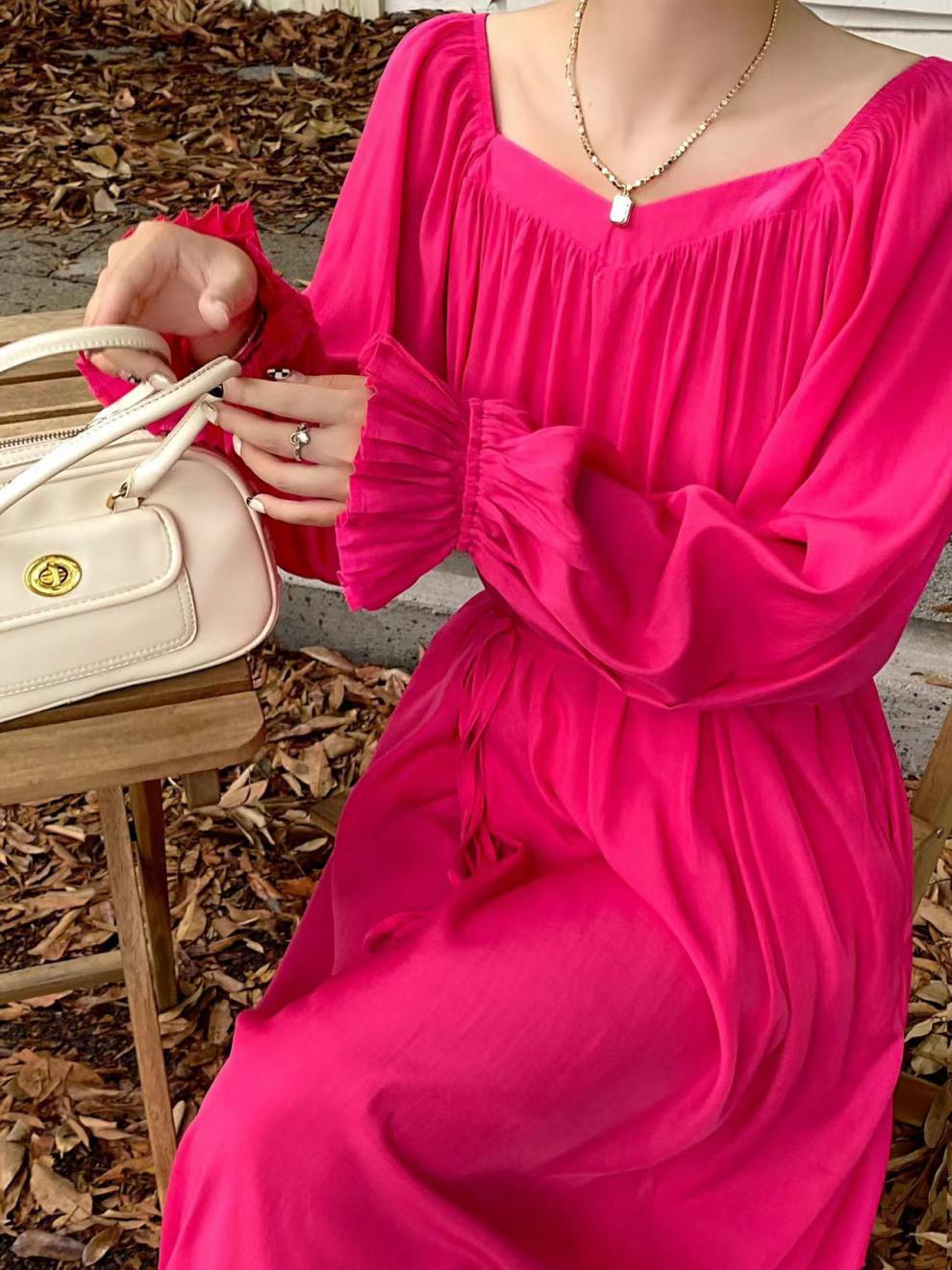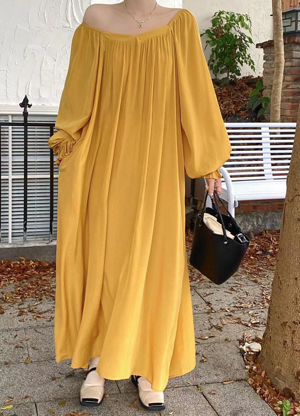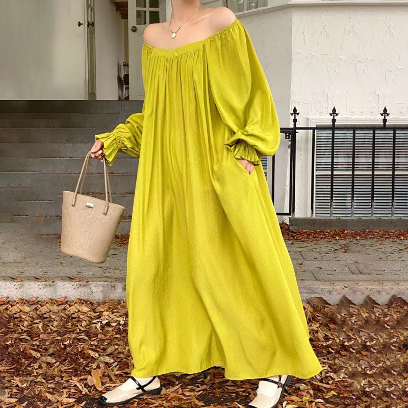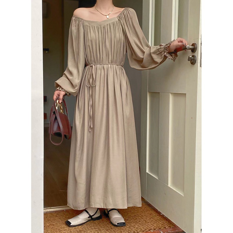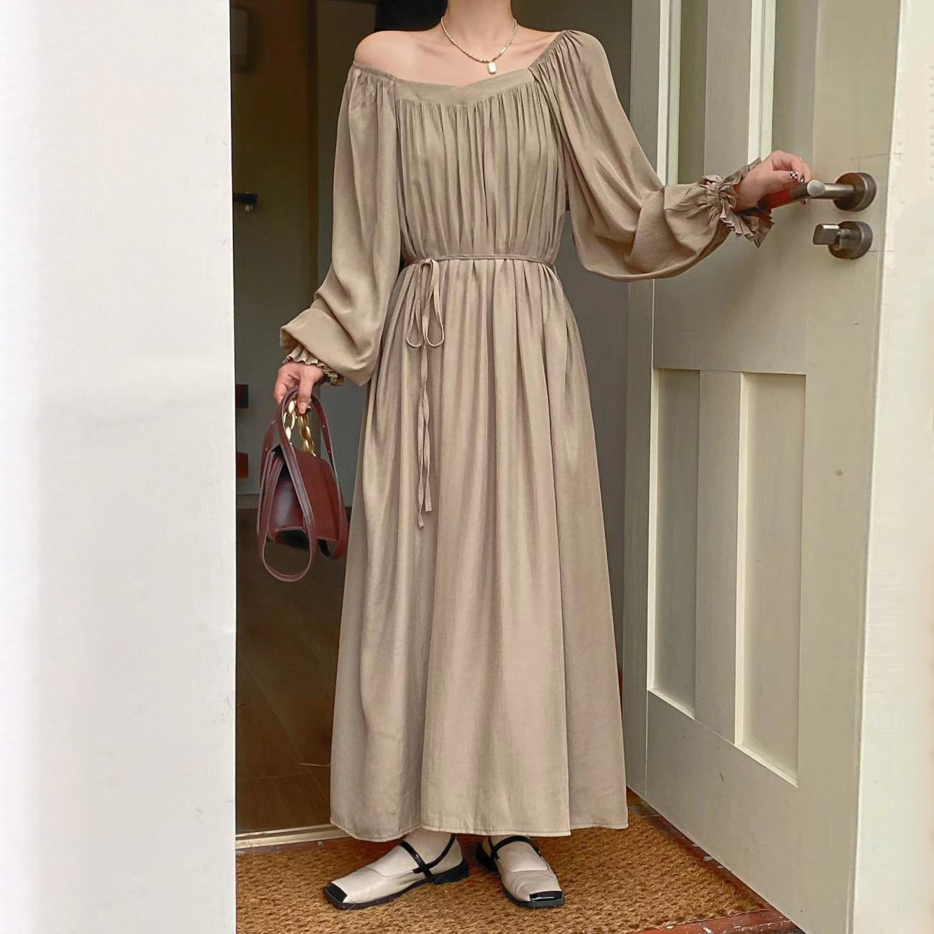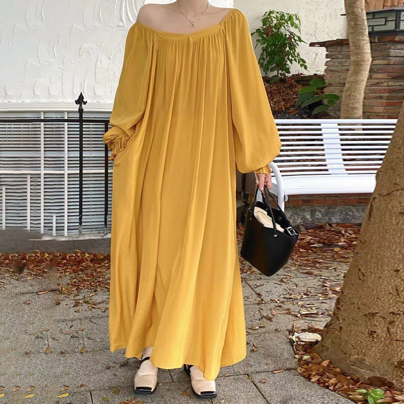 【ワンピース】夏春秋 全7色 韓国風オフショルダー ゆったり シルエットでスリムに見える 長袖ワンピース