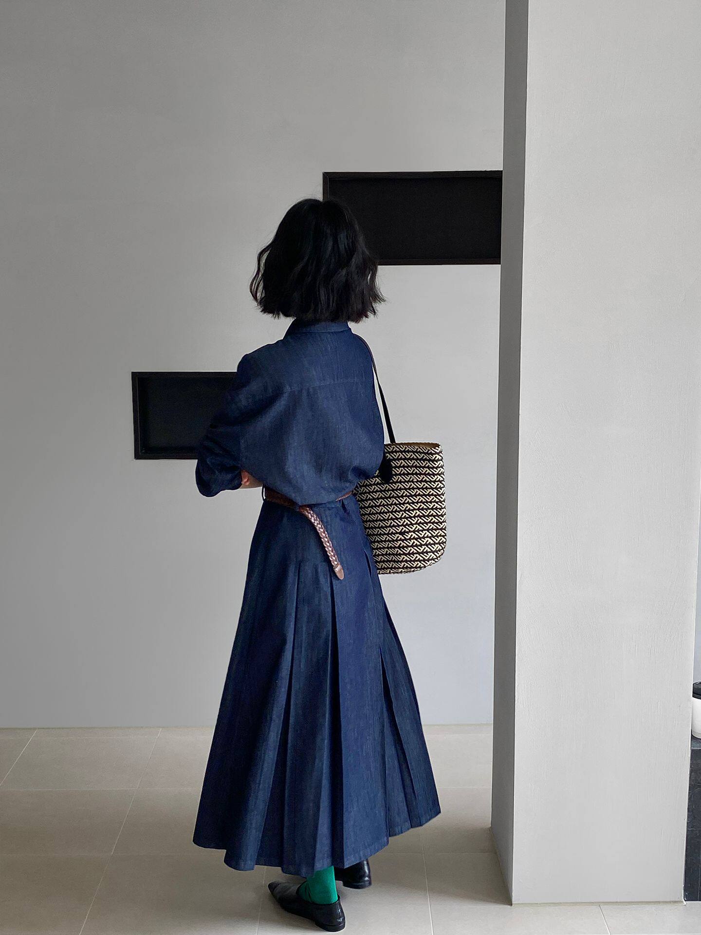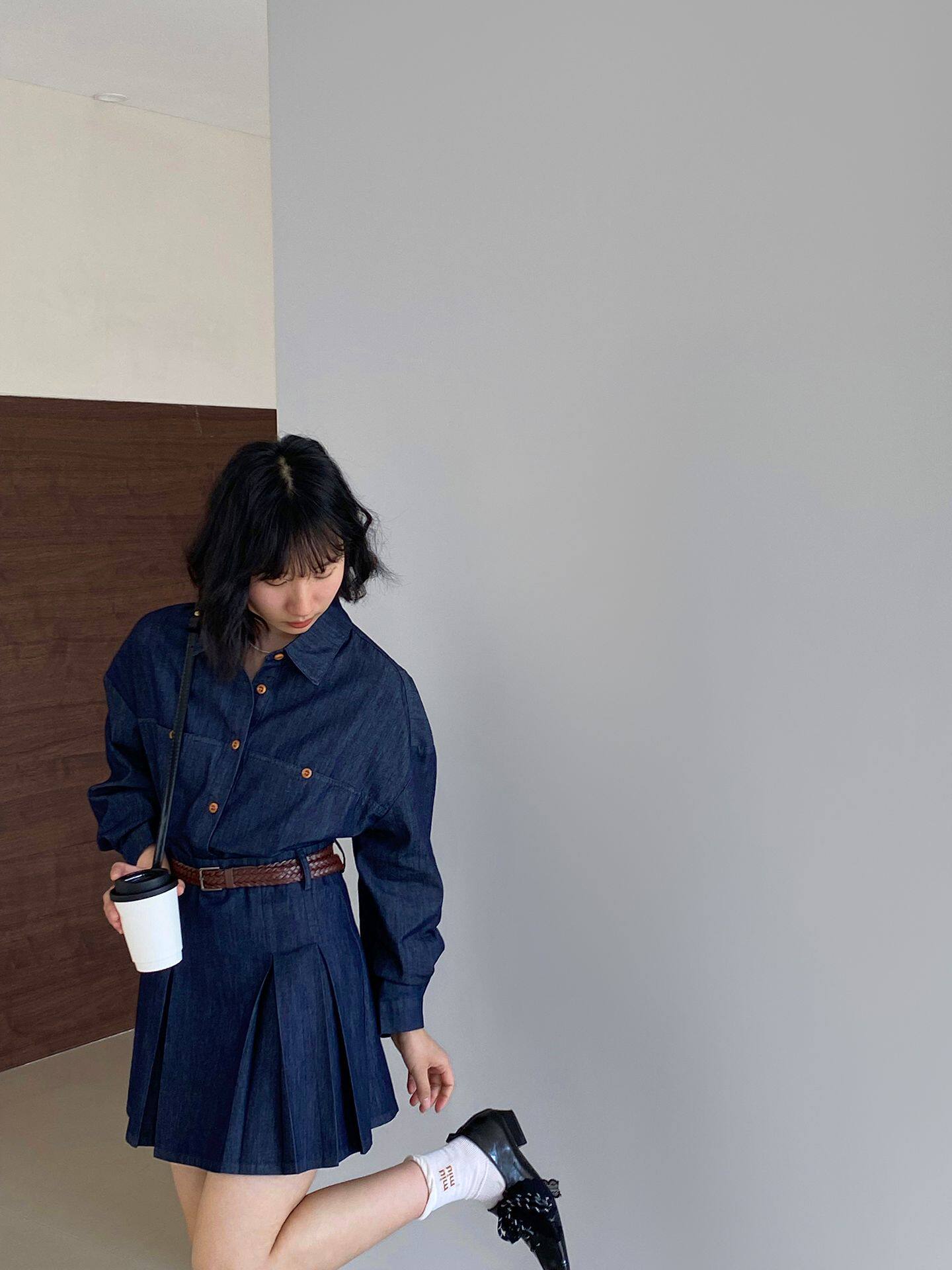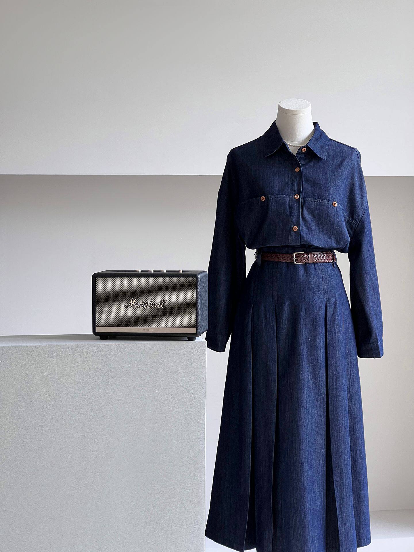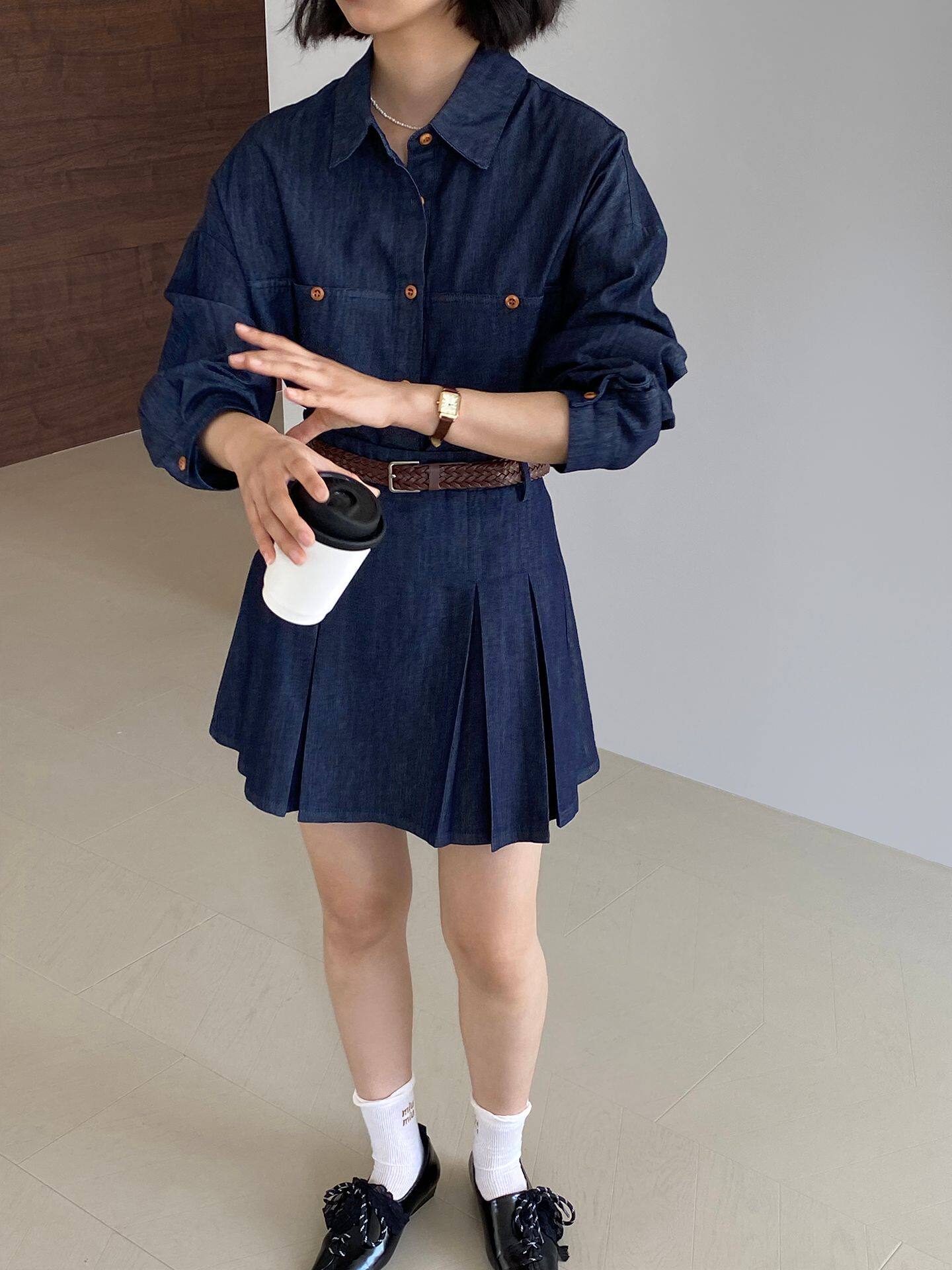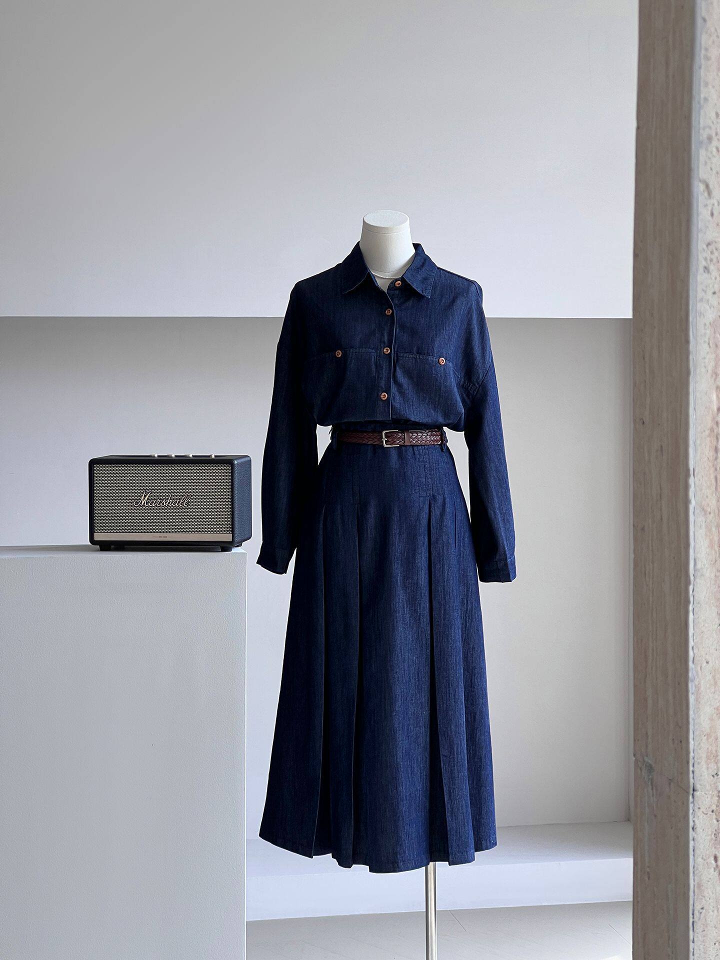 【単品注文】【セットアップ】春秋 レトロ 通勤 デニムシャツ + ハイウエスト プリーツスカート 上下セット【シリーズ】