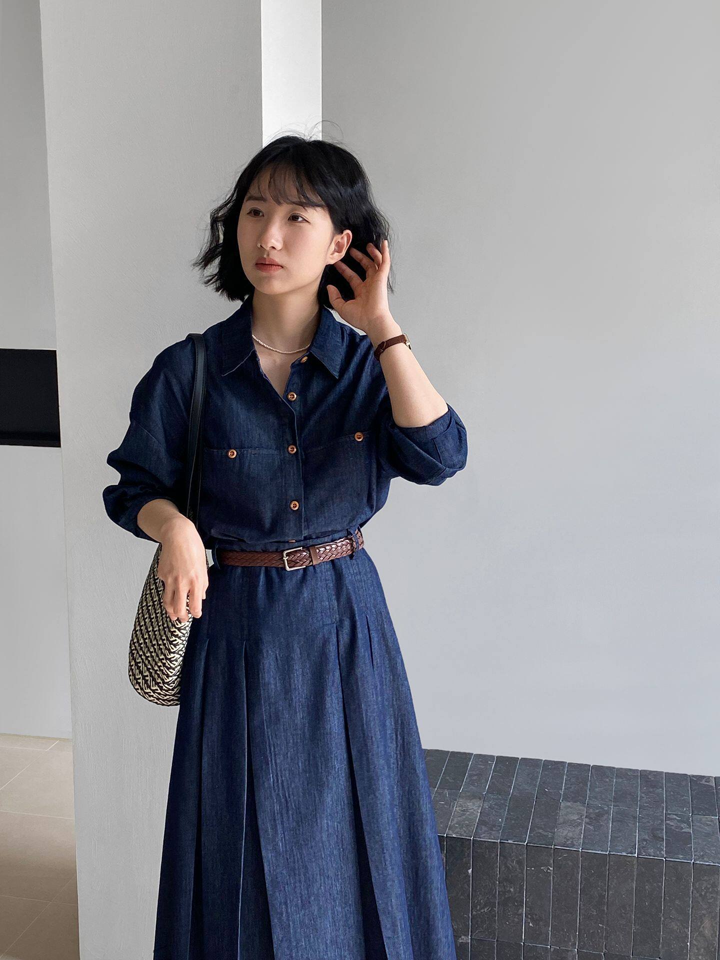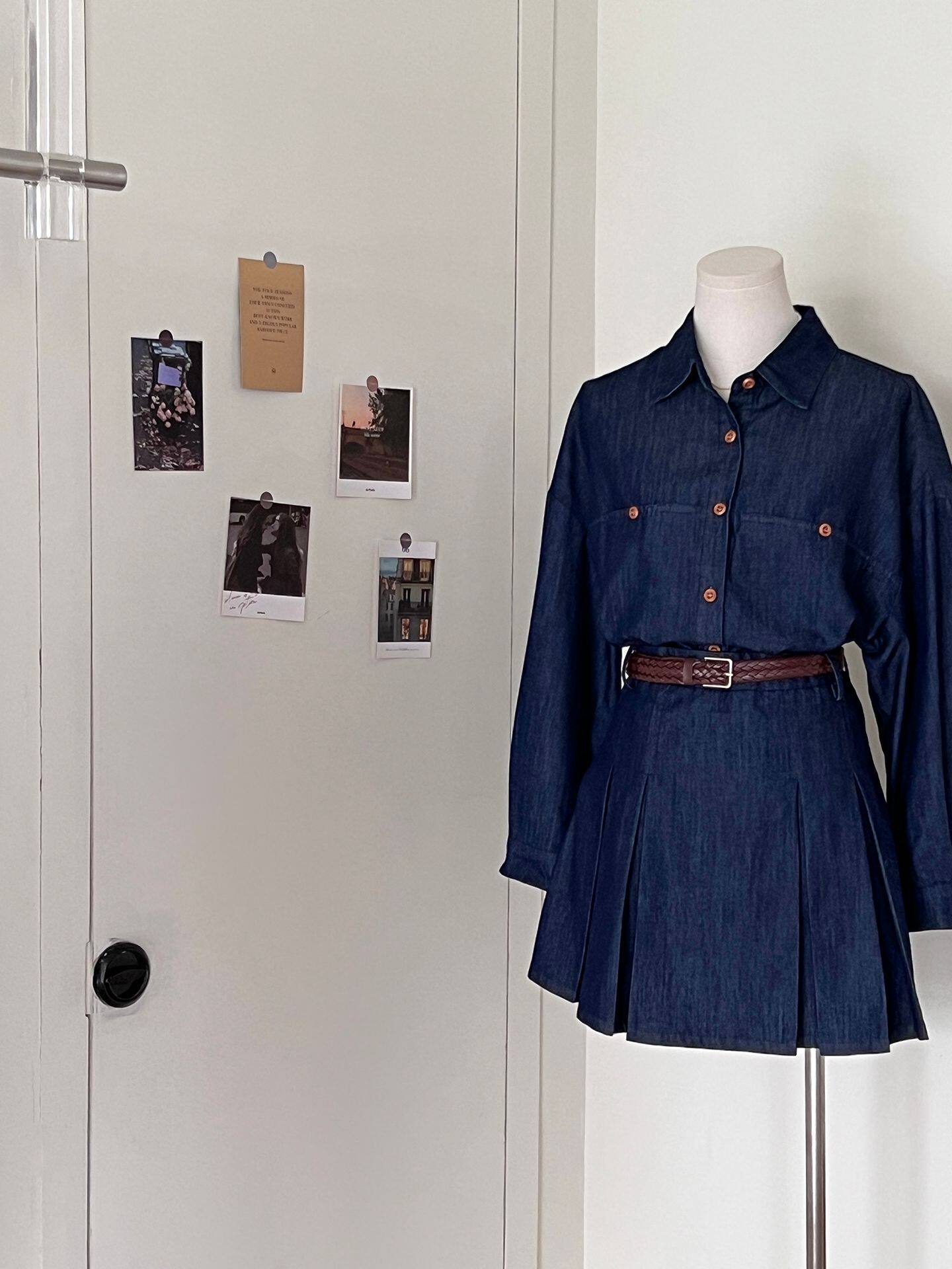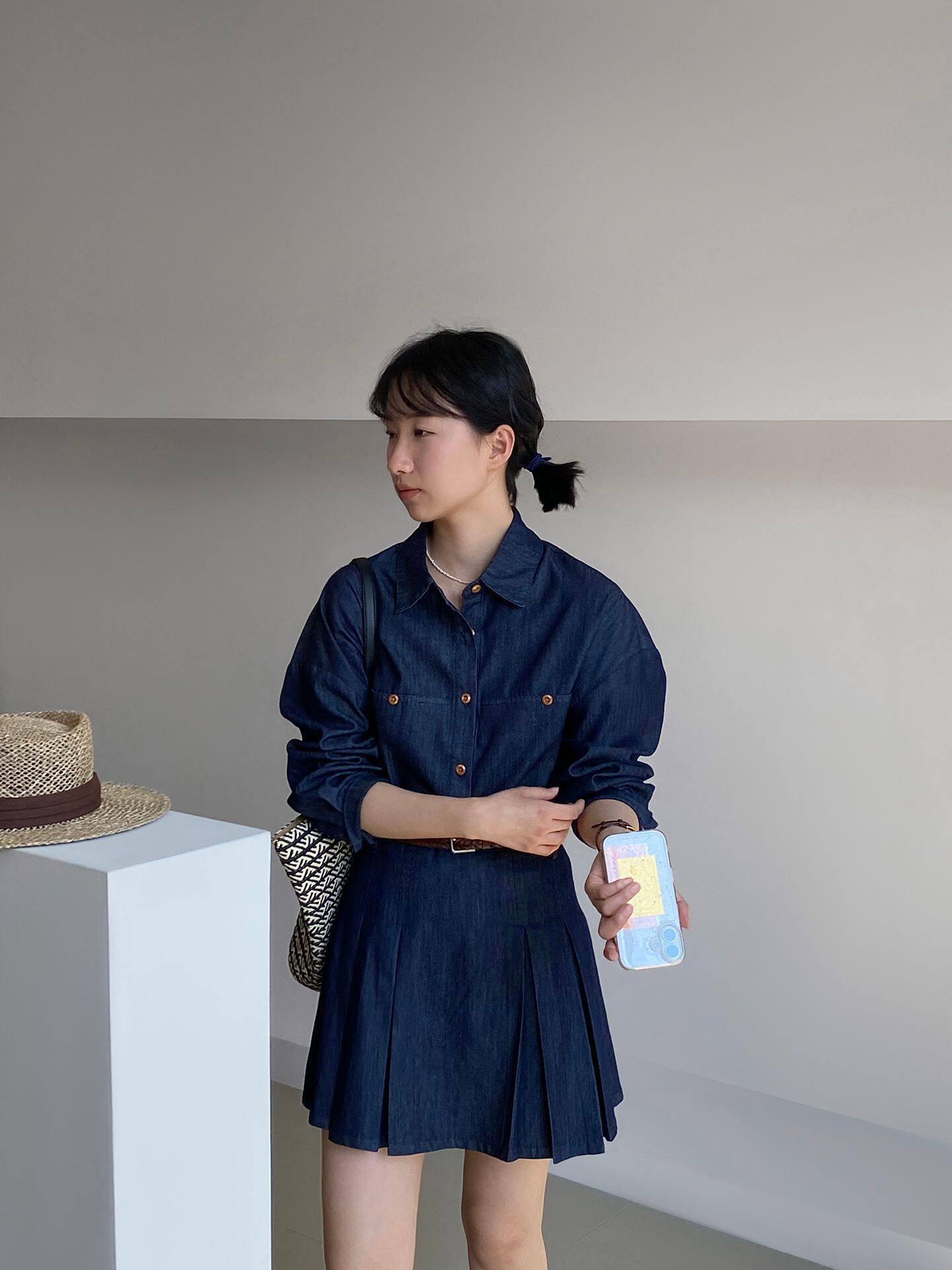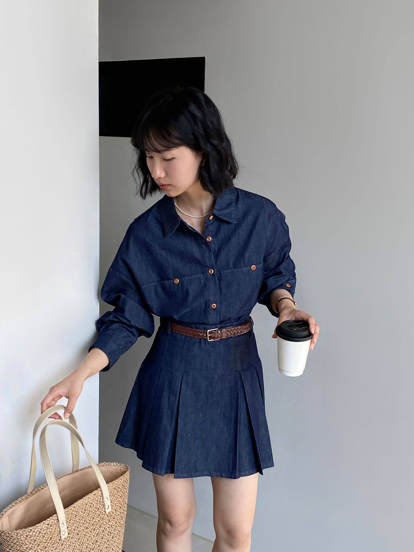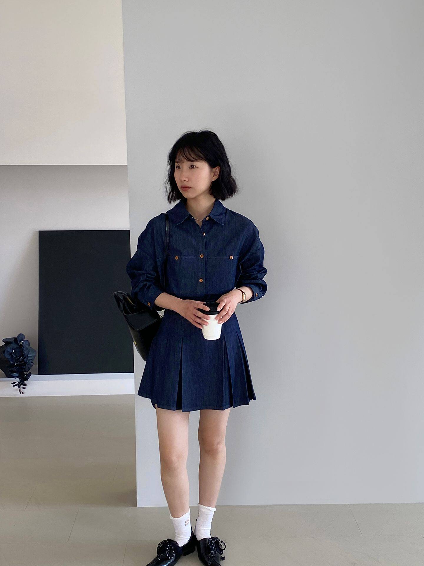【単品注文】【セットアップ】春秋 レトロ 通勤 デニムシャツ + ハイウエスト プリーツスカート 上下セット【シリーズ】