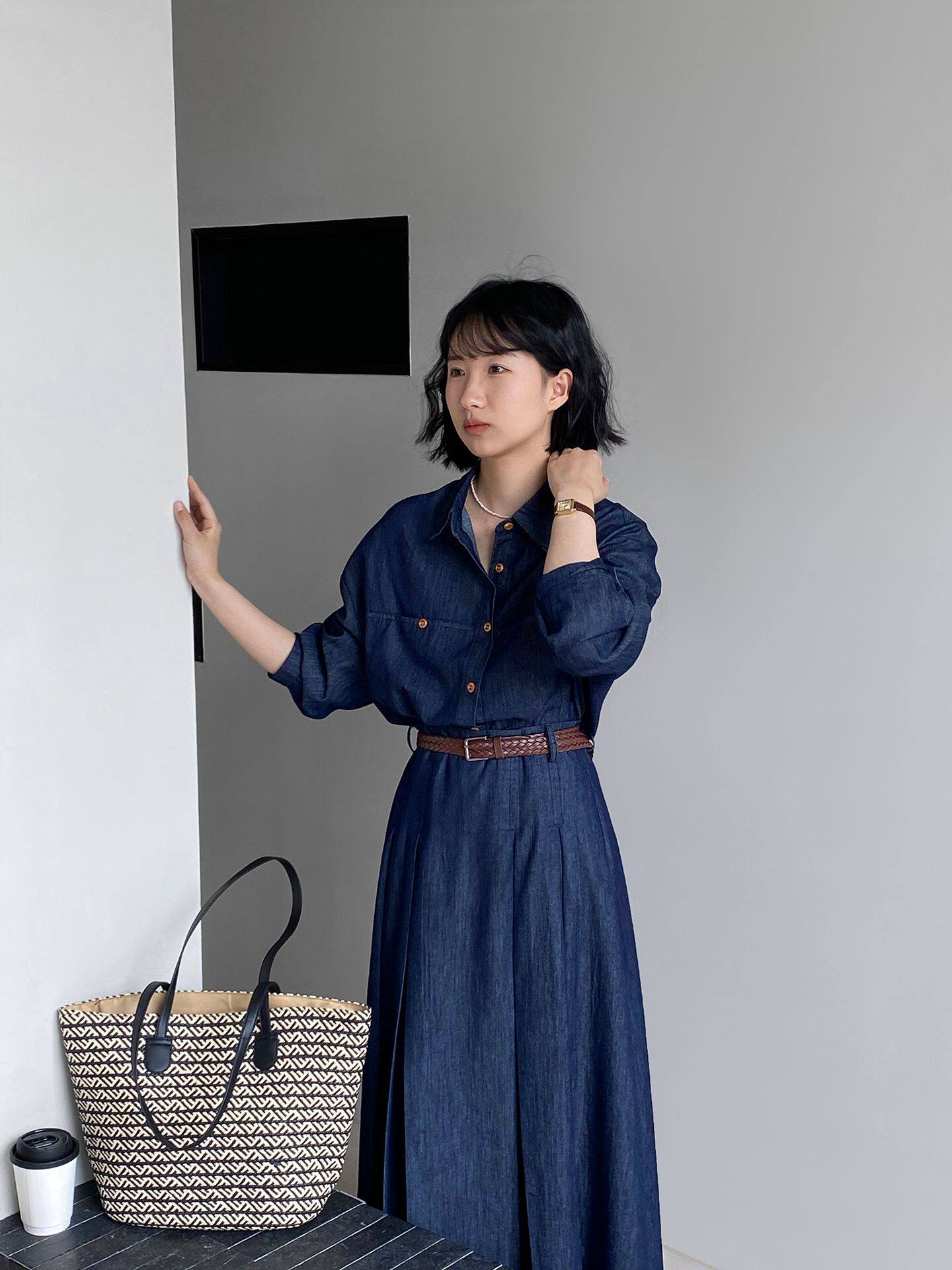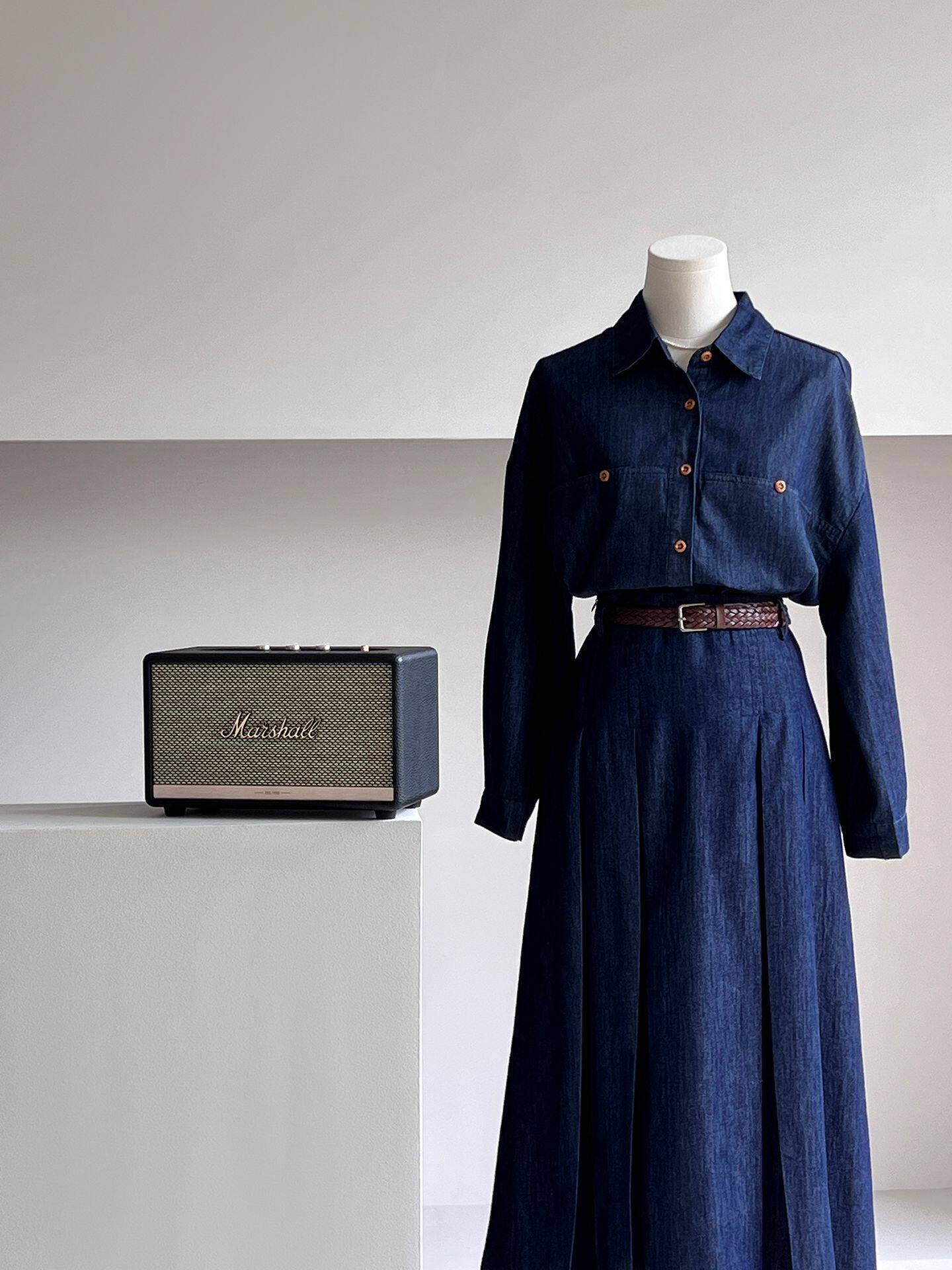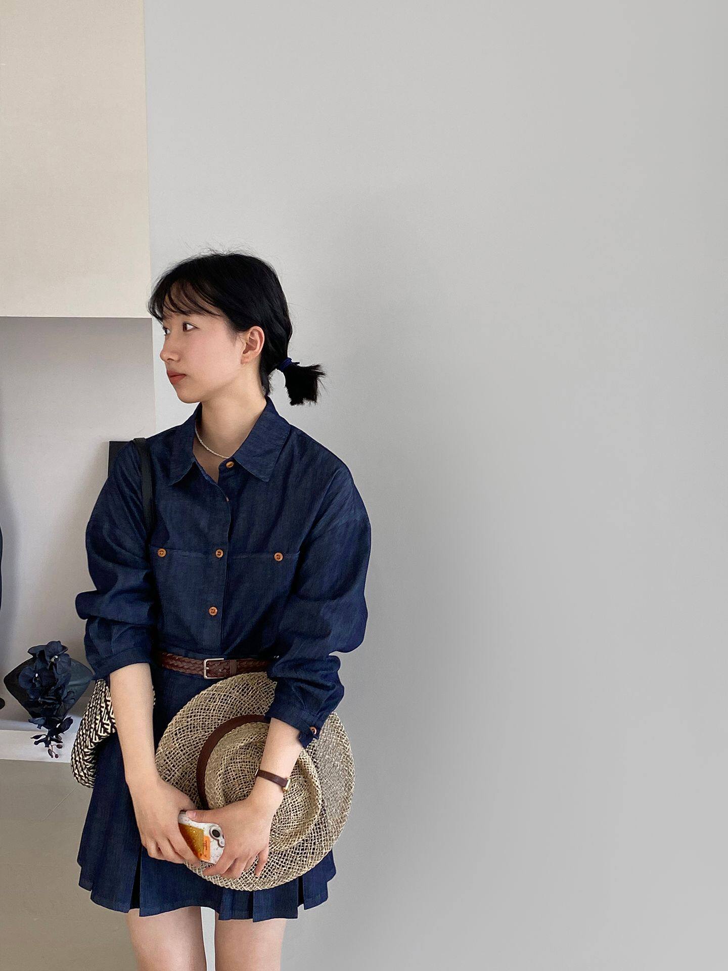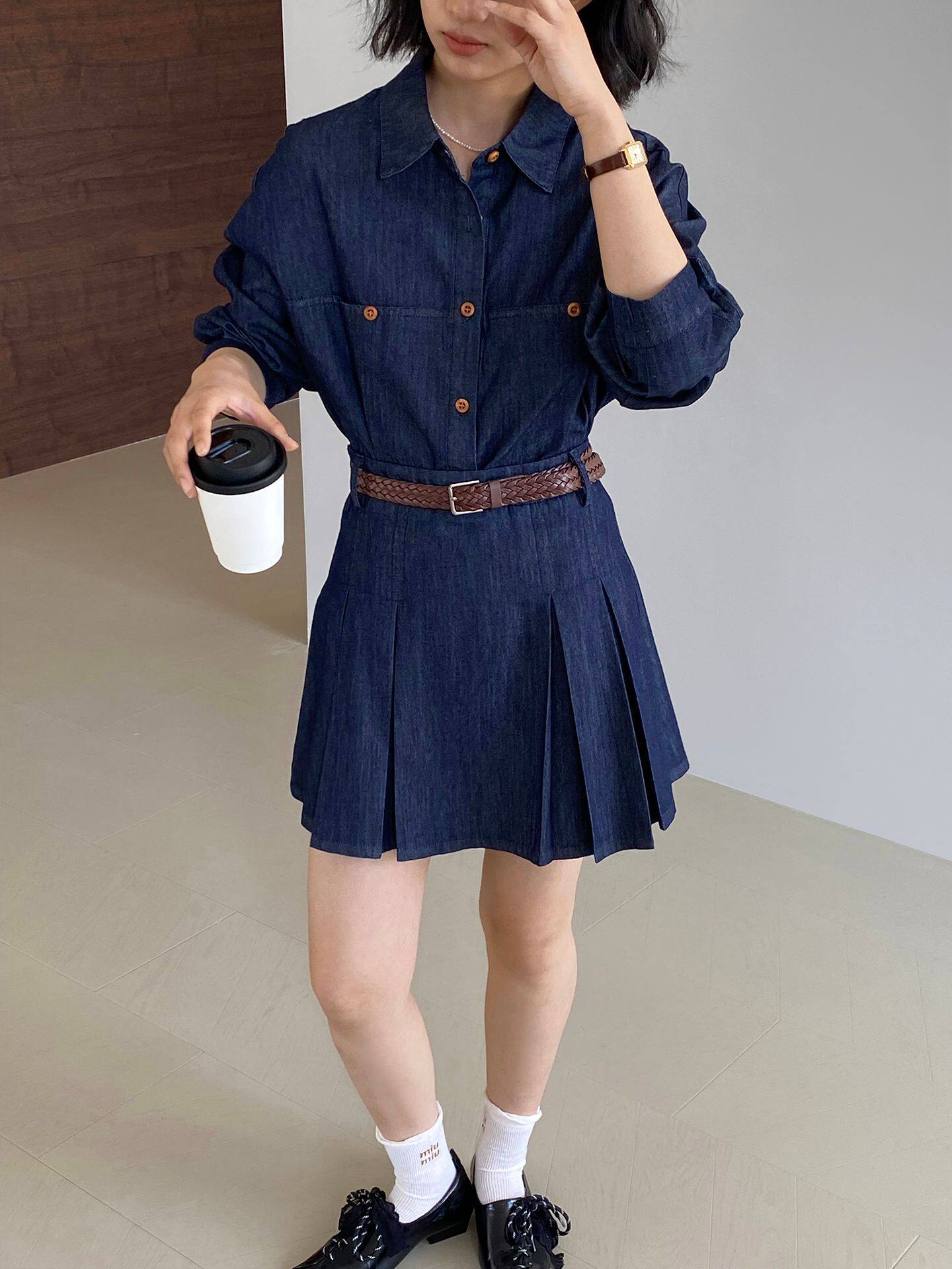 【単品注文】【セットアップ】春秋 レトロ 通勤 デニムシャツ + ハイウエスト プリーツスカート 上下セット【シリーズ】