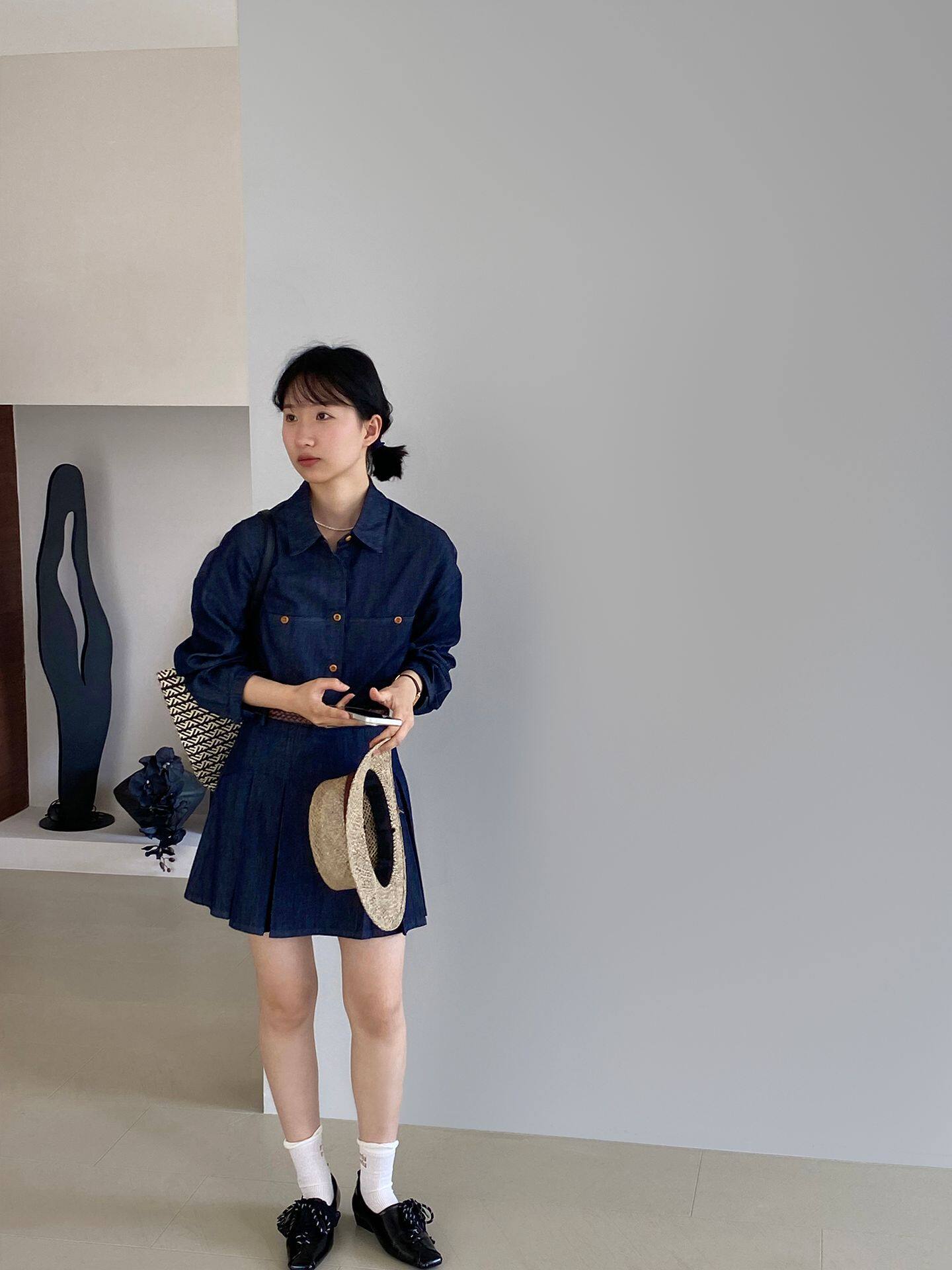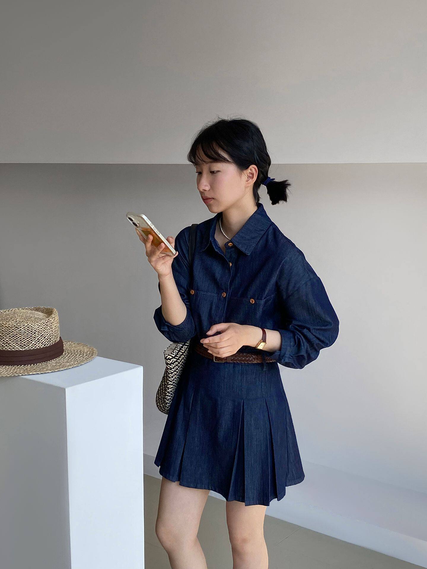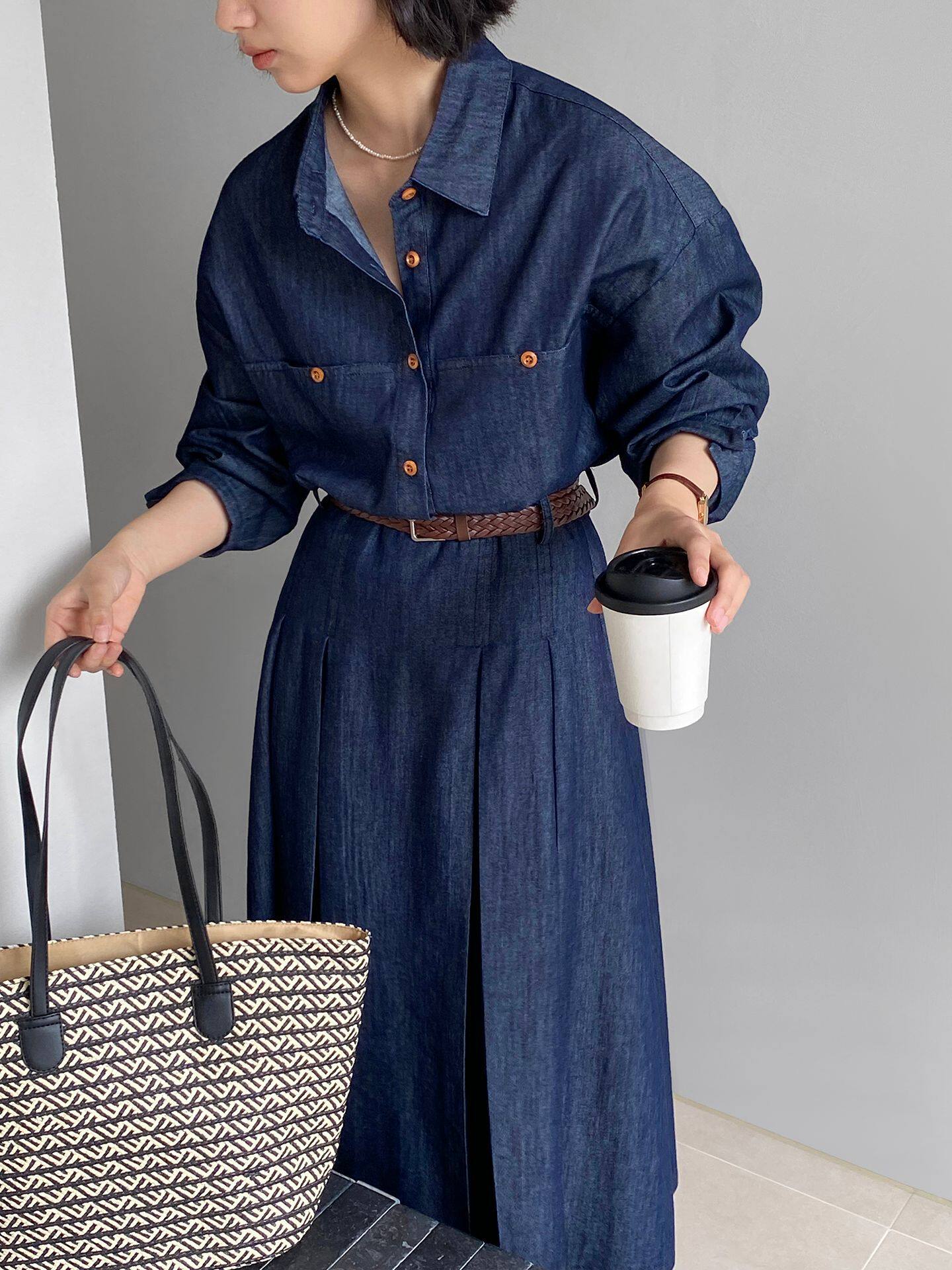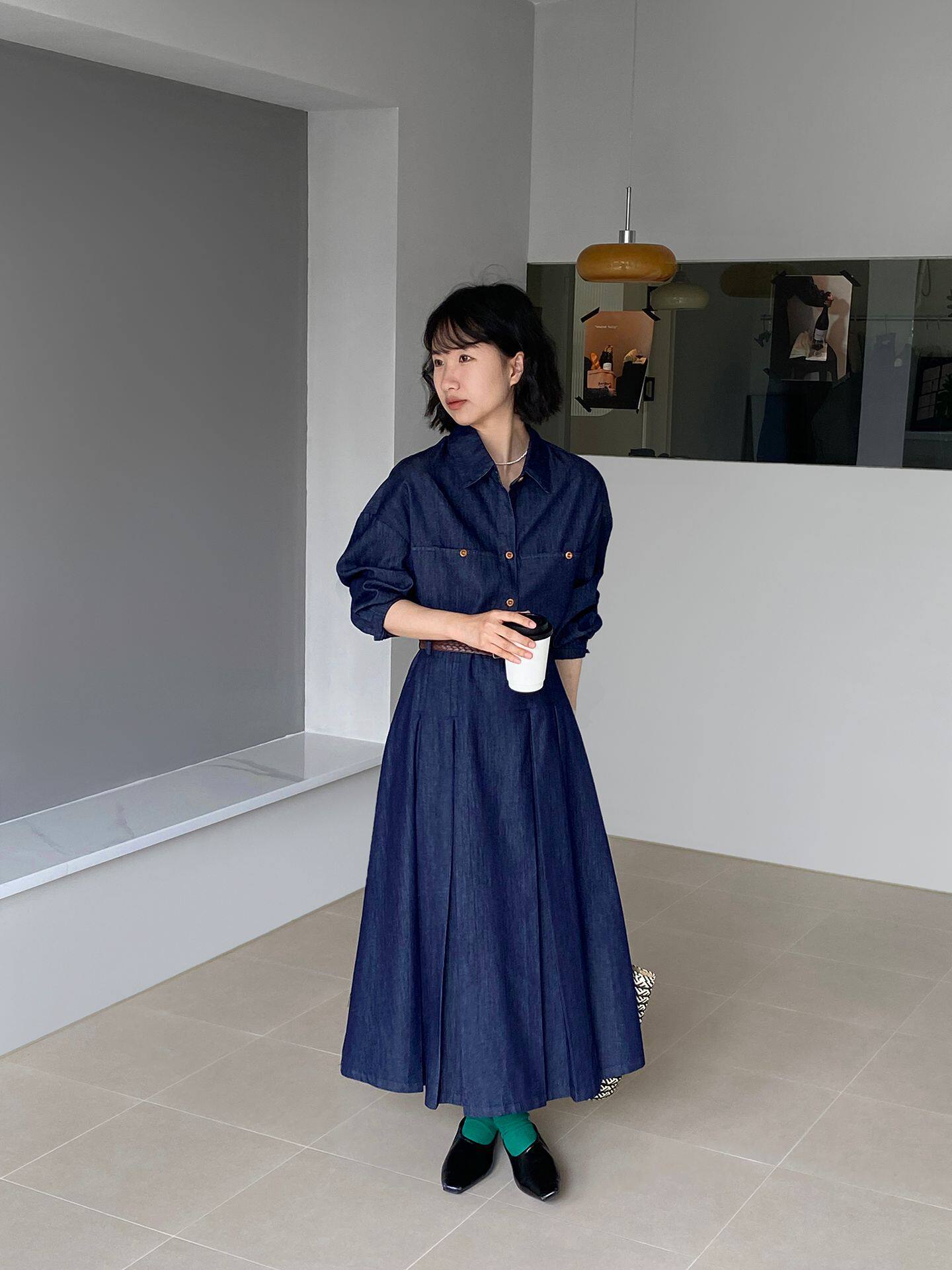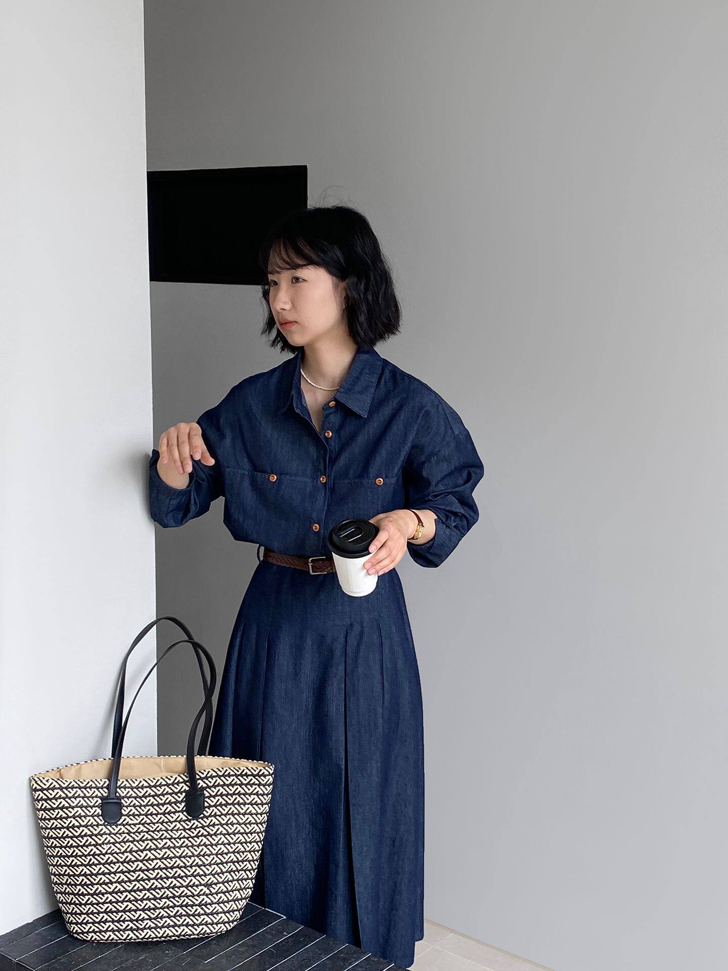 【単品注文】【セットアップ】春秋 レトロ 通勤 デニムシャツ + ハイウエスト プリーツスカート 上下セット【シリーズ】