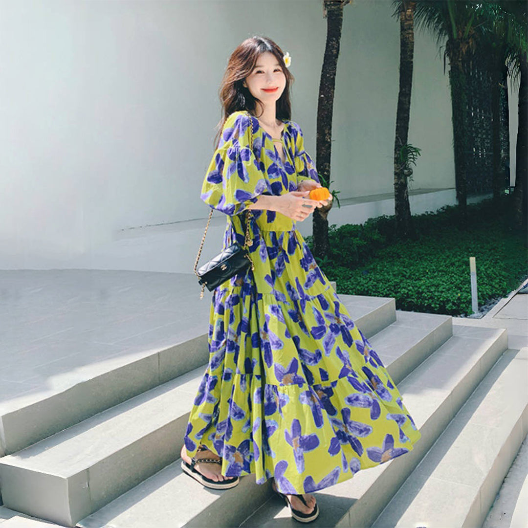 【ワンピース】韓国風 春秋新作 ゆったり大きめサイズ 体型カバー 花柄長袖ミディアムワンピース【SHシリーズ】