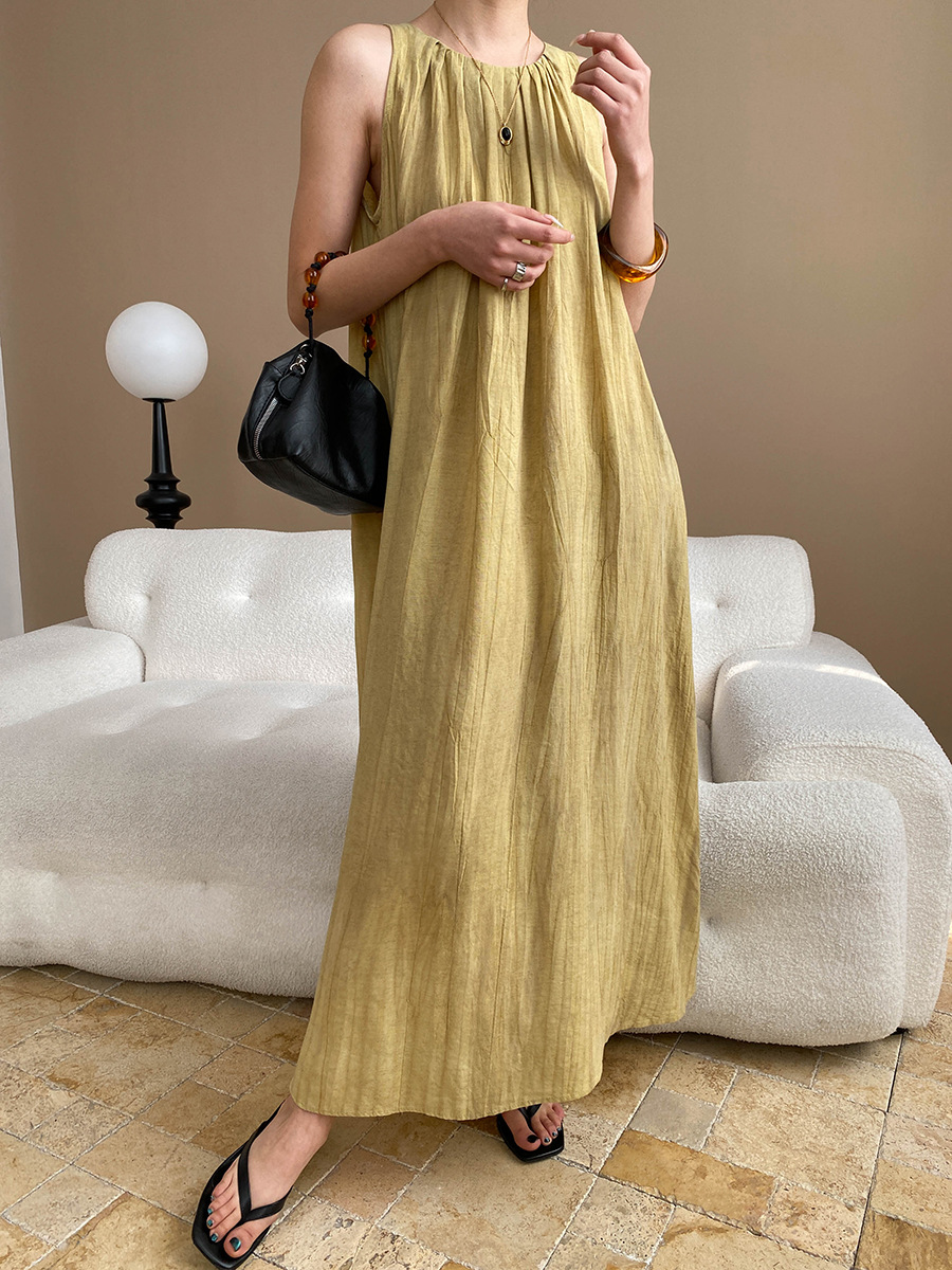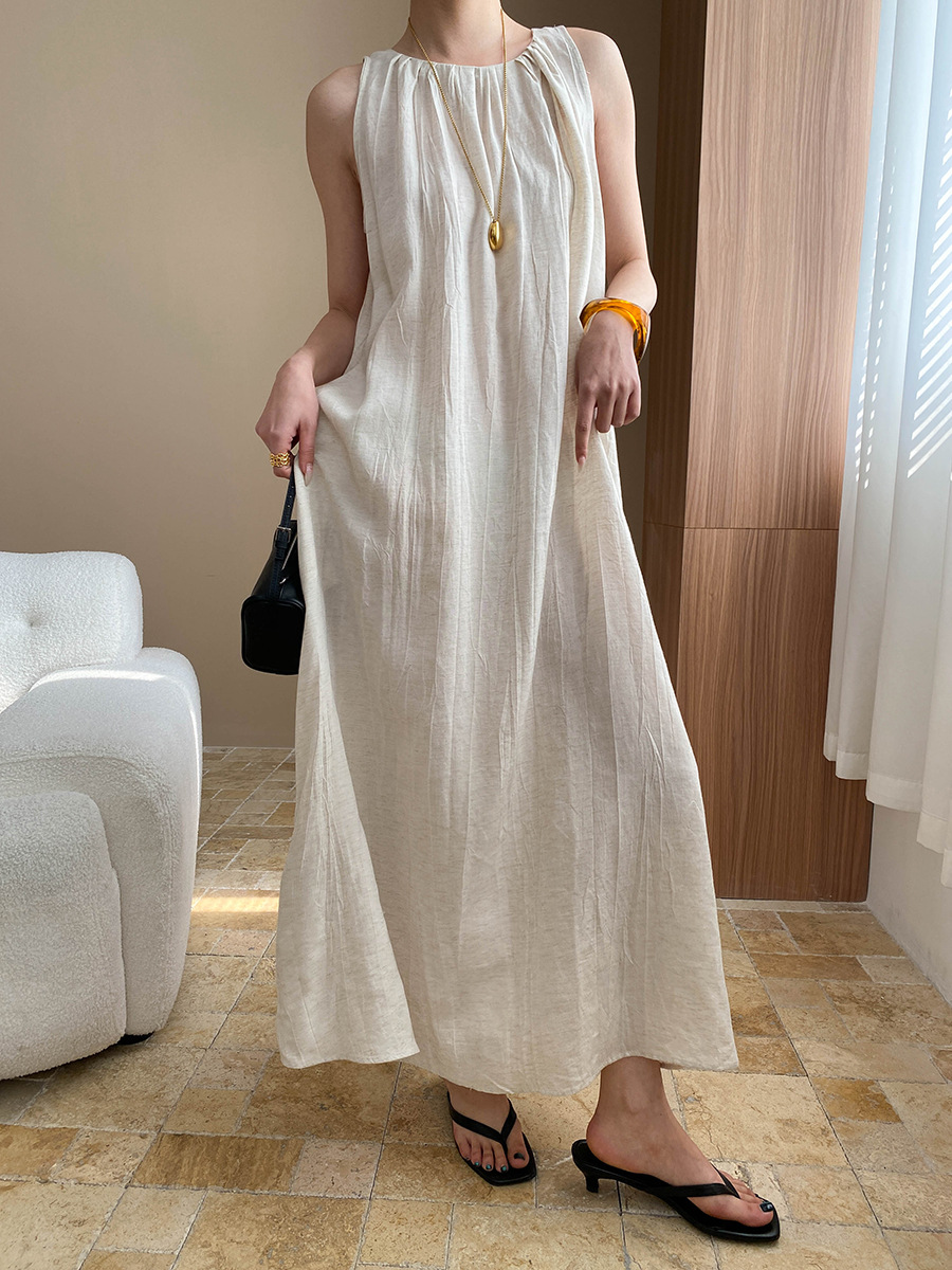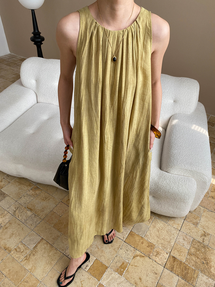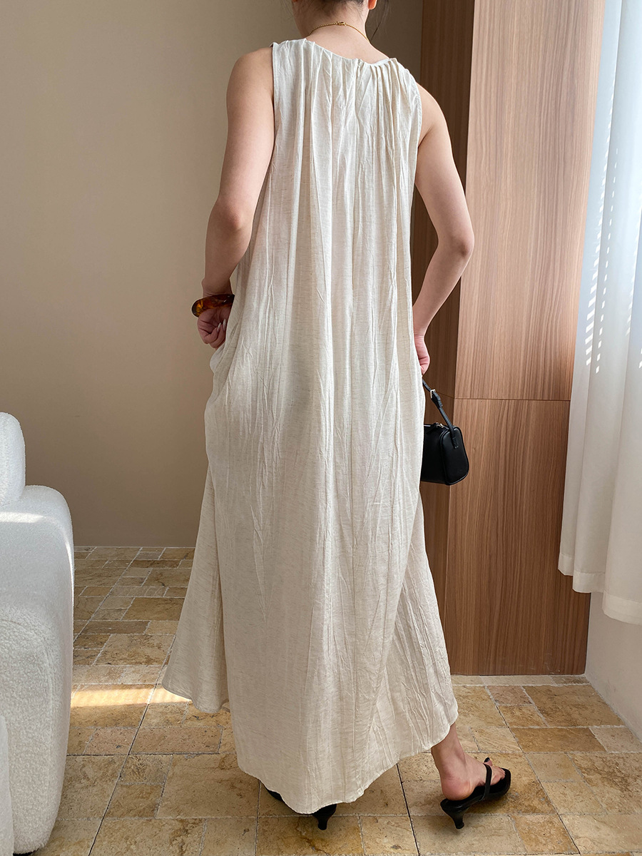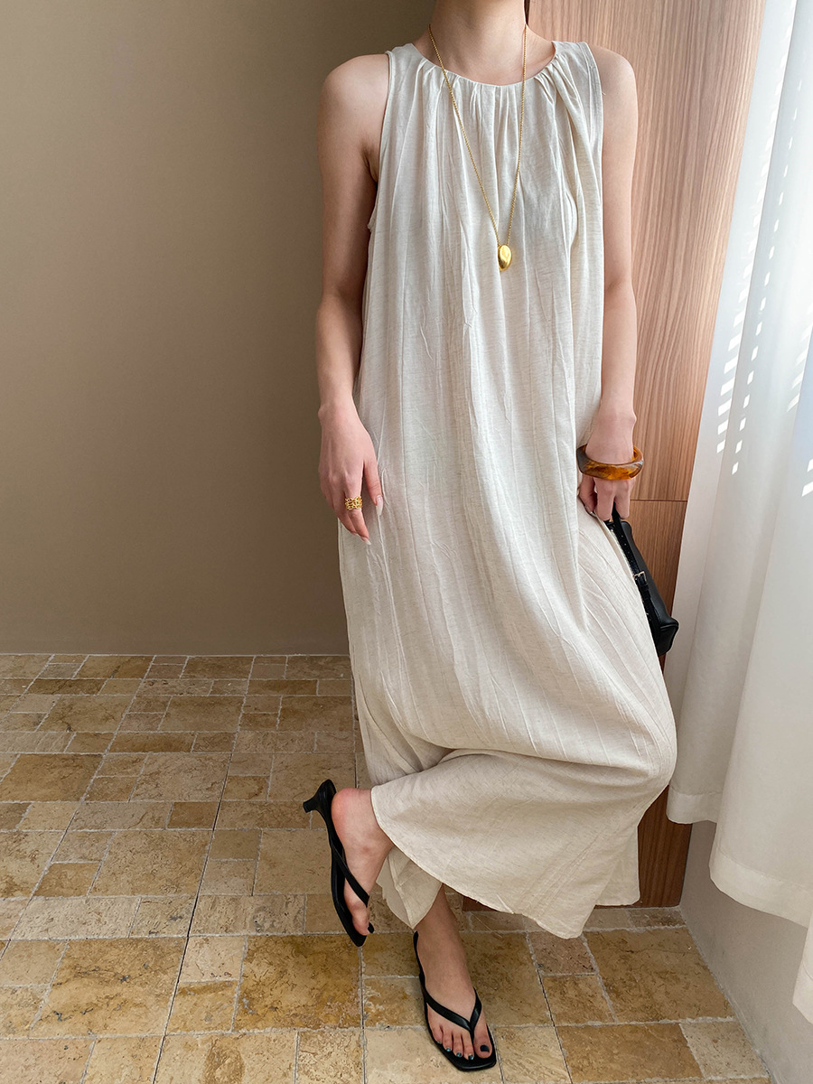 【ワンピース】リラックス感 ホリデースタイル クルーネック ギャザーデザイン ノースリーブワンピース【SNシリーズ】