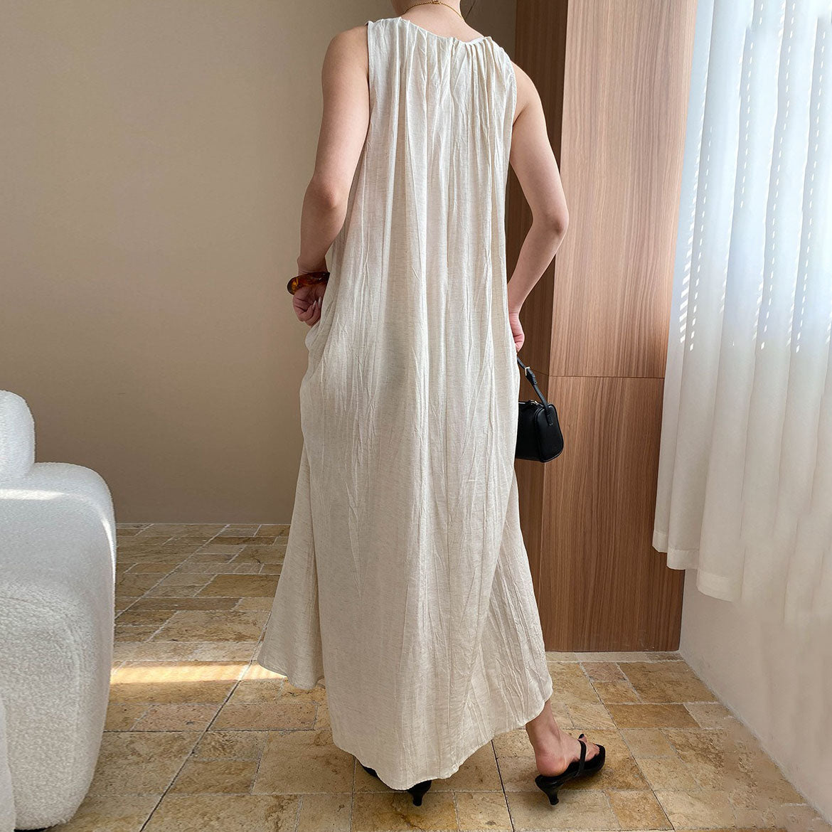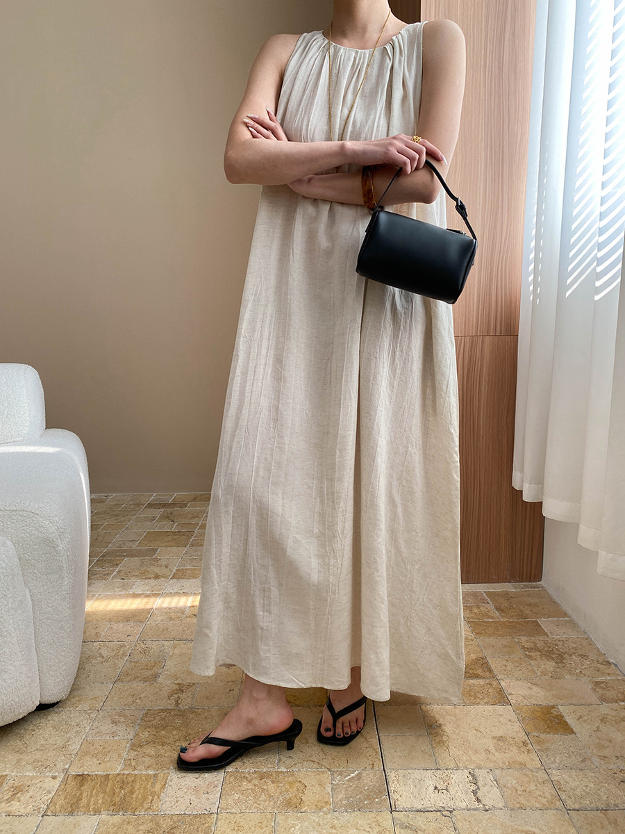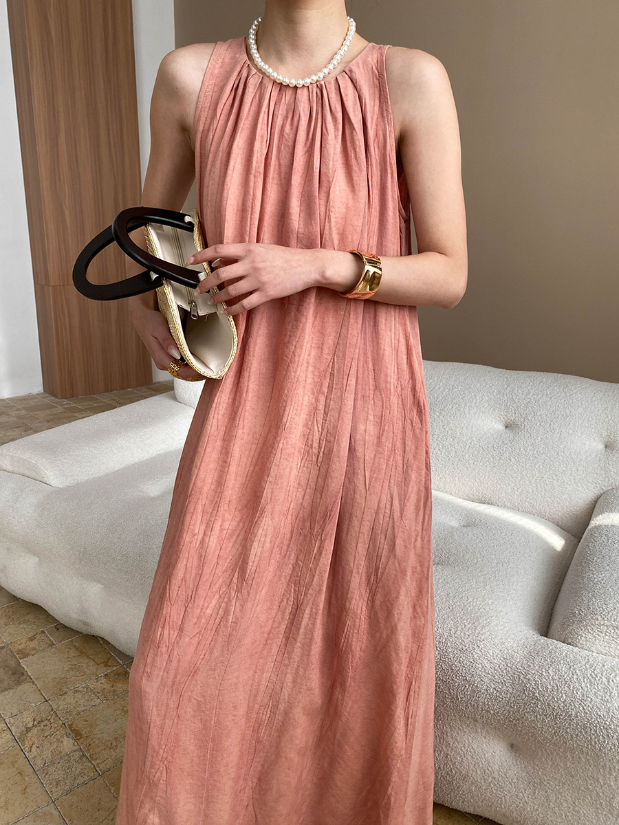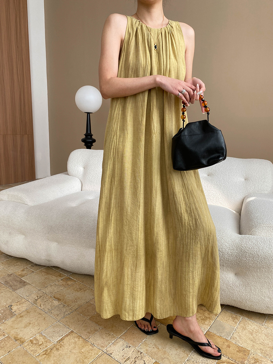 【ワンピース】リラックス感 ホリデースタイル クルーネック ギャザーデザイン ノースリーブワンピース【SNシリーズ】