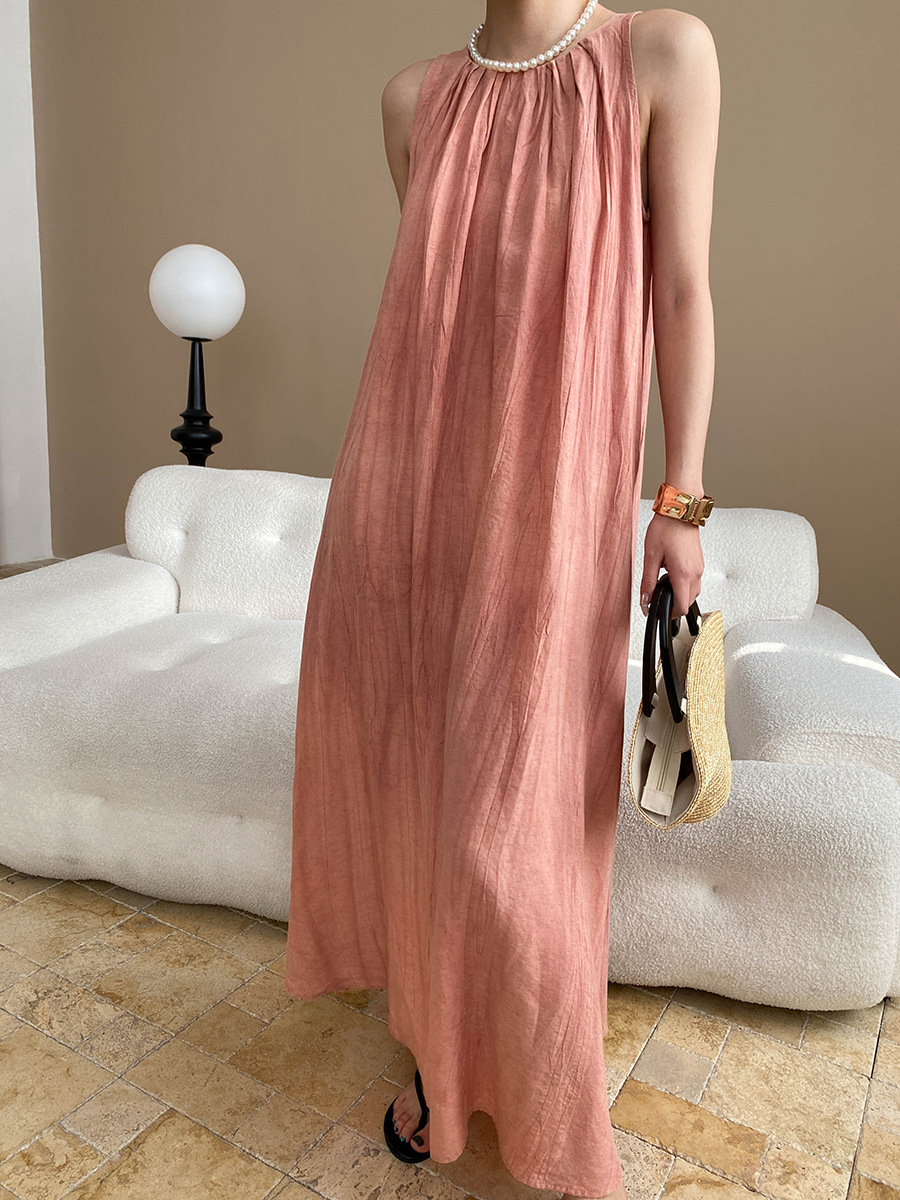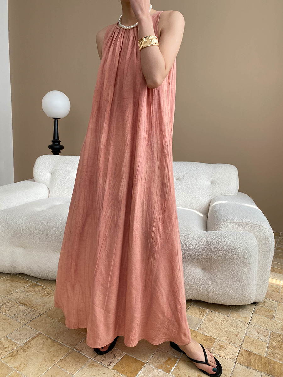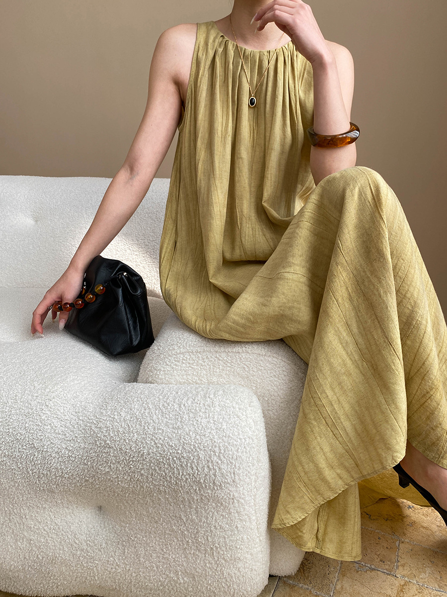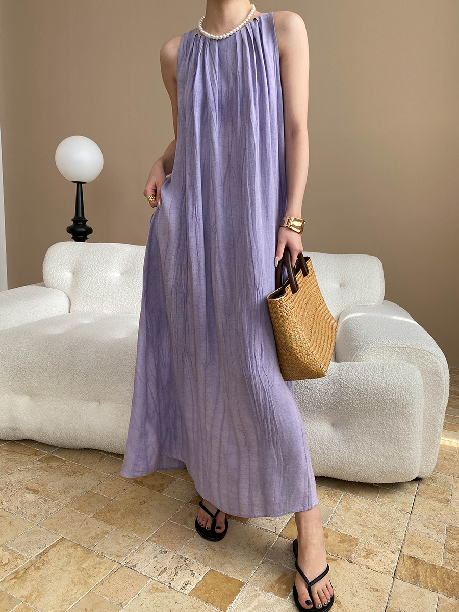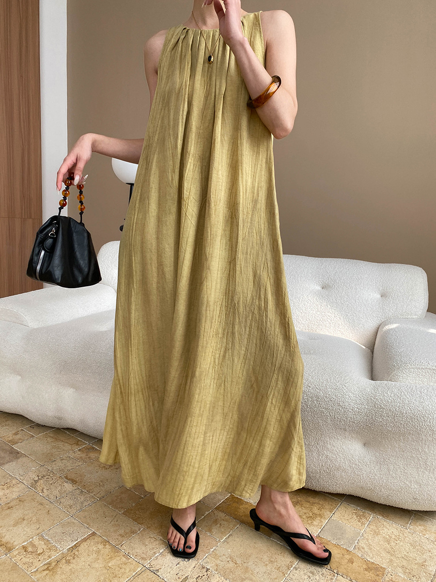 【ワンピース】リラックス感 ホリデースタイル クルーネック ギャザーデザイン ノースリーブワンピース【SNシリーズ】