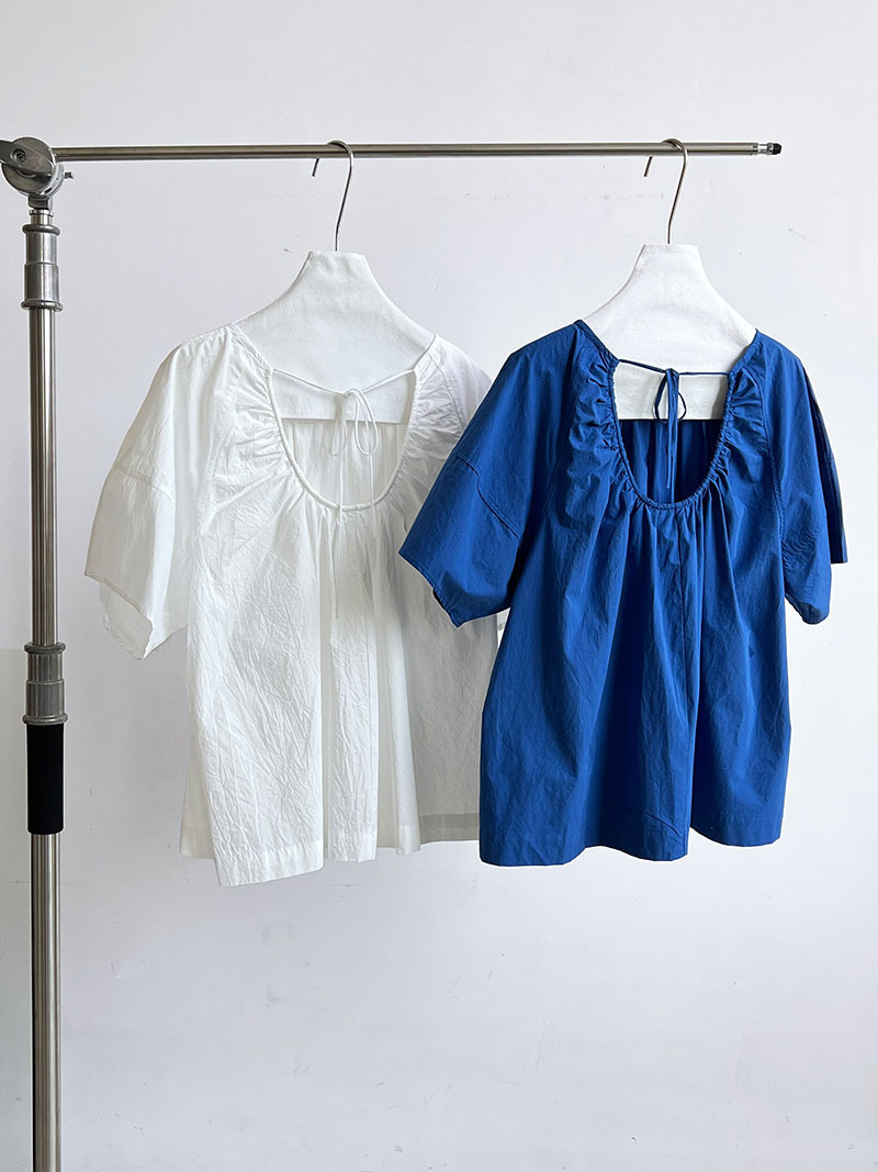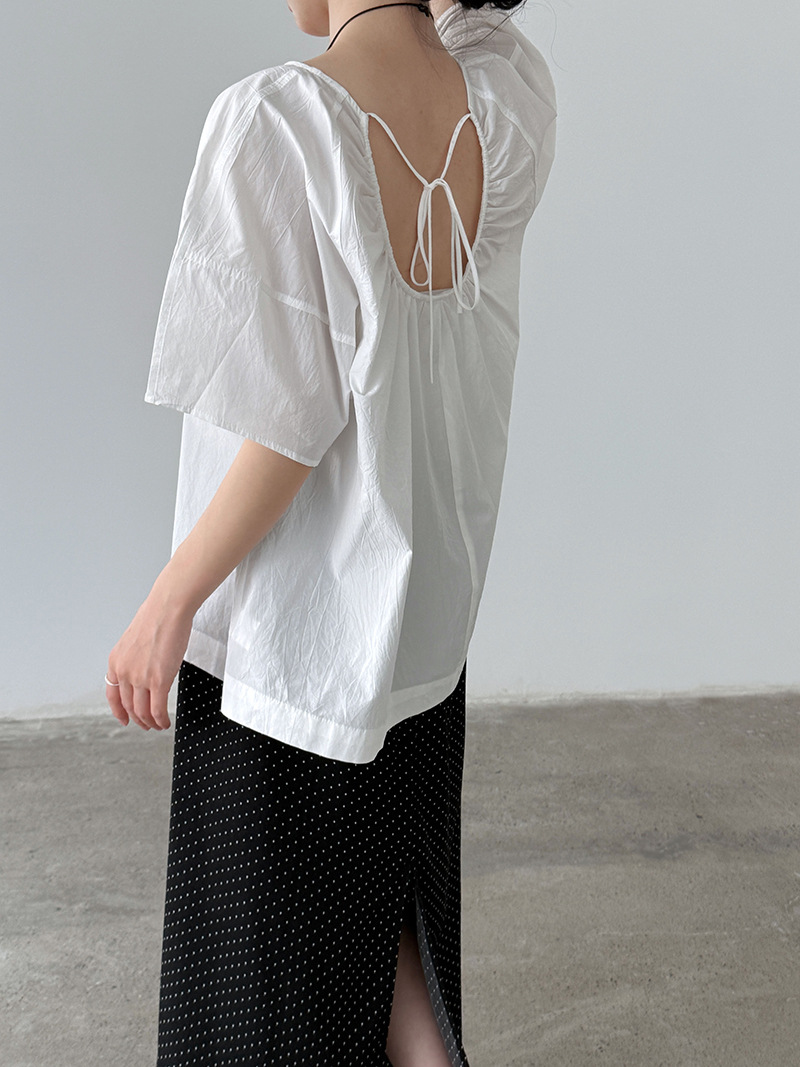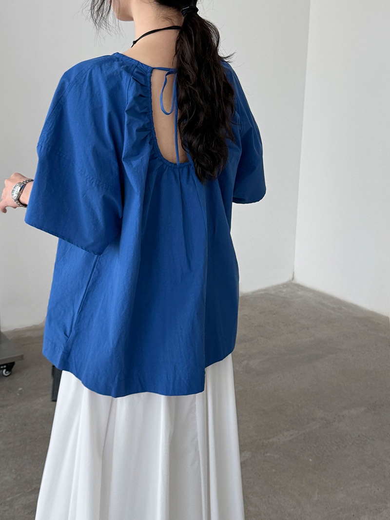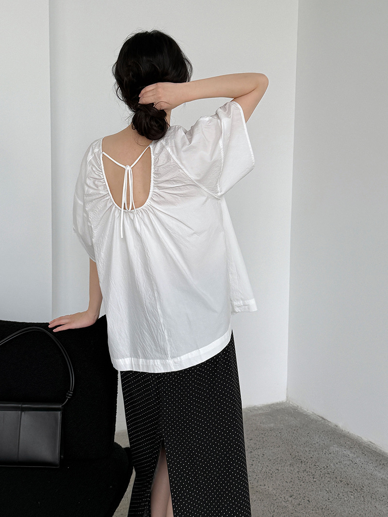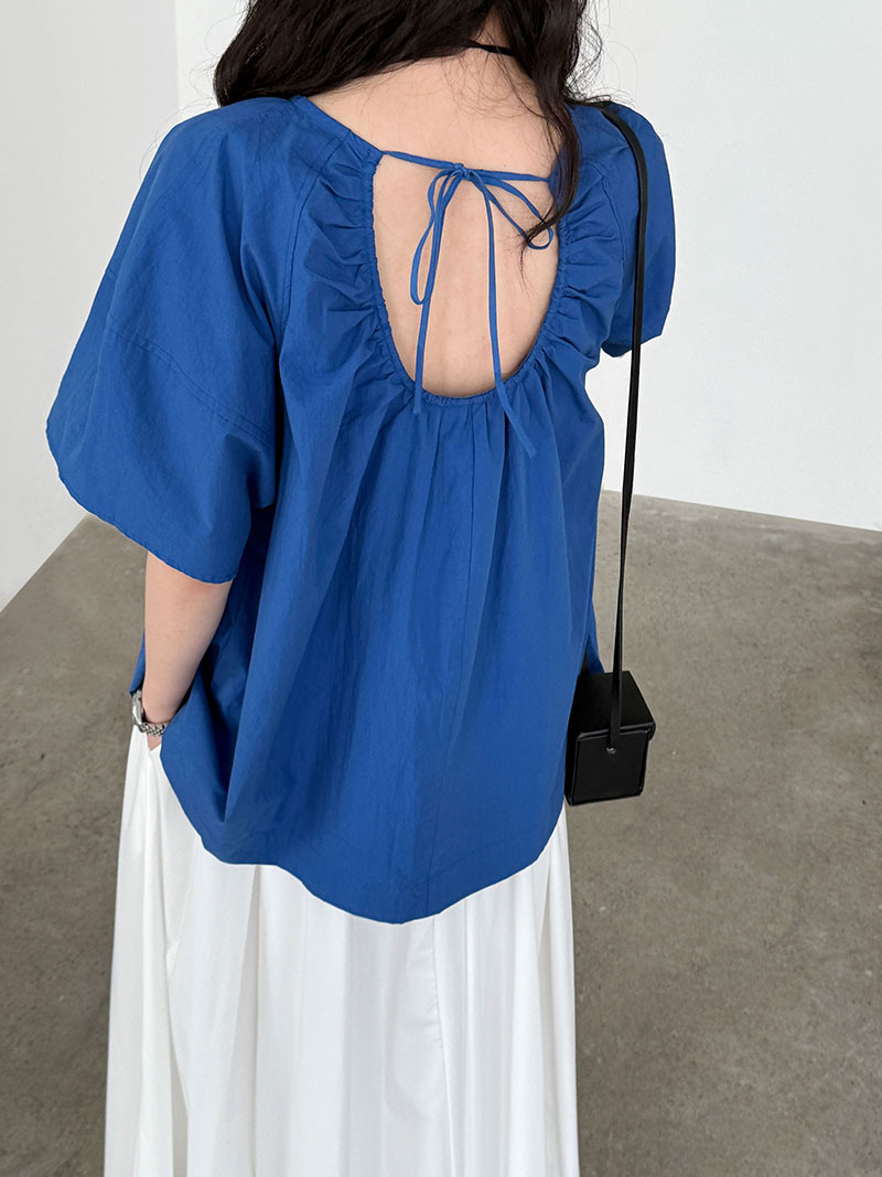 【トップス】韓国風 夏新作 ギャザー×バックオープン デザイン感ラウンドネック半袖ブラウス【SNシリーズ】