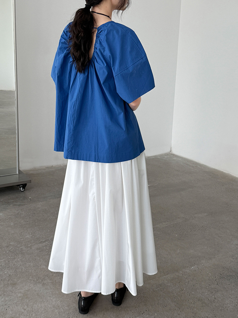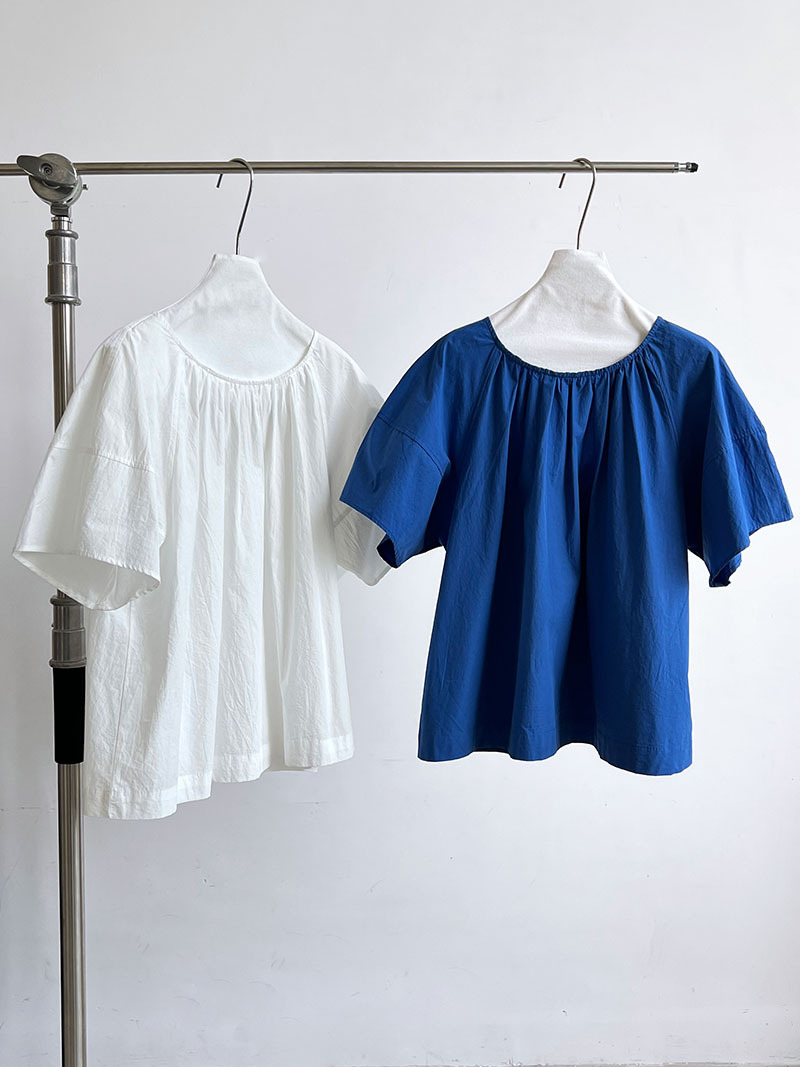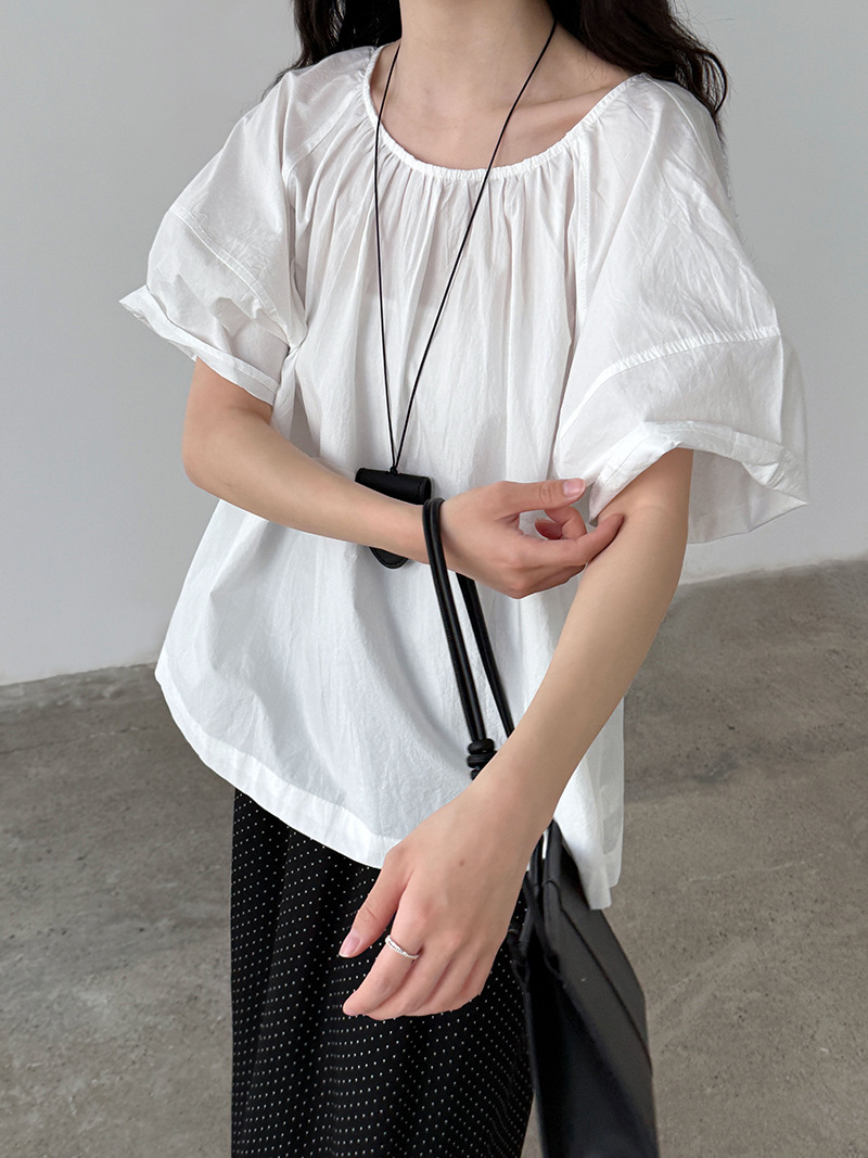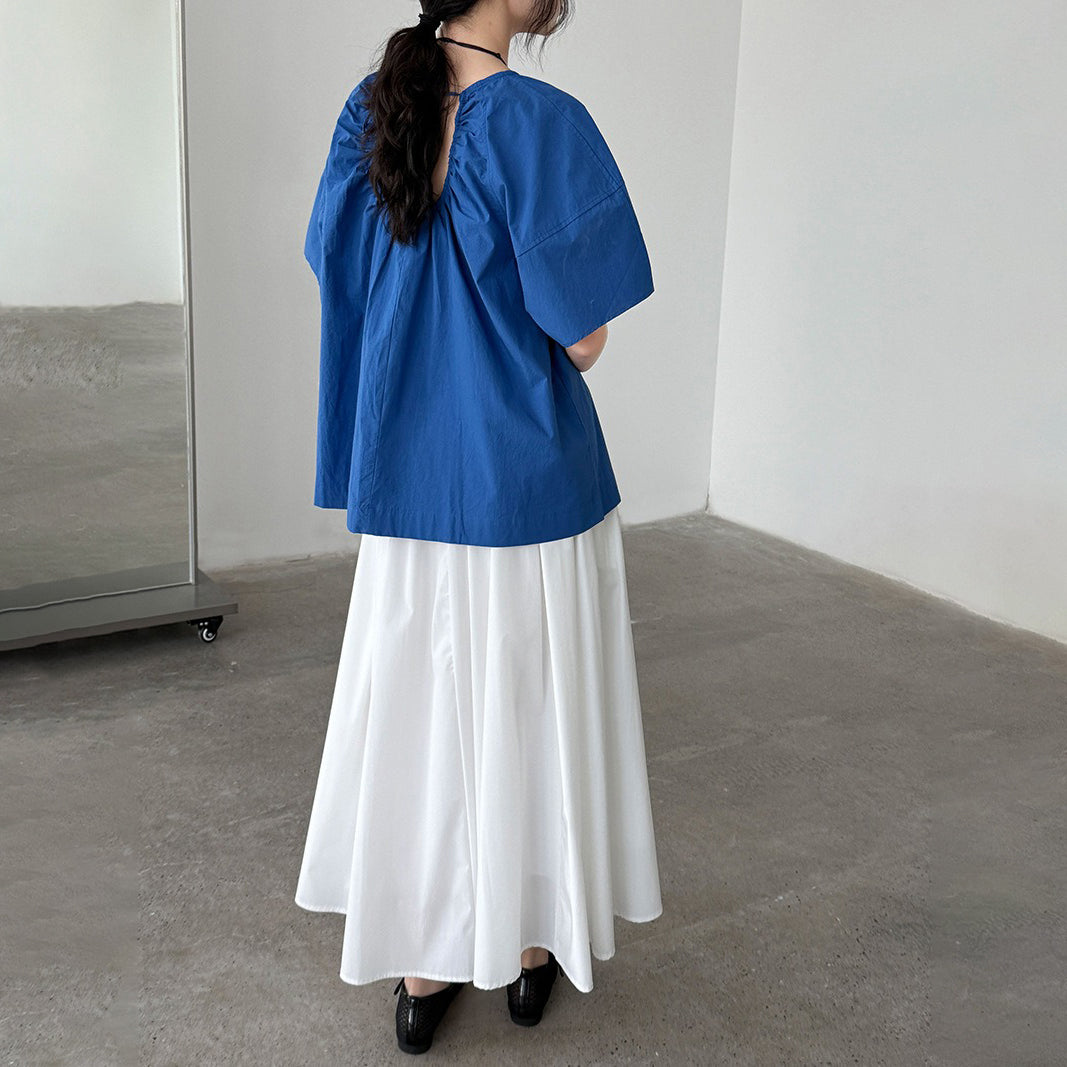 【トップス】韓国風 夏新作 ギャザー×バックオープン デザイン感ラウンドネック半袖ブラウス【SNシリーズ】