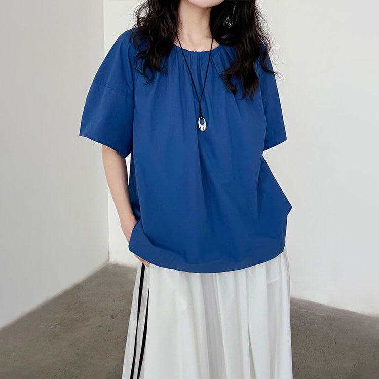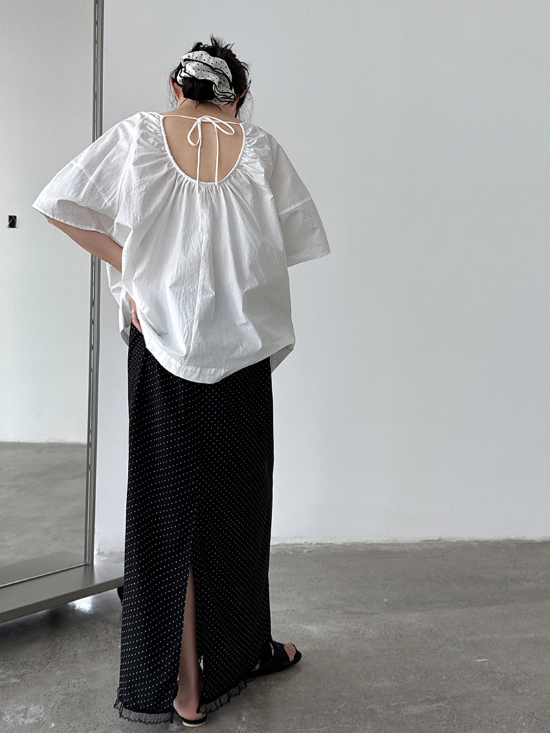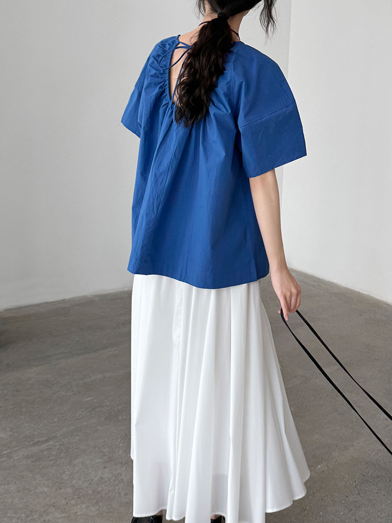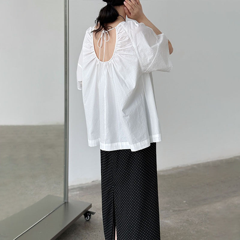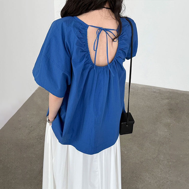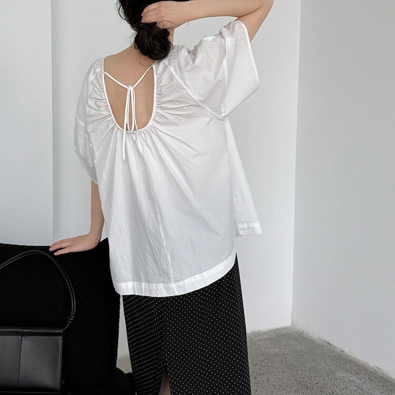 【商品名】【トップス】韓国風 夏新作 ギャザー×バックオープン デザイン感ラウンドネック半袖ブラウス【SNシリーズ】