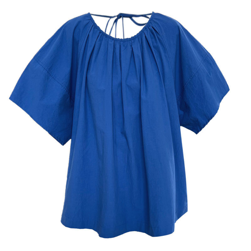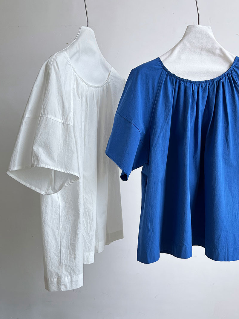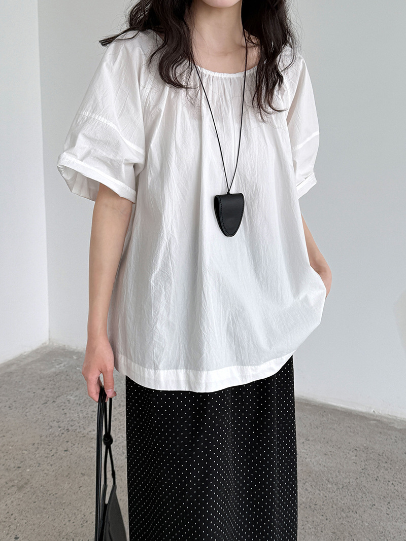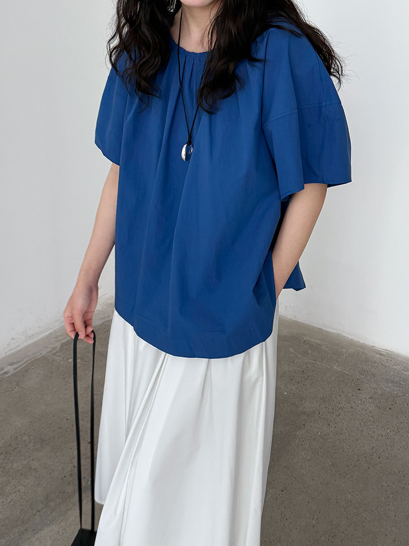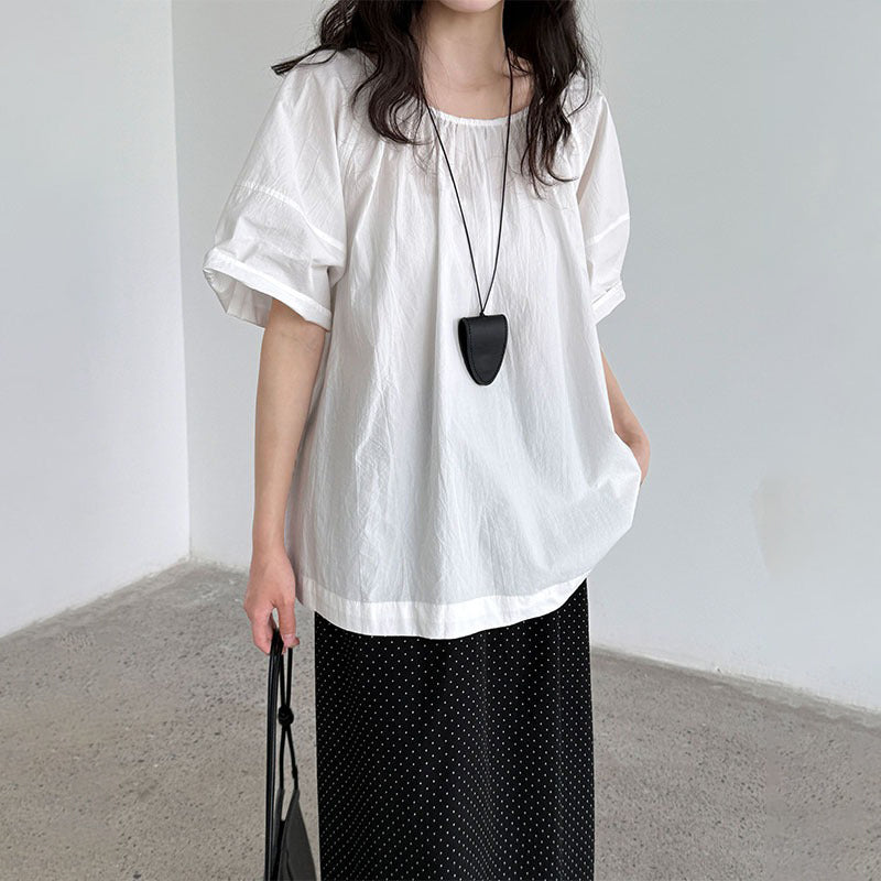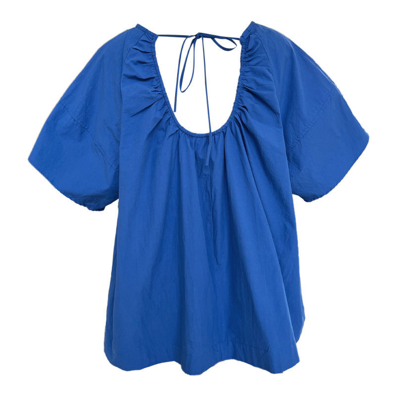 【商品名】【トップス】韓国風 夏新作 ギャザー×バックオープン デザイン感ラウンドネック半袖ブラウス【SNシリーズ】