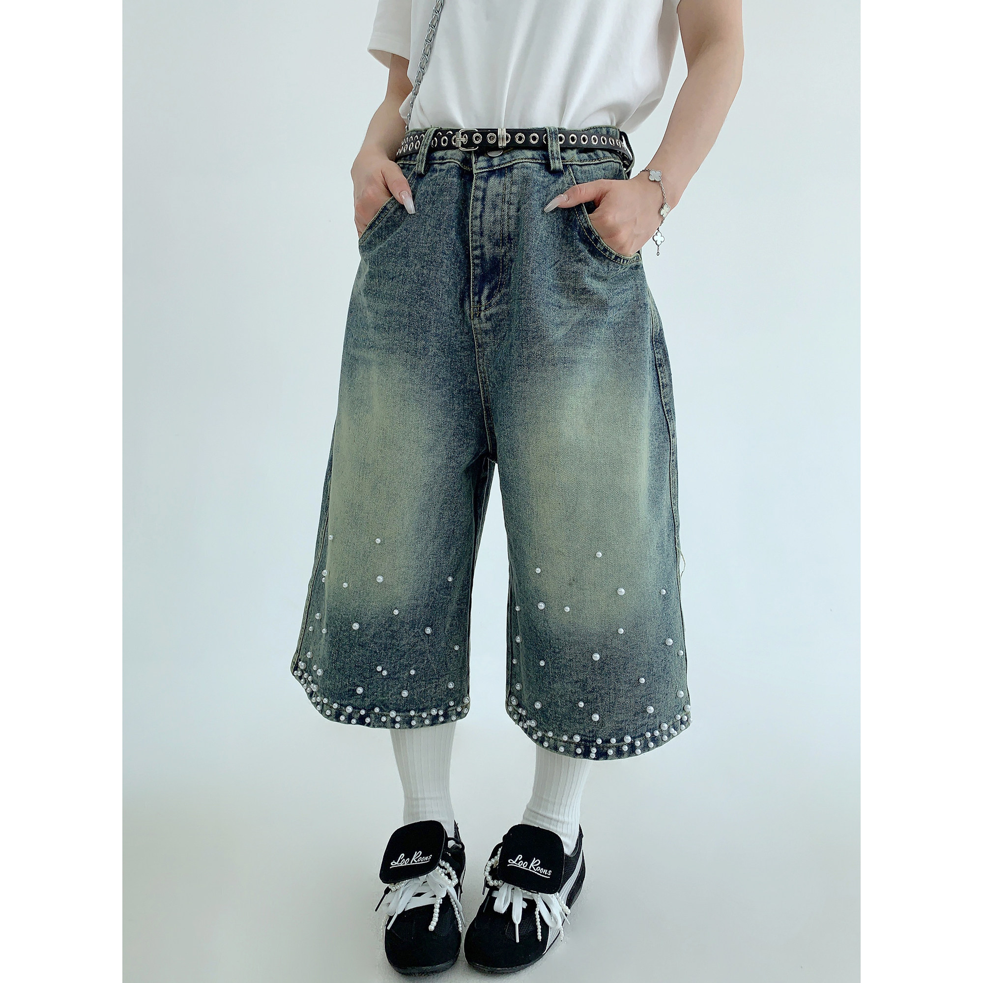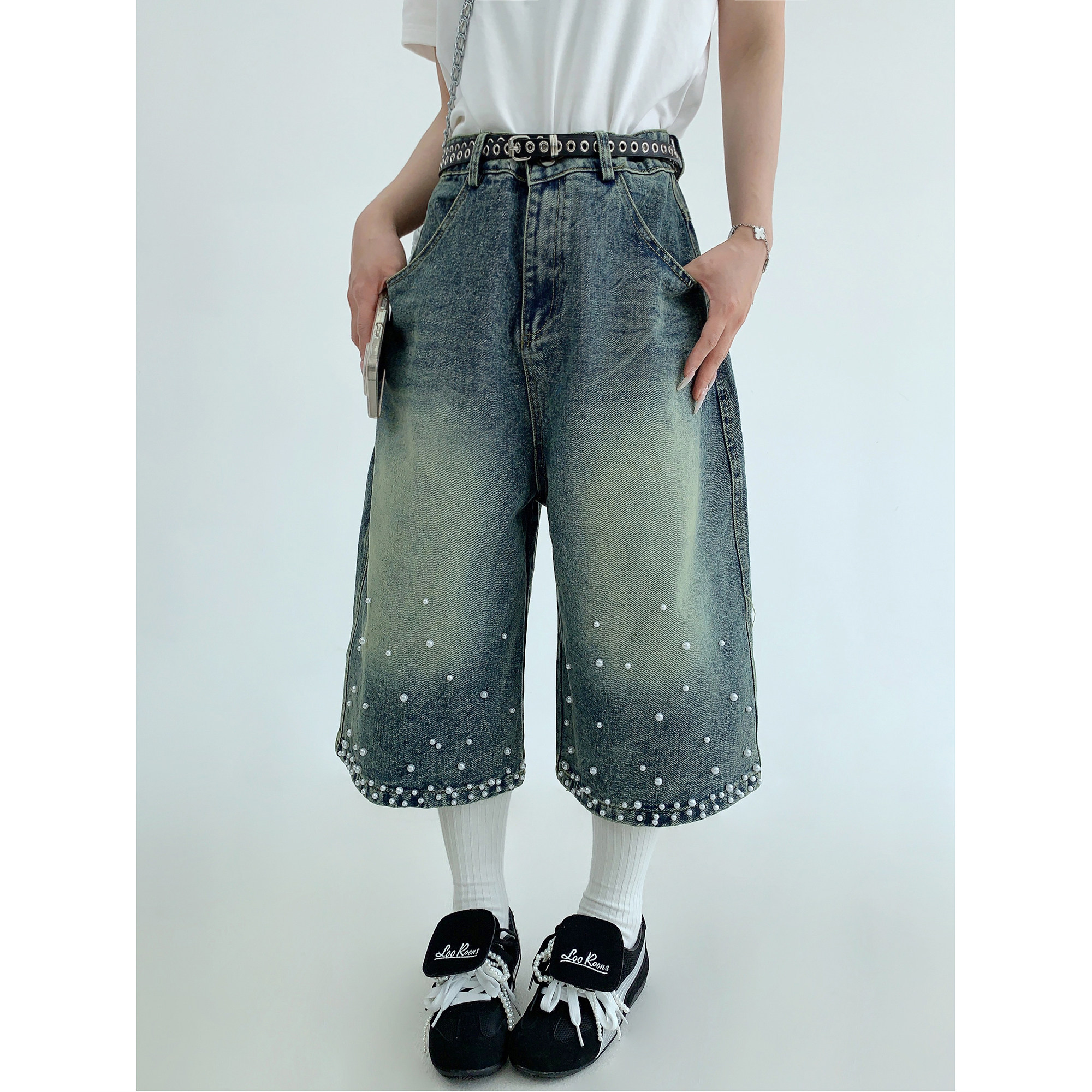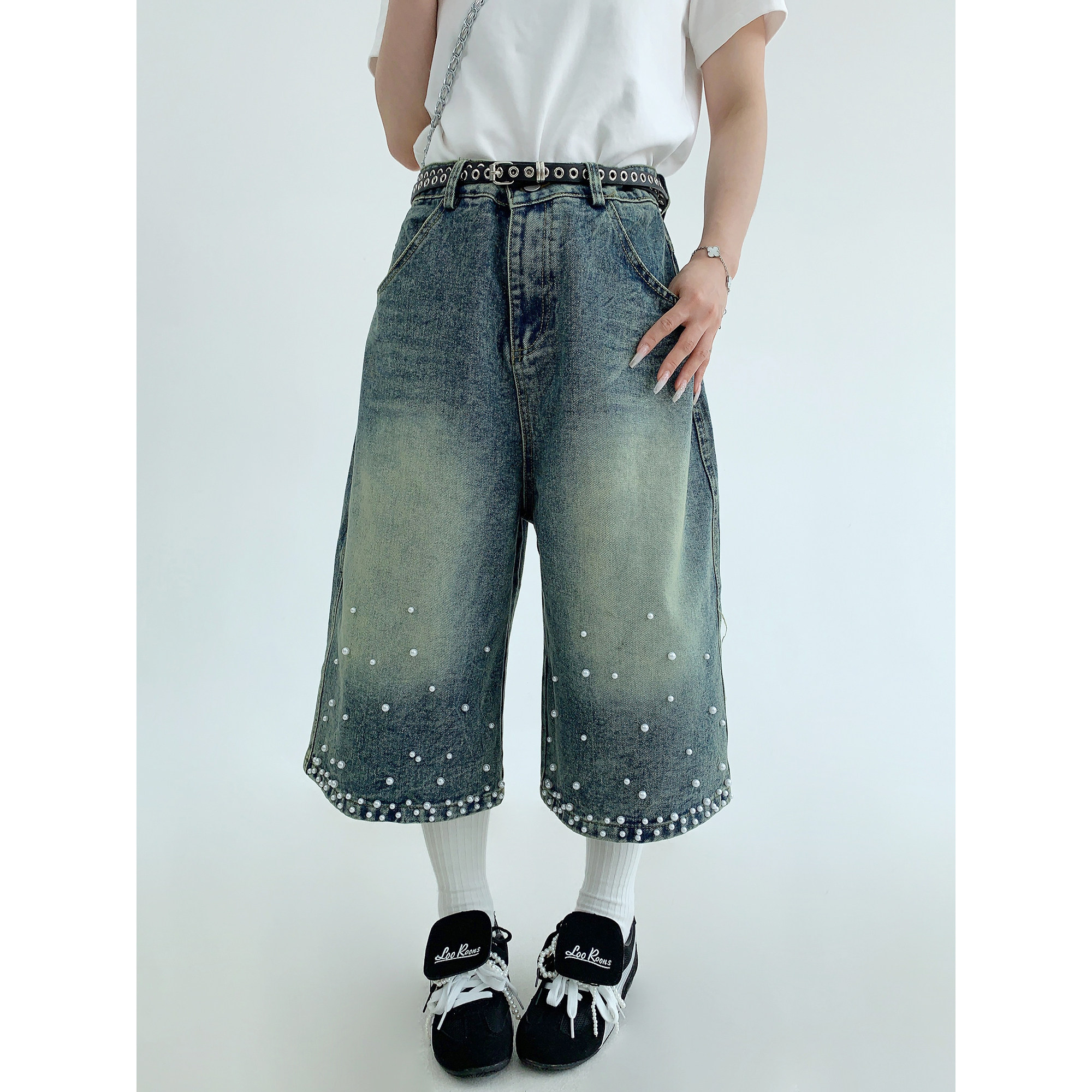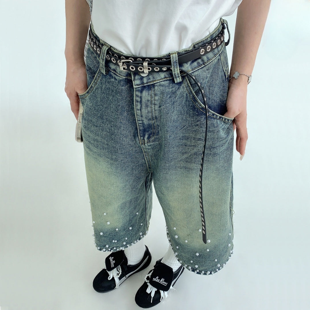 【商品名】【ボトムス】夏 【新品7折抢 4.17 20:00】废柴小众重工水洗做旧钉珠牛仔七分裤【【FCシリーズ】