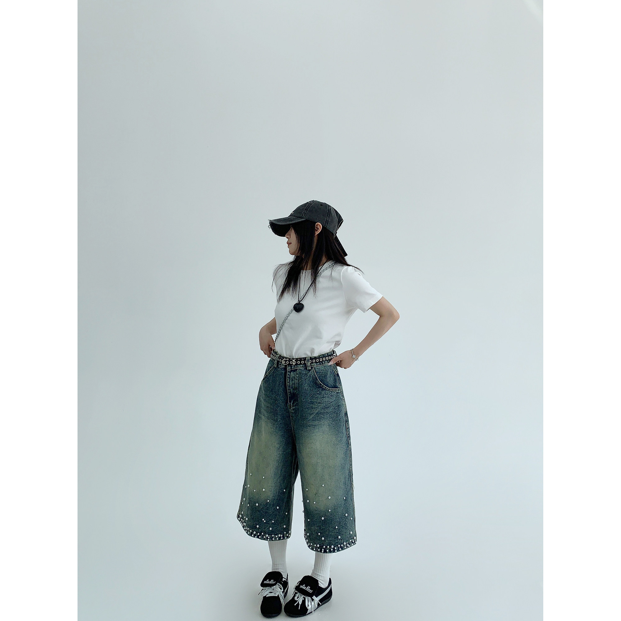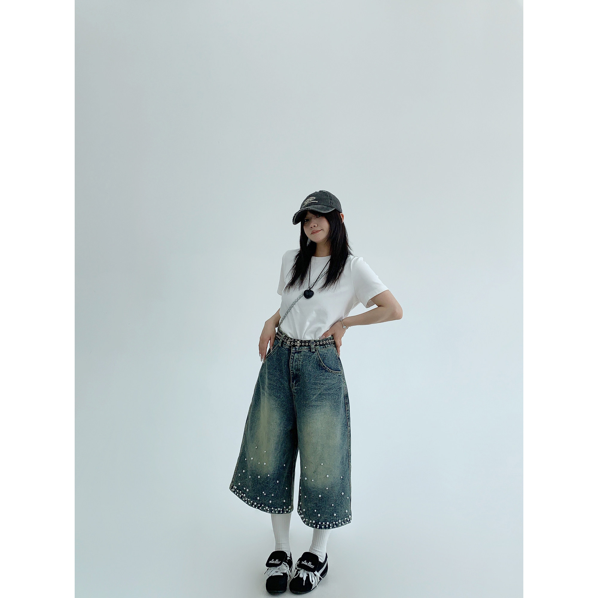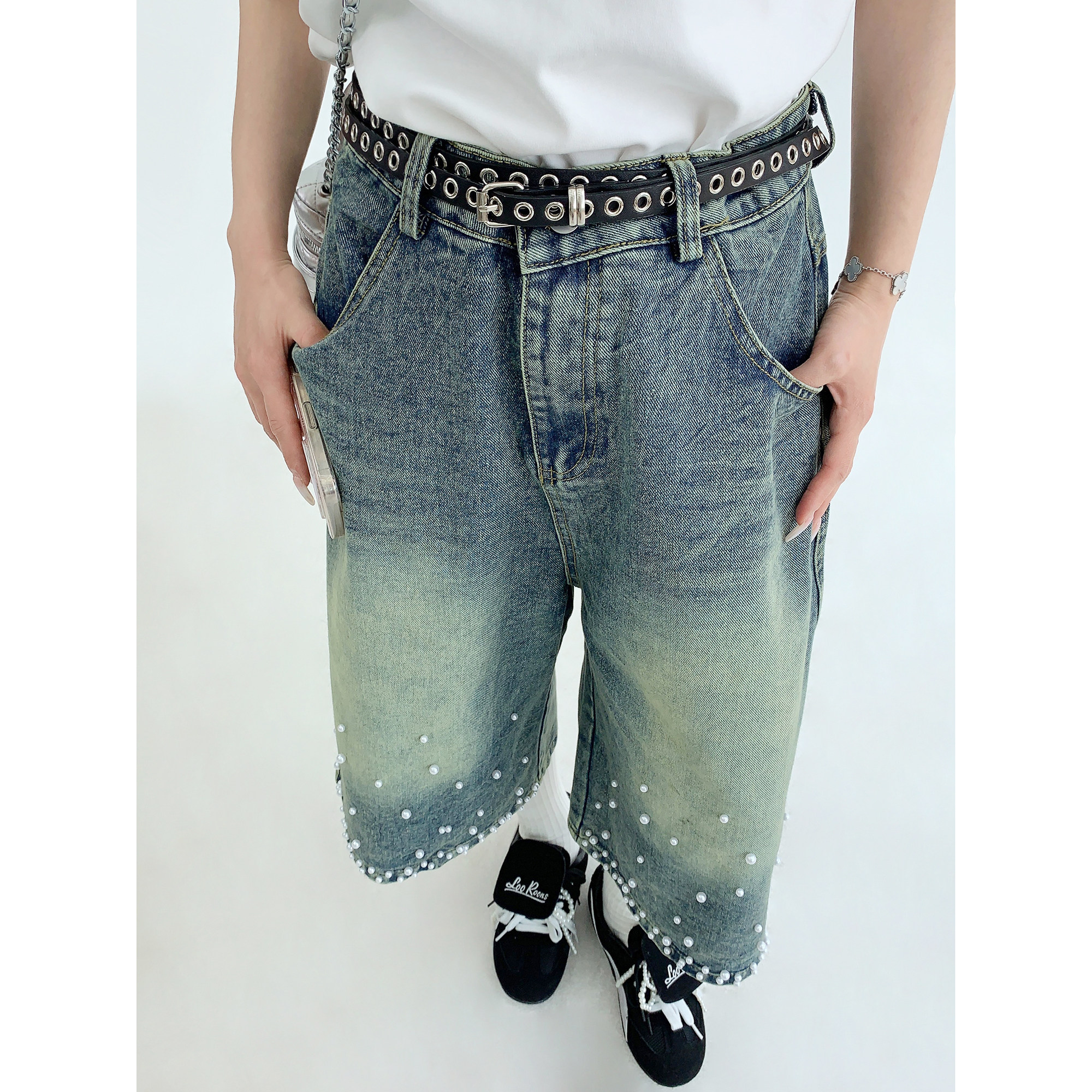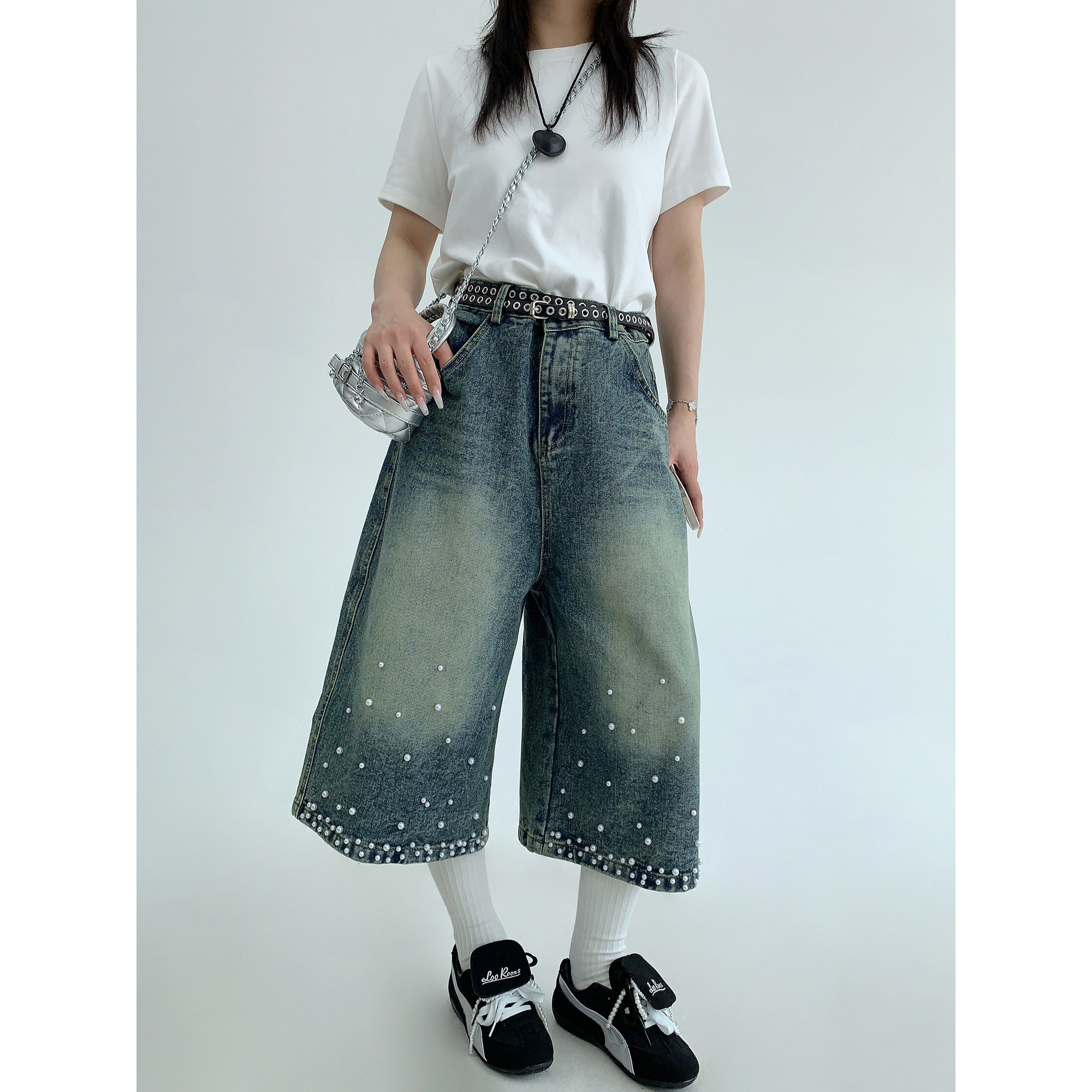 【商品名】【ボトムス】夏 【新品7折抢 4.17 20:00】废柴小众重工水洗做旧钉珠牛仔七分裤【【FCシリーズ】