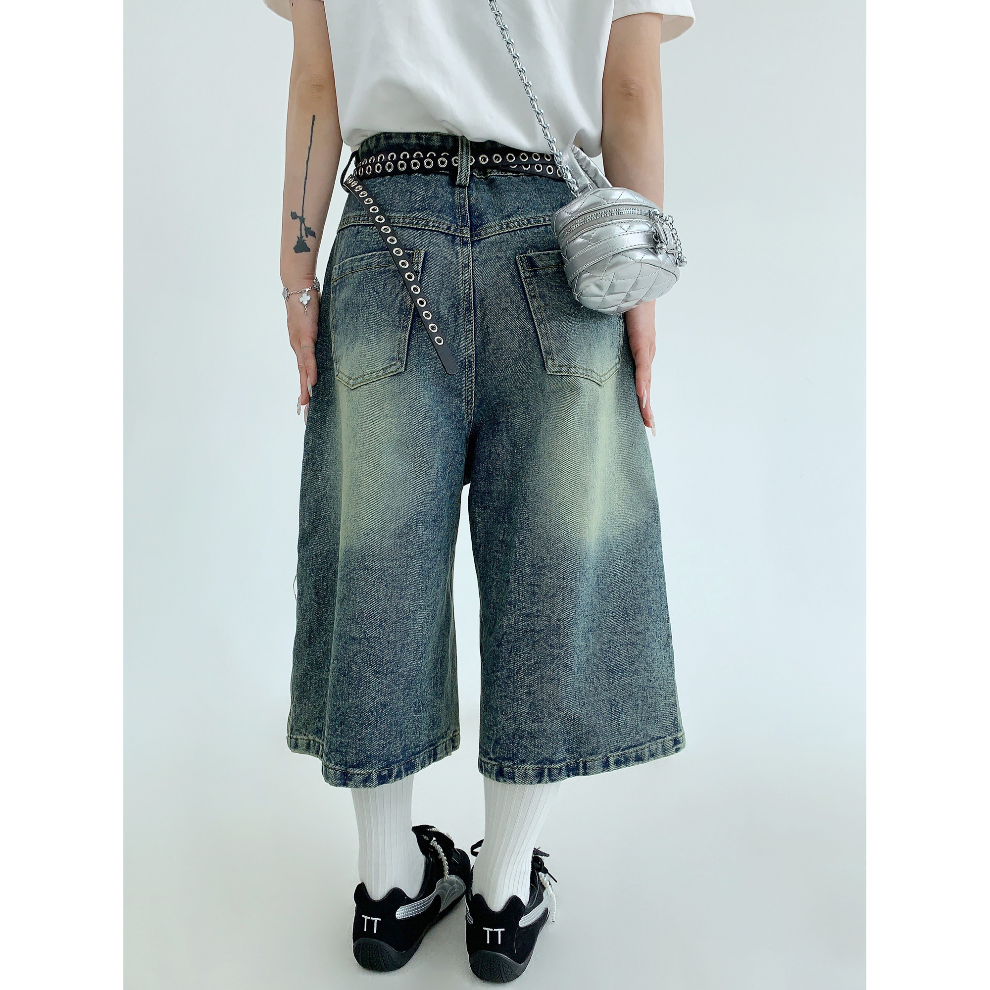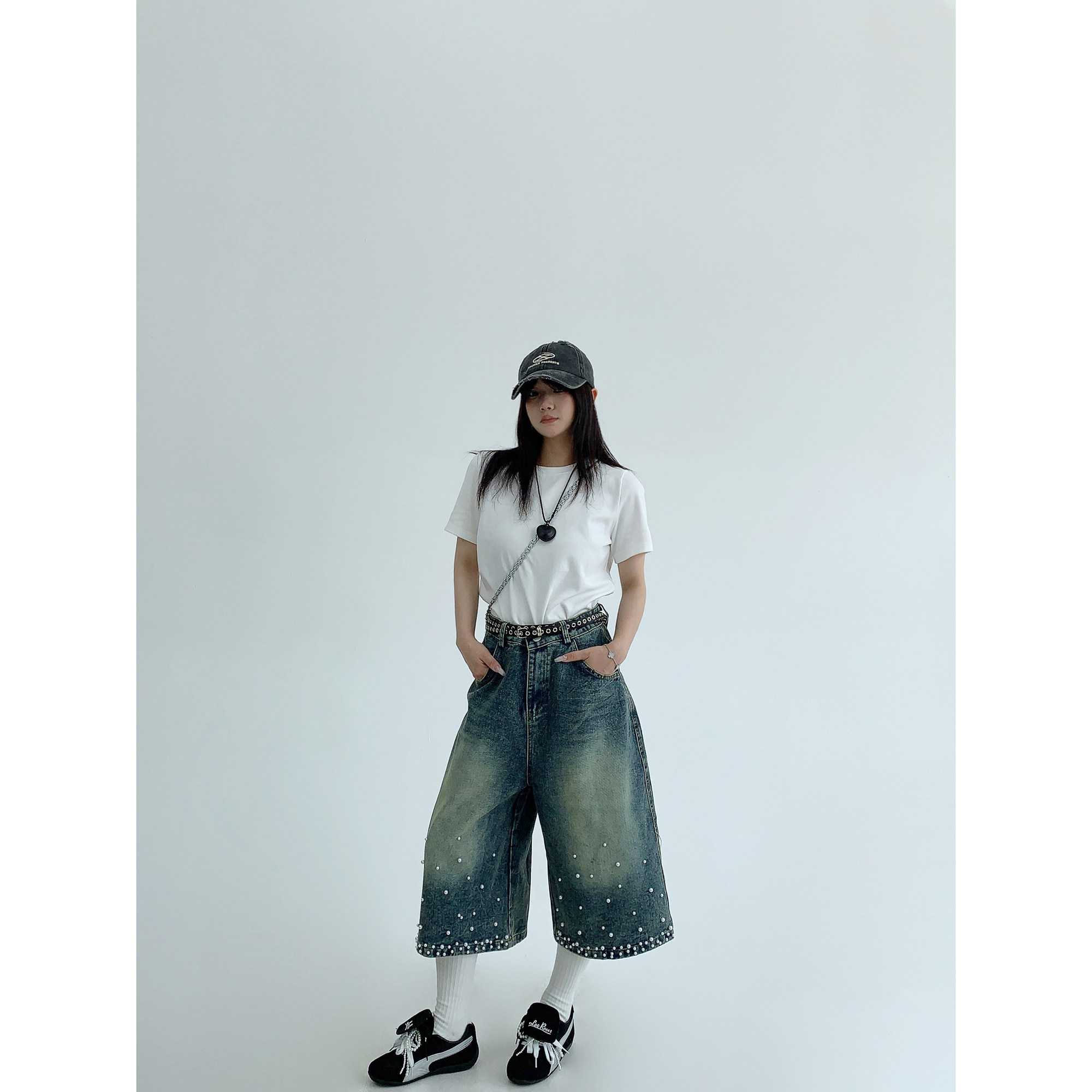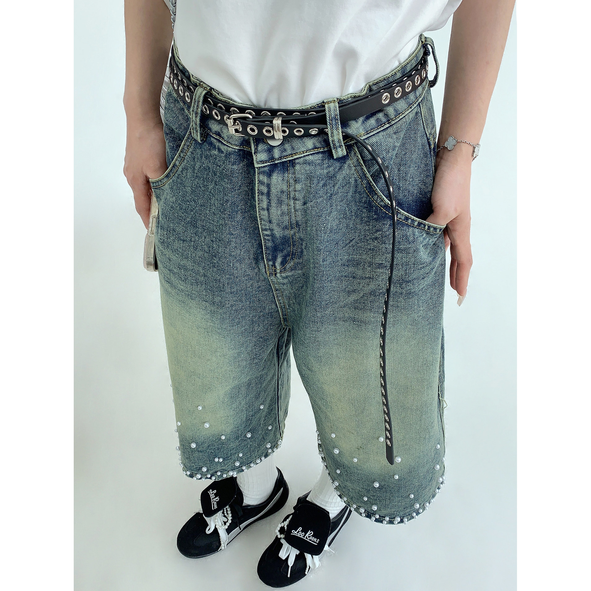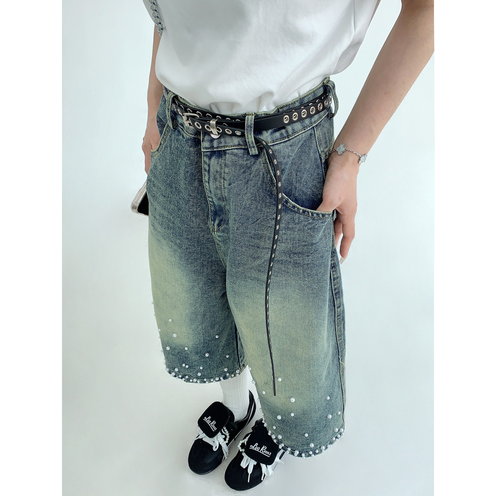 【商品名】【ボトムス】夏 【新品7折抢 4.17 20:00】废柴小众重工水洗做旧钉珠牛仔七分裤【【FCシリーズ】