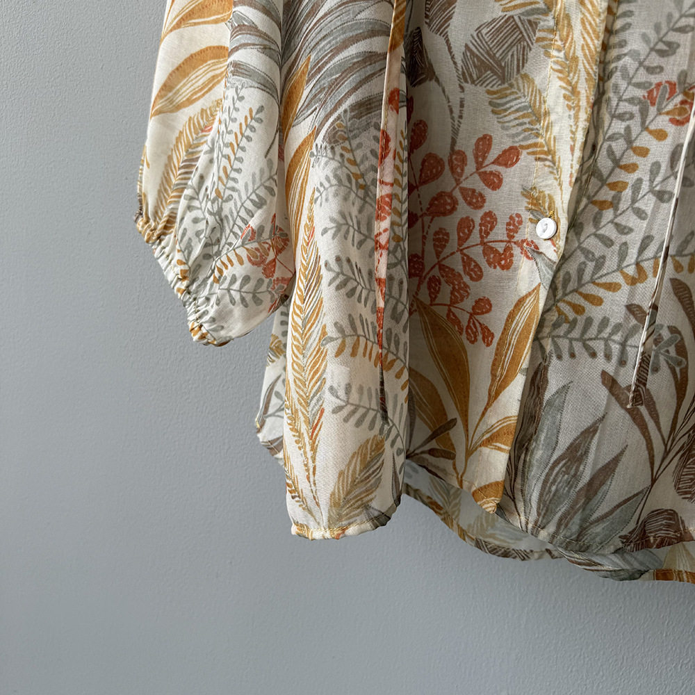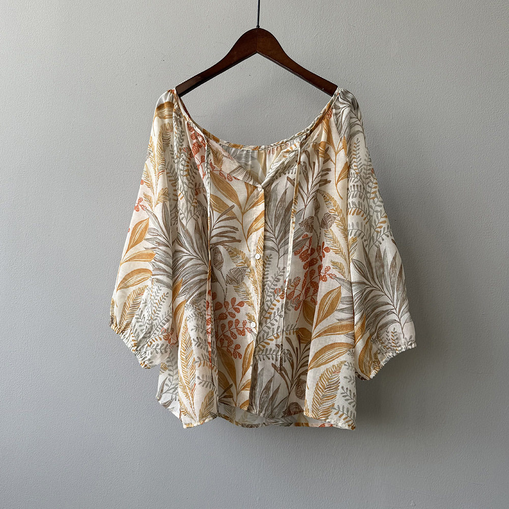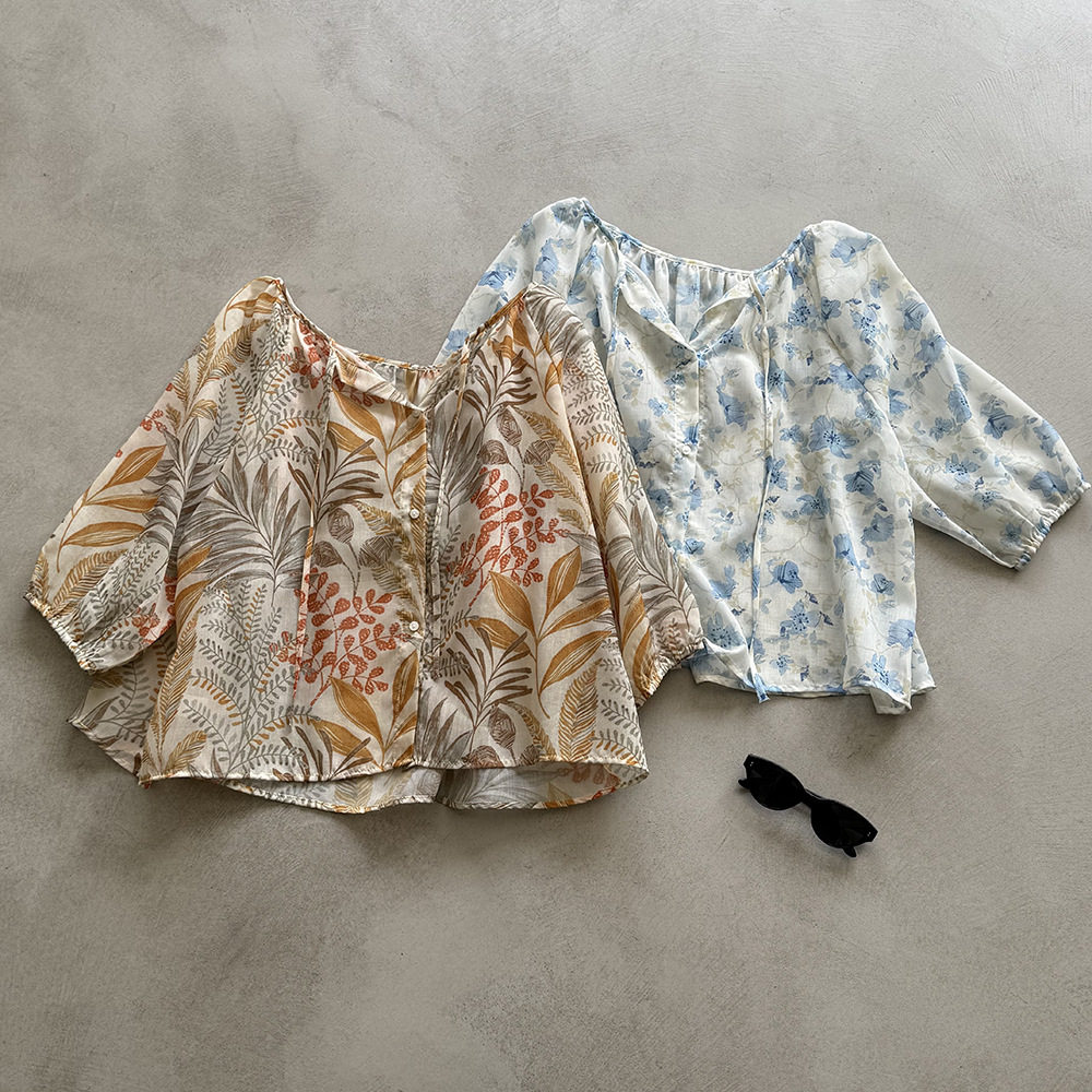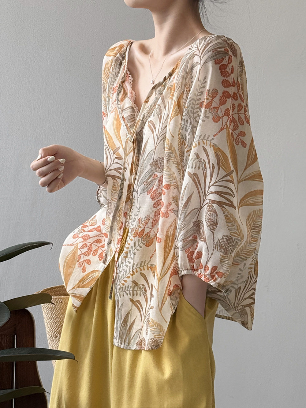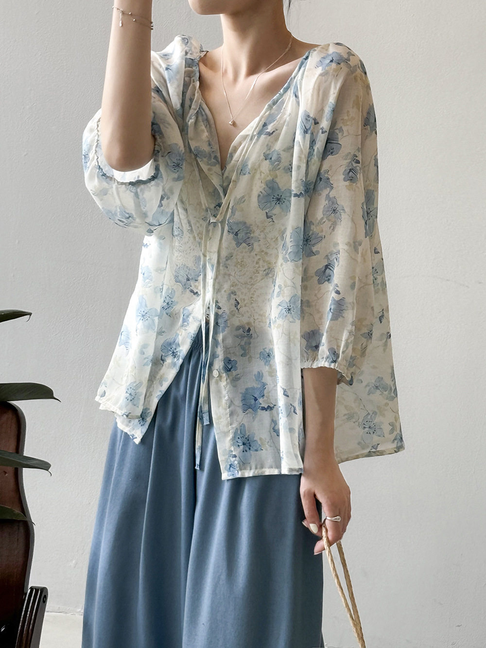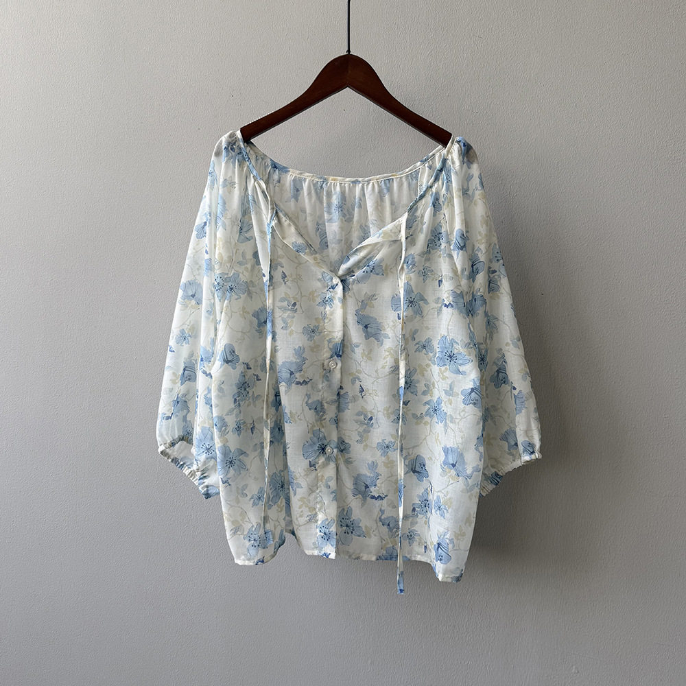 【トップス】韓国風Vネックリボン付き フラワープリントシャツ ゆったりシルエット 七分袖ブラウス【JZシリーズ】【SHシリーズ】