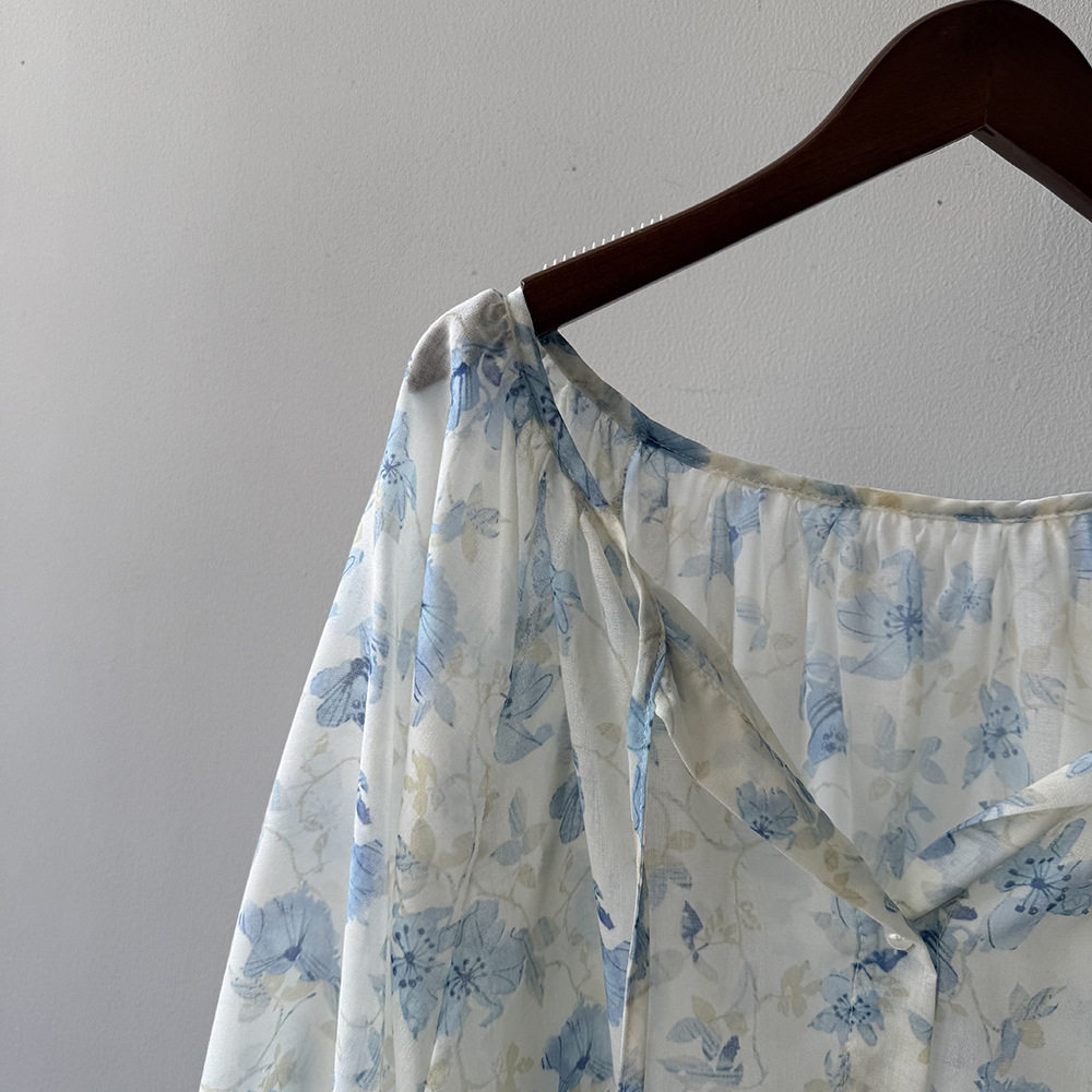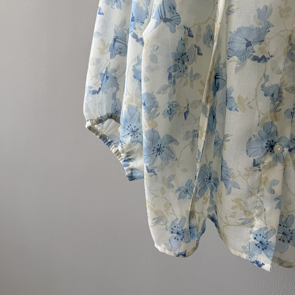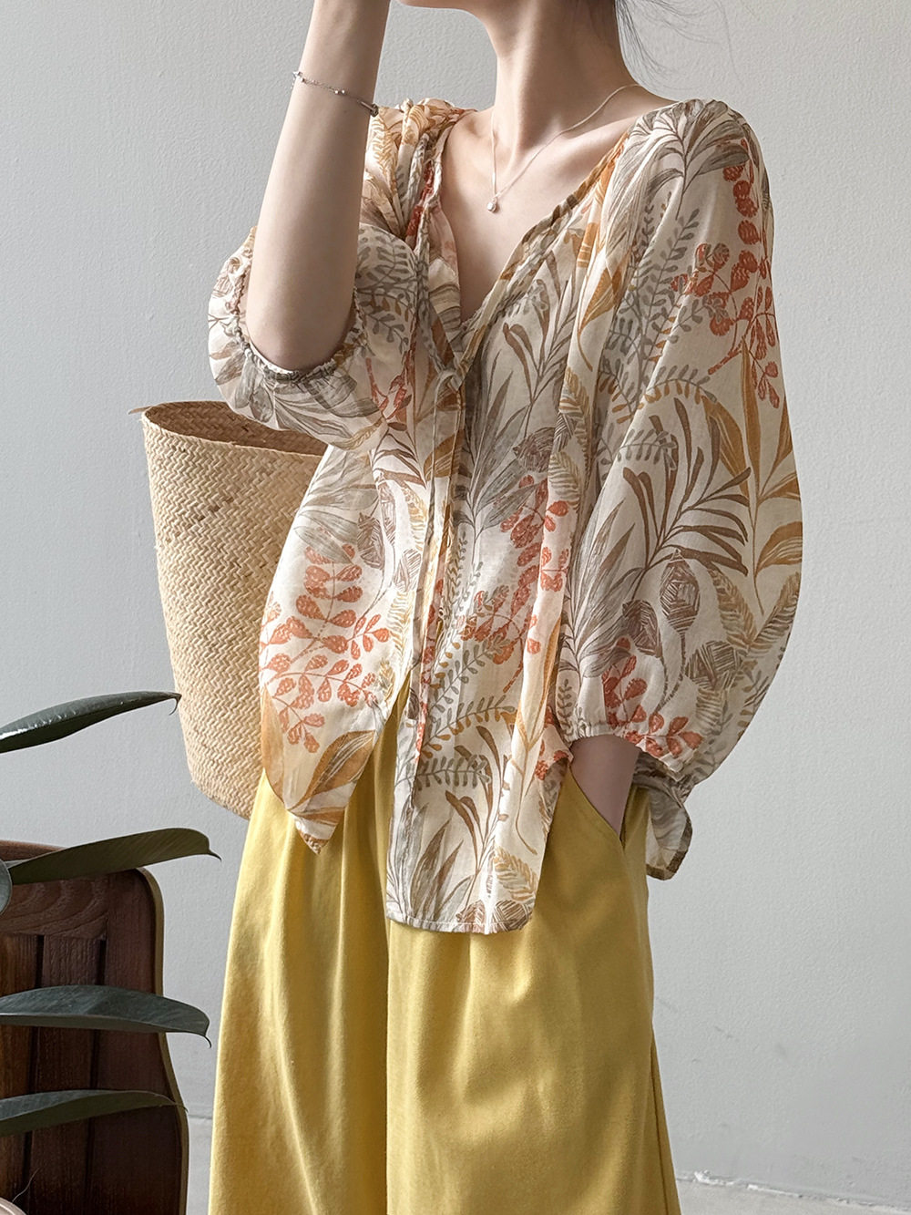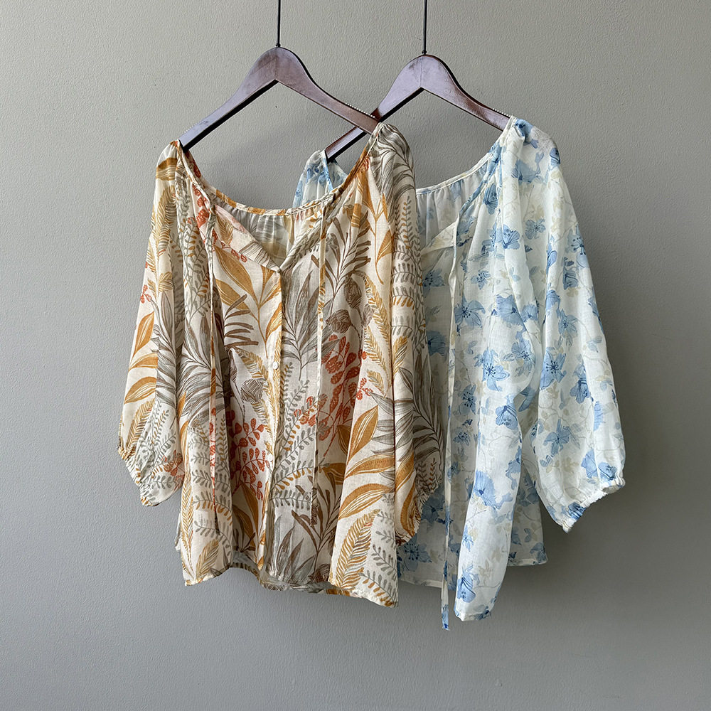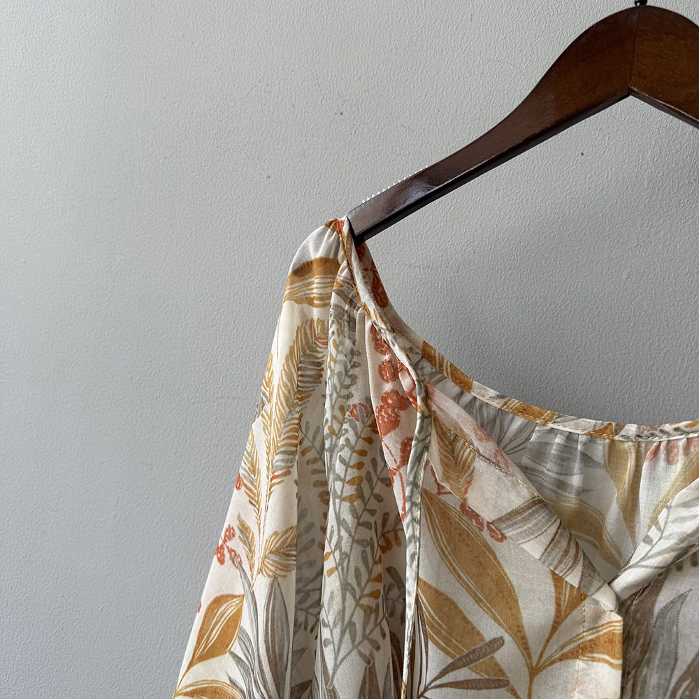【トップス】韓国風Vネックリボン付き フラワープリントシャツ ゆったりシルエット 七分袖ブラウス【JZシリーズ】【SHシリーズ】