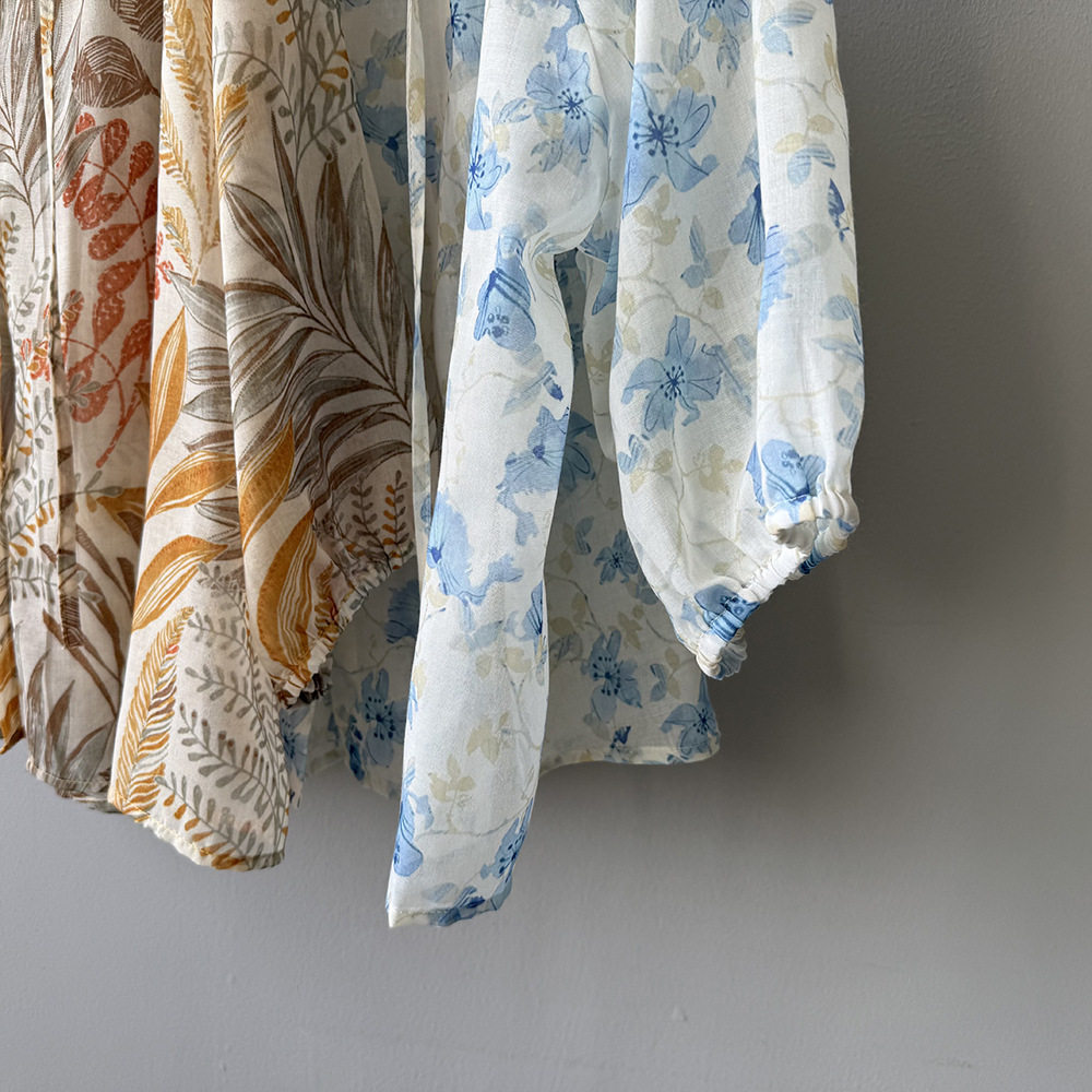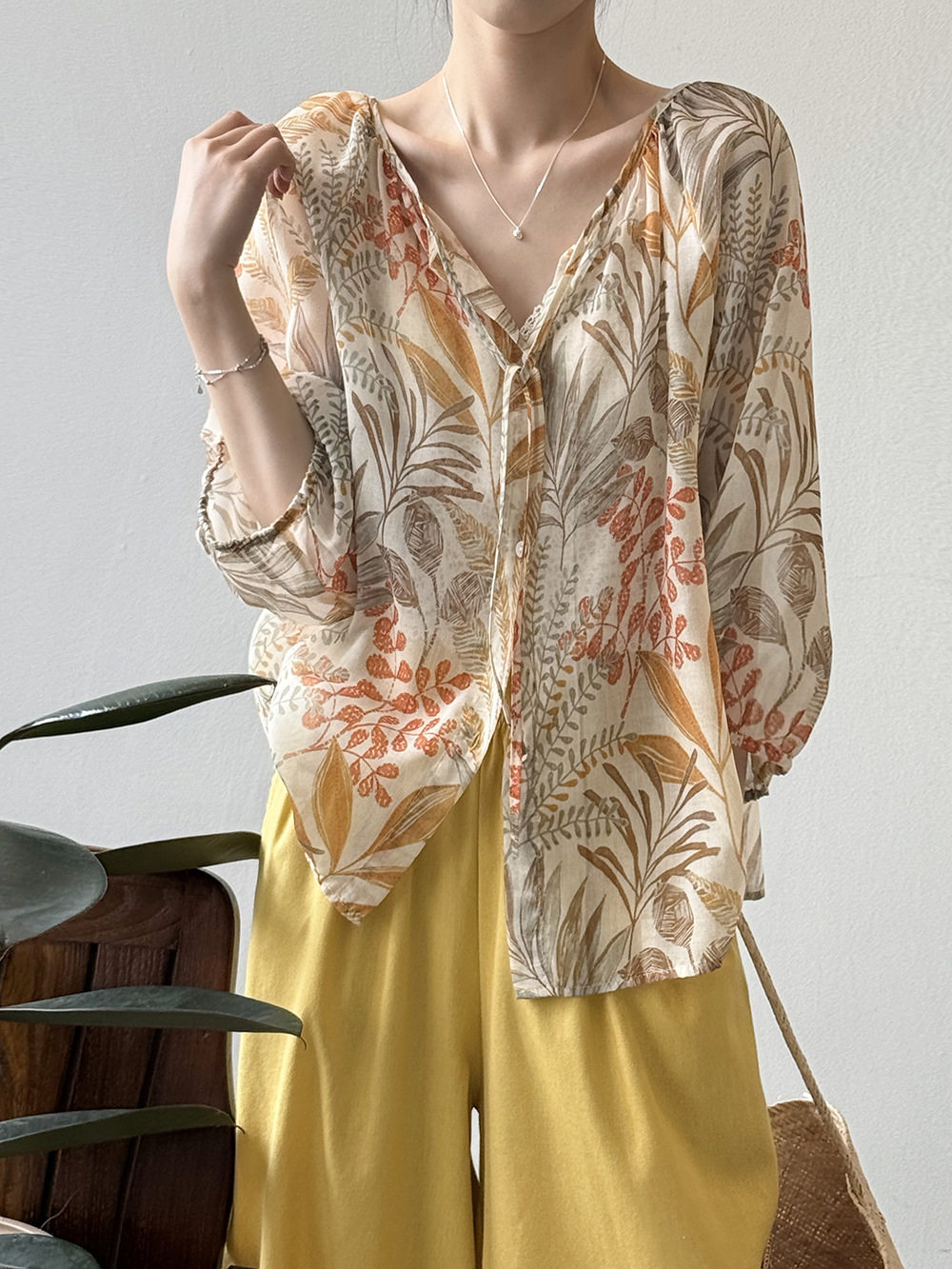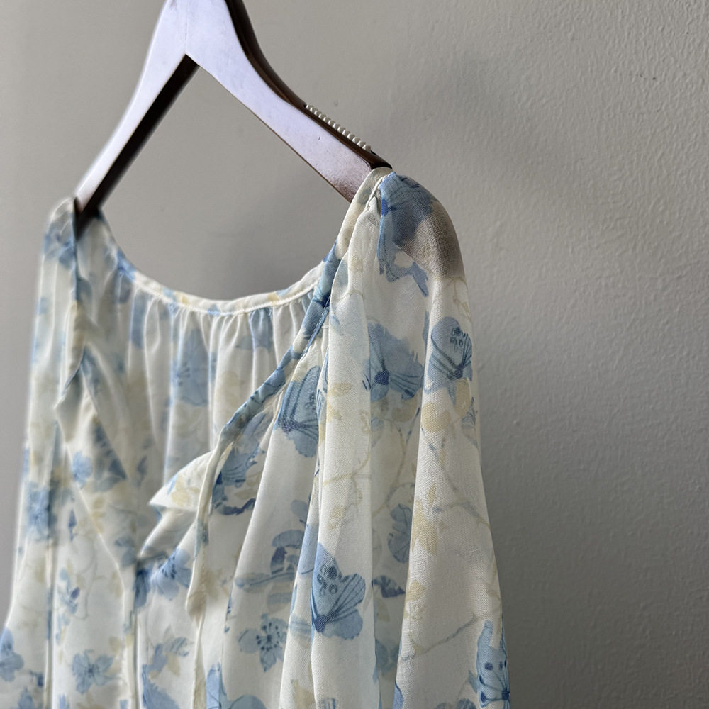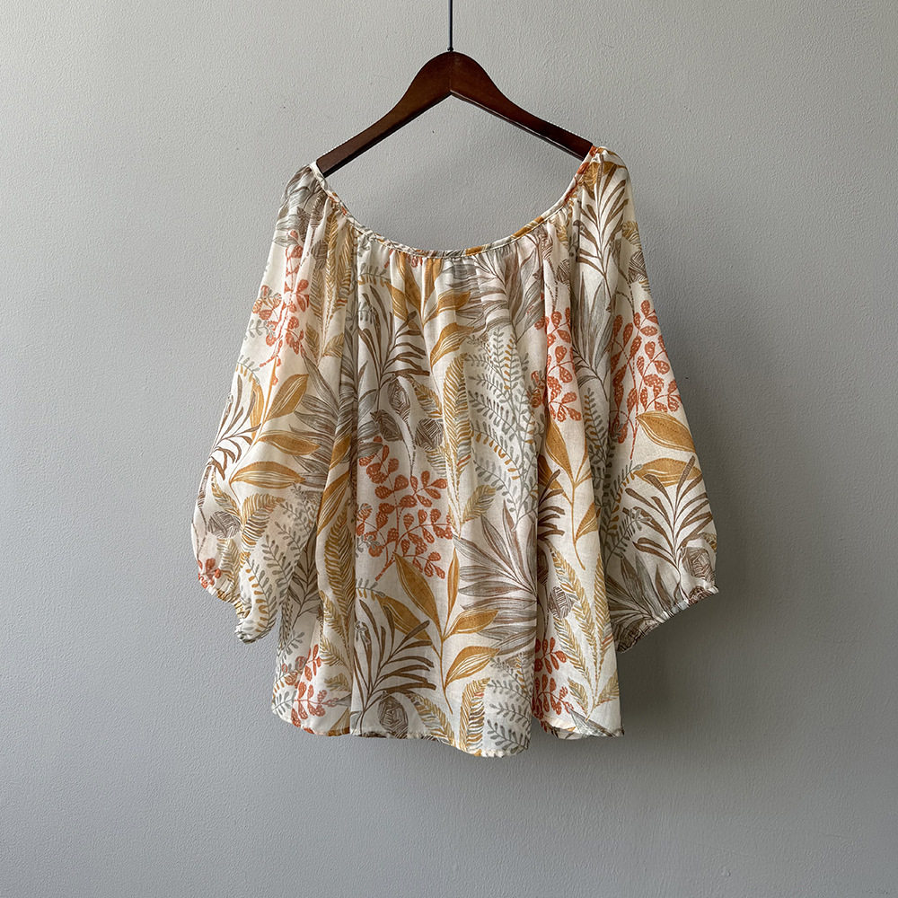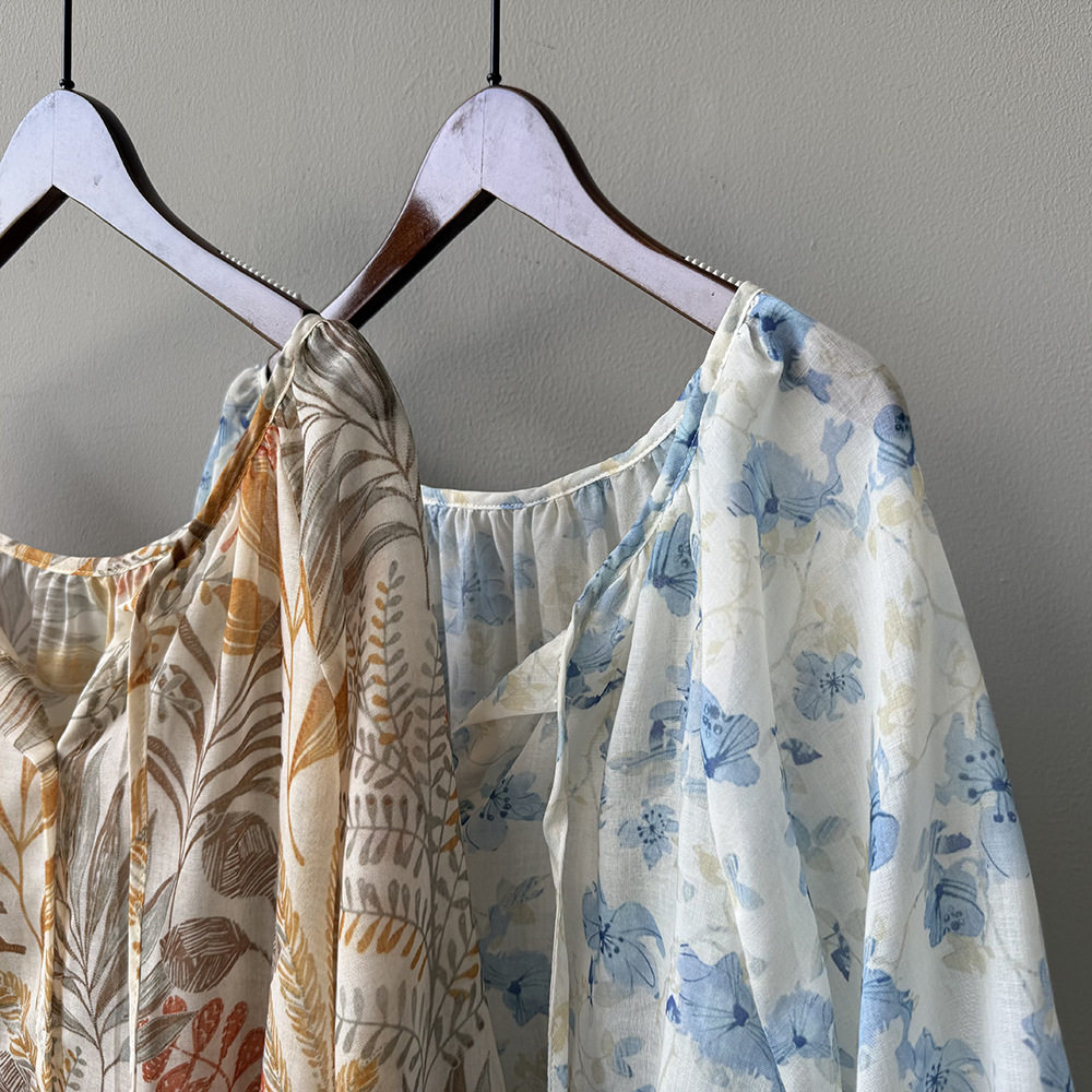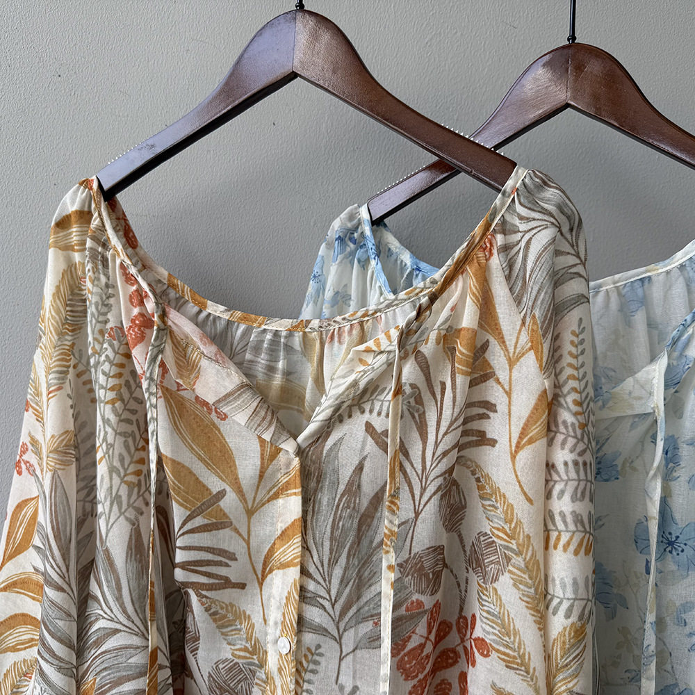 【トップス】韓国風Vネックリボン付き フラワープリントシャツ ゆったりシルエット 七分袖ブラウス【JZシリーズ】【SHシリーズ】