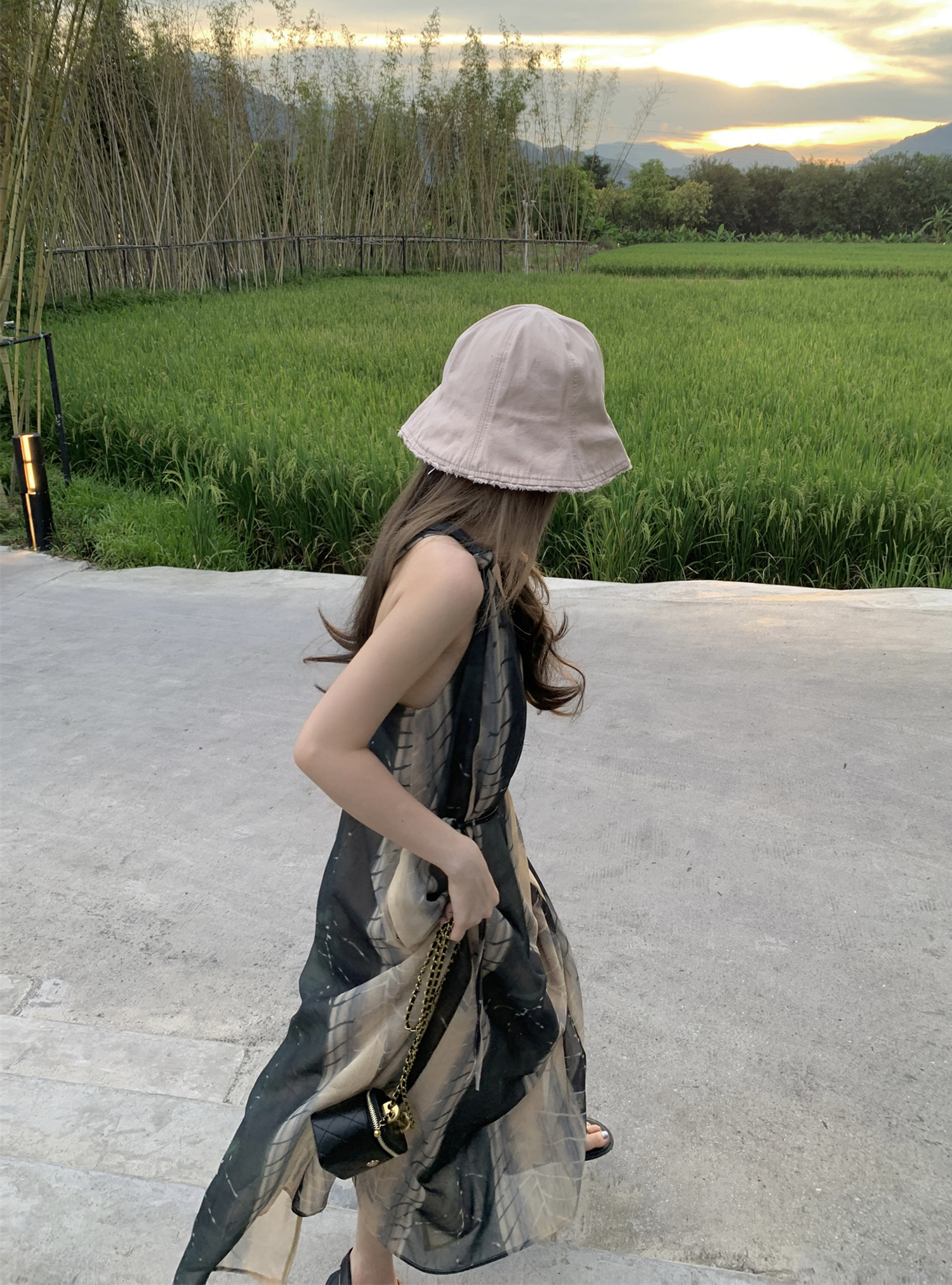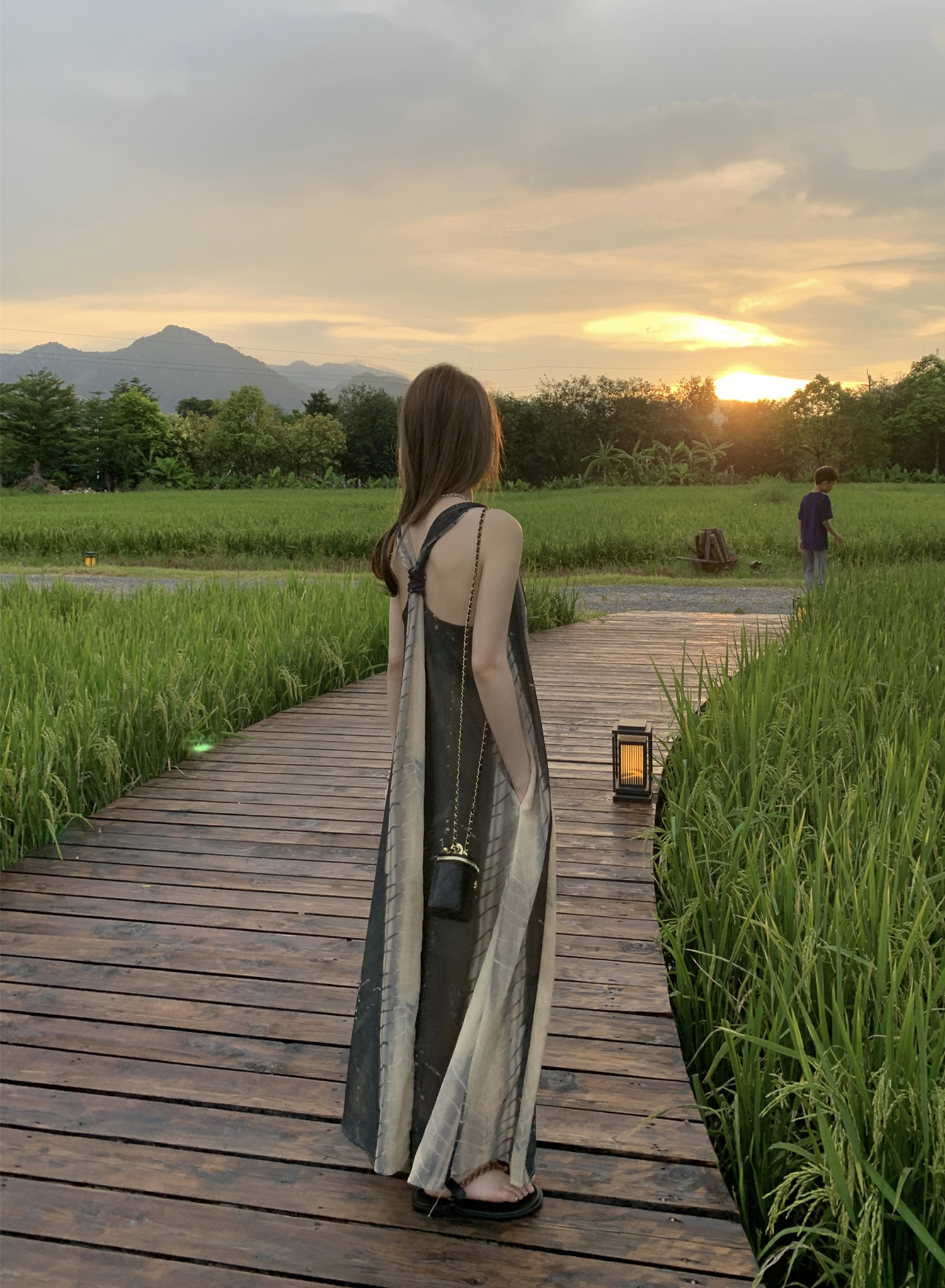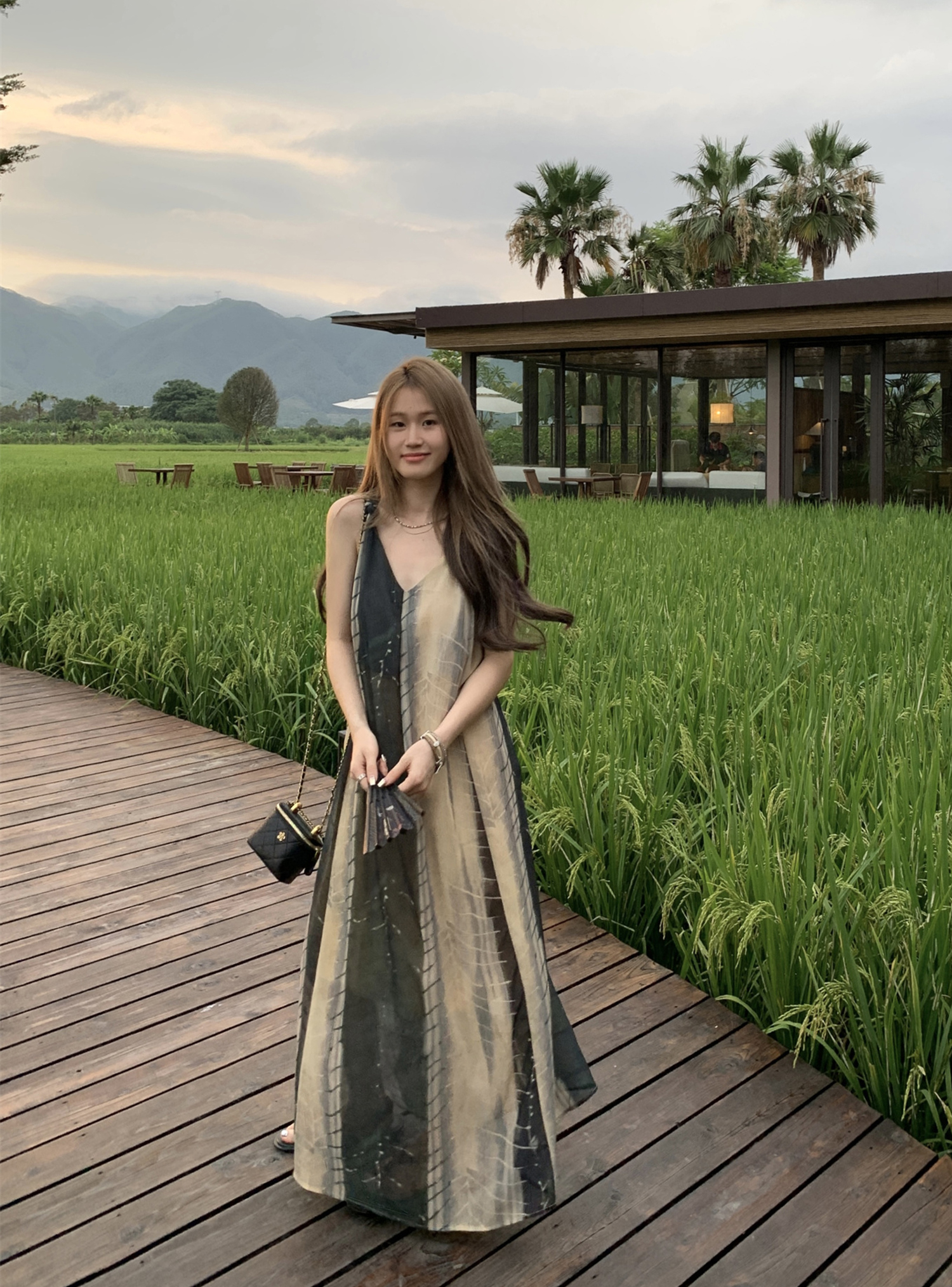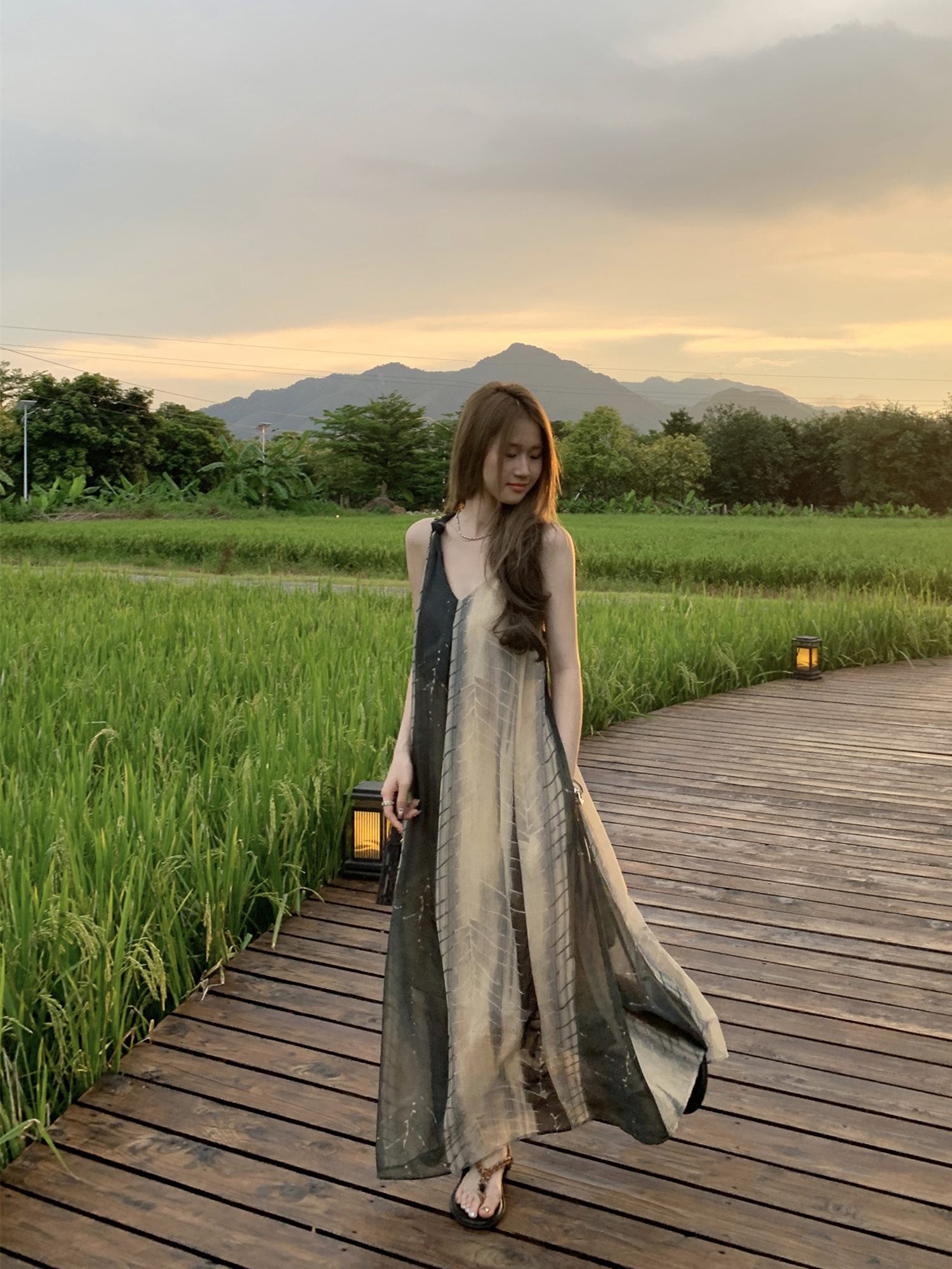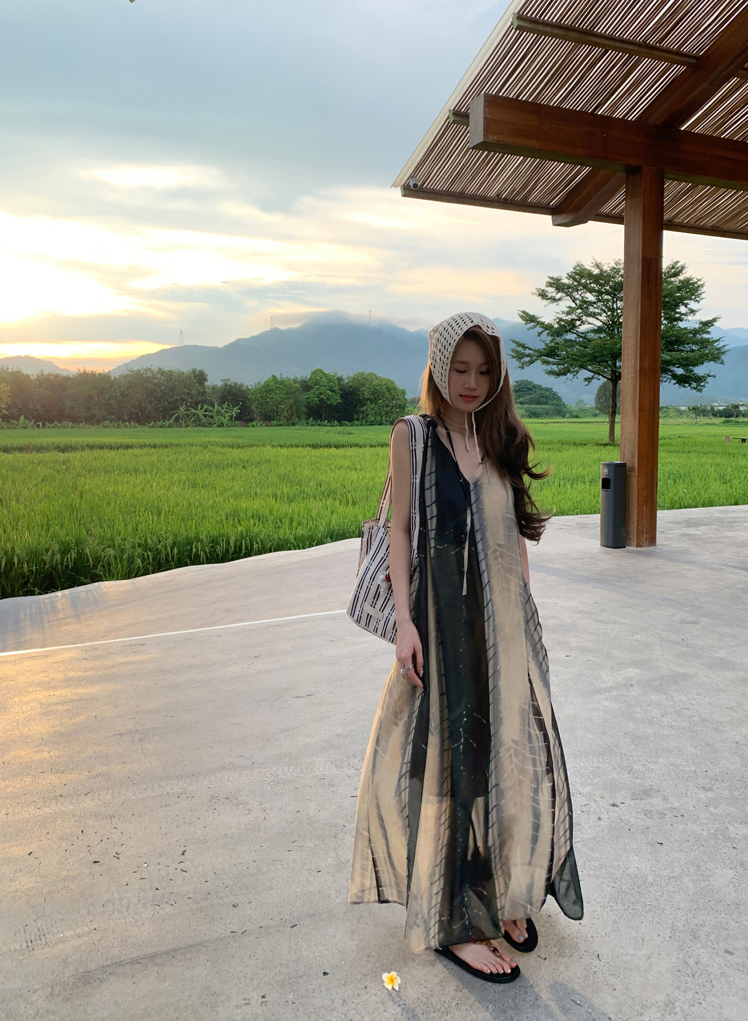 【ワンピース】アートプリント × デザイン感のある 夏用ノースリーブ Vネック タンクトップ風ロングワンピース【SHシリーズ】