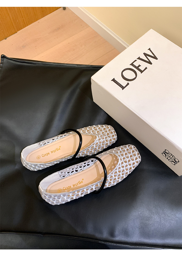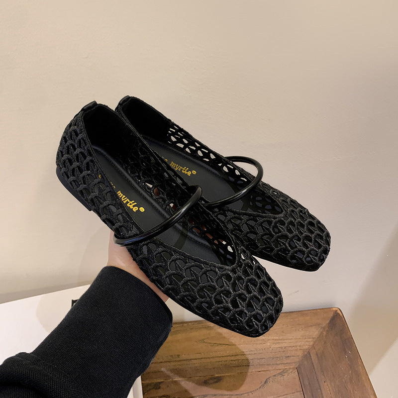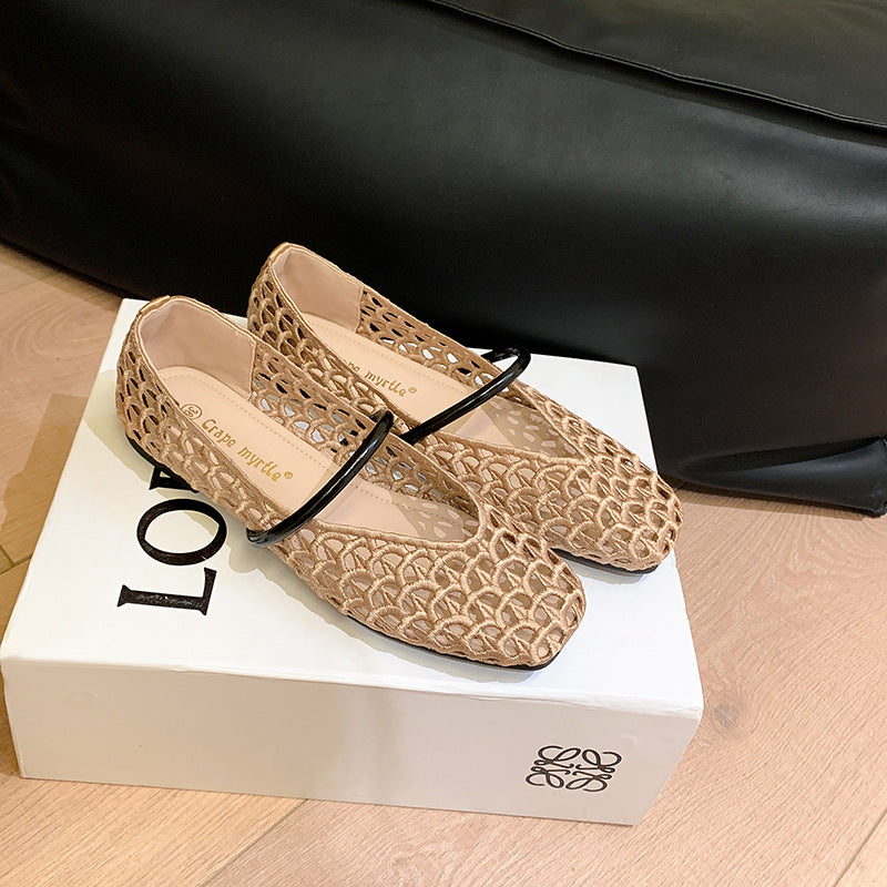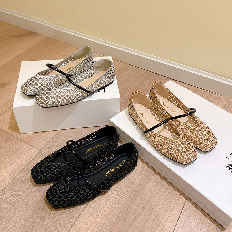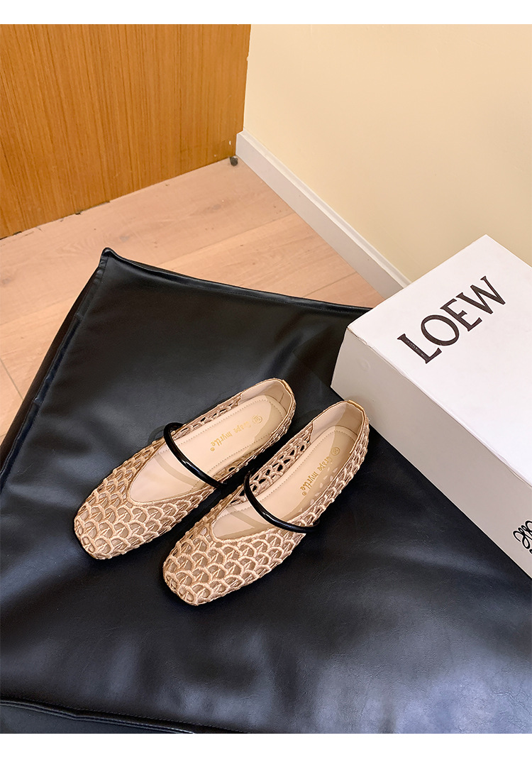 【シューズ】編み込みデザイン スクエアトゥ ワンストラップ バレエシューズ サンダル