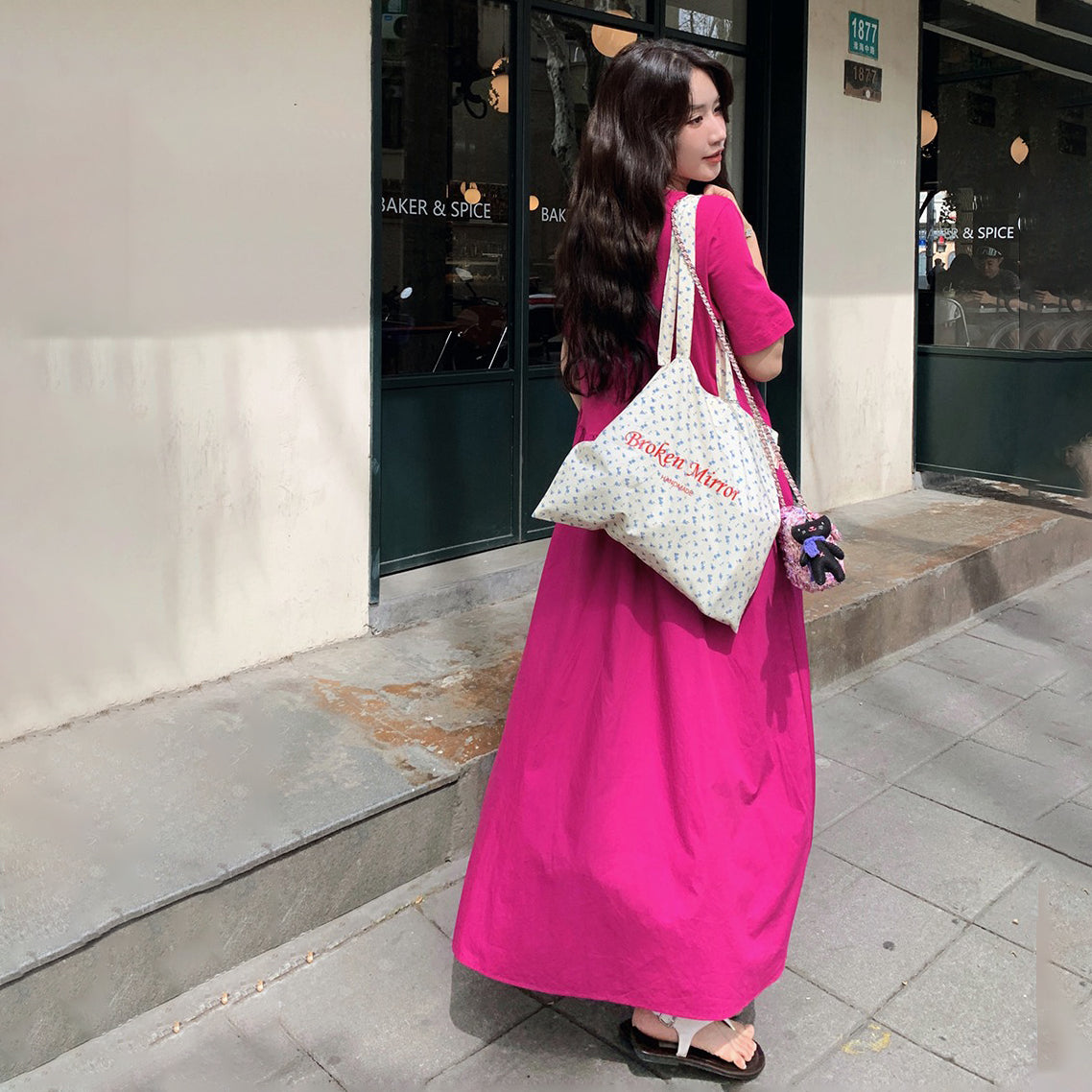 【ワンピース】韓国風 春秋新作 ゆったり大きめサイズ 体型カバー 花柄長袖ミディアムワンピース【SHシリーズ】