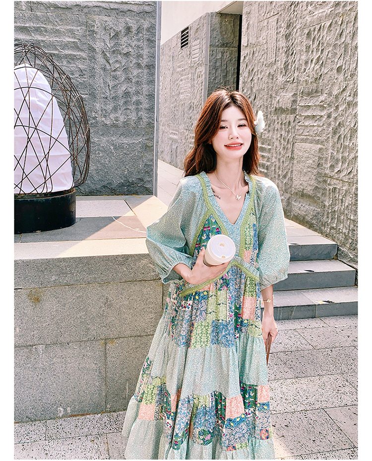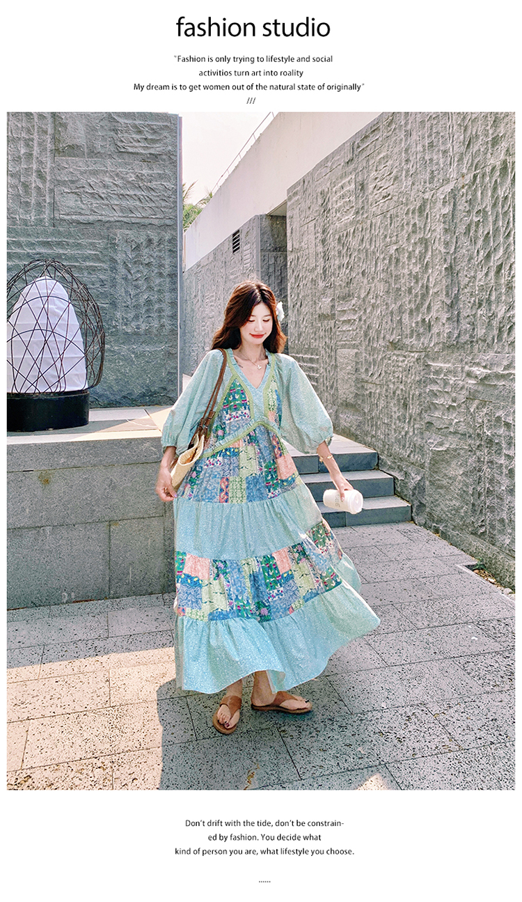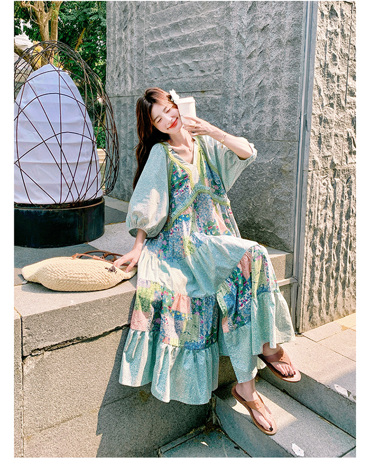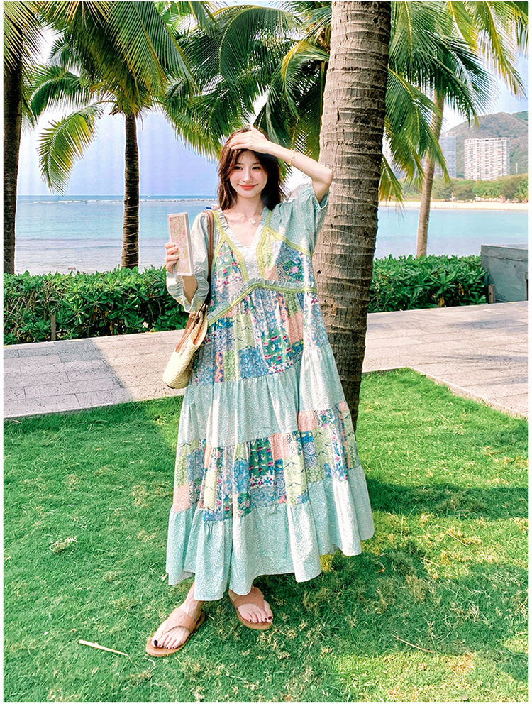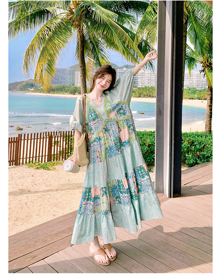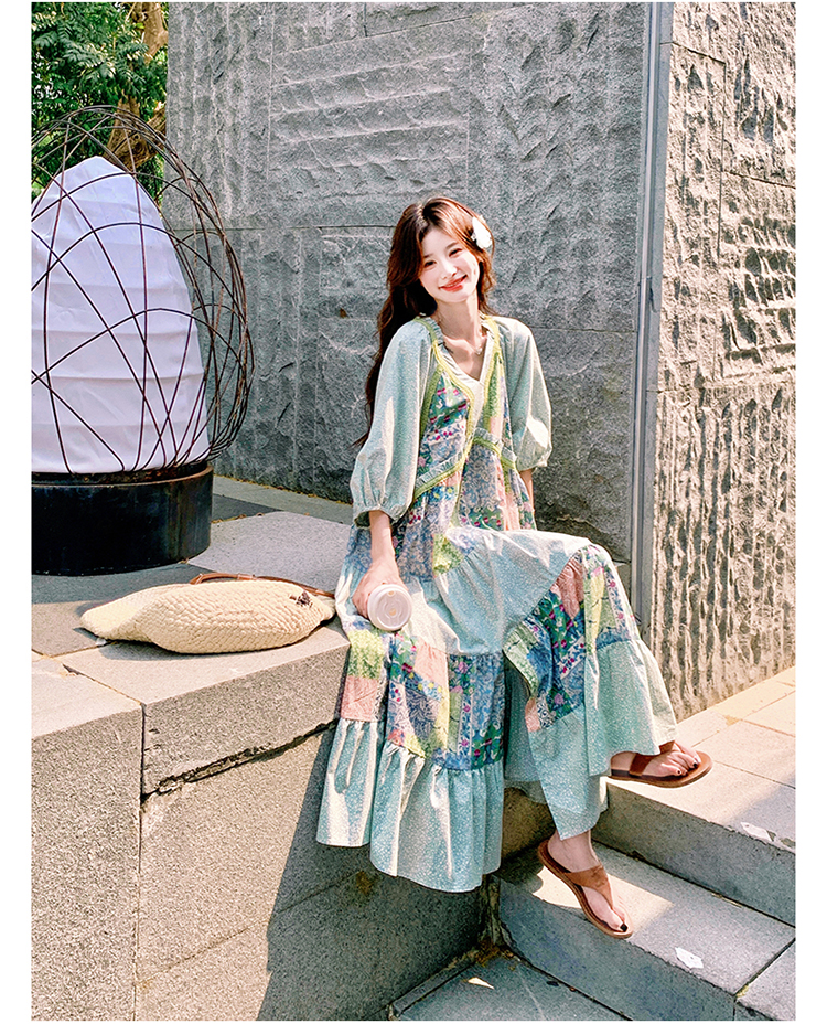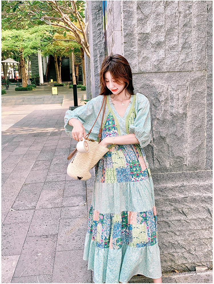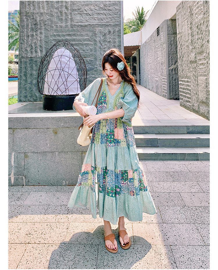 【ワンピース】森ガール風 ロマンチックグリーン切り替え 大裾Vネック 半袖ワンピース【SHシリーズ】