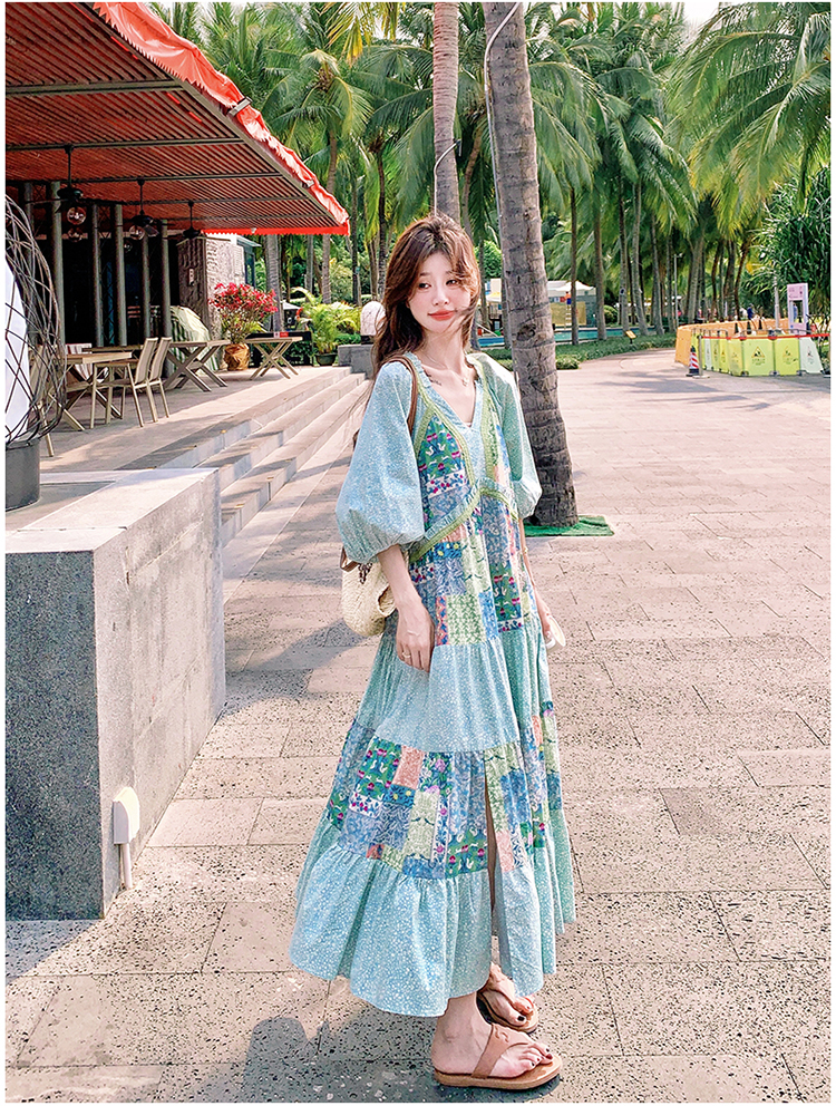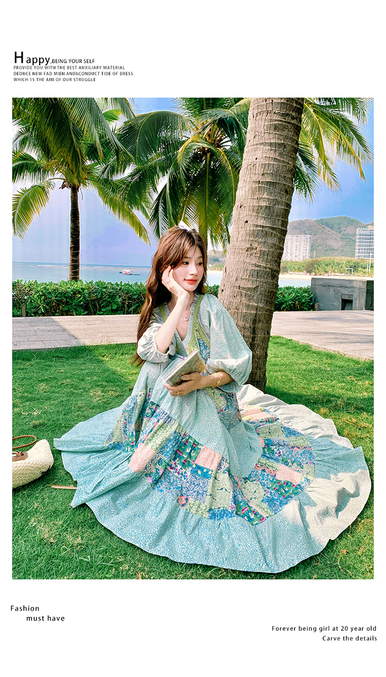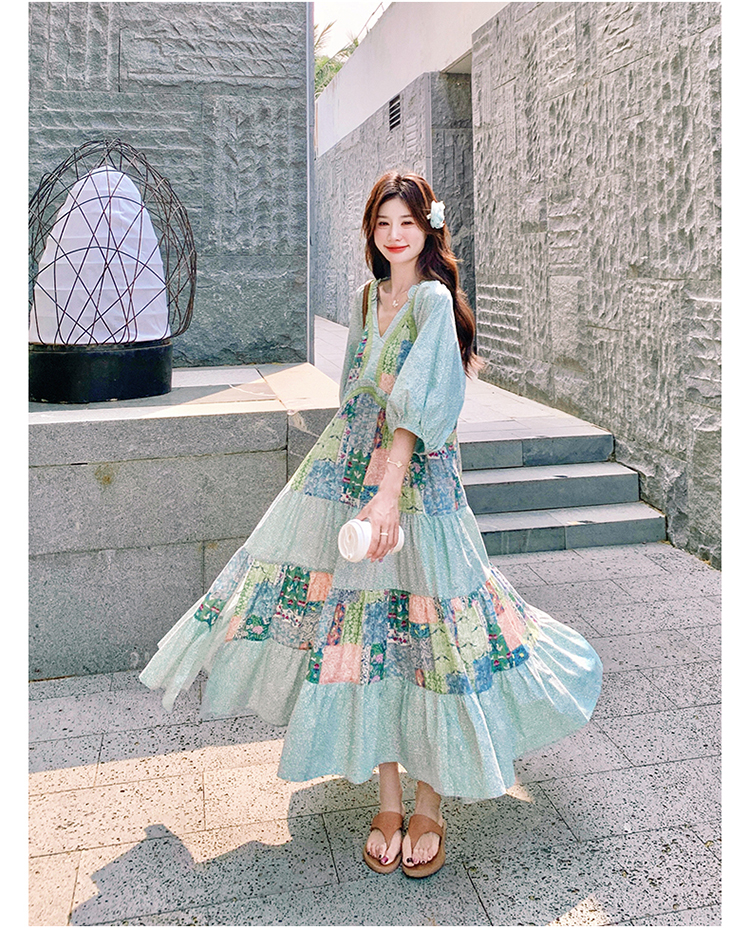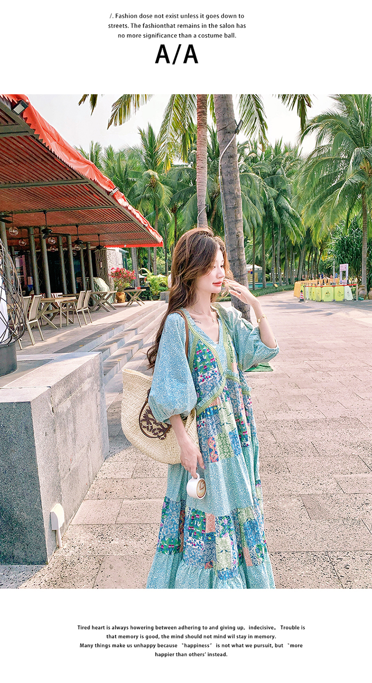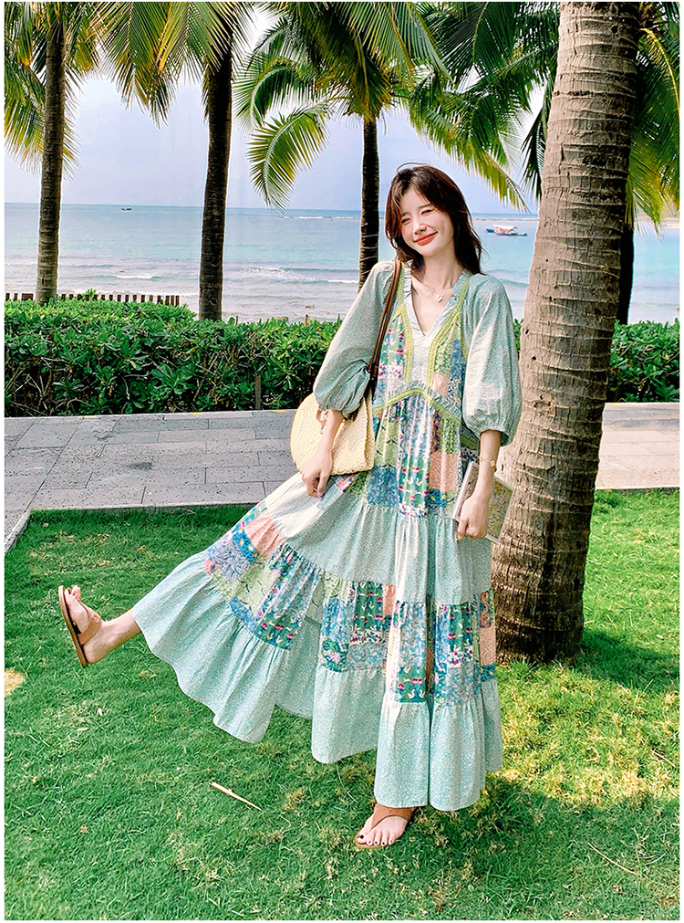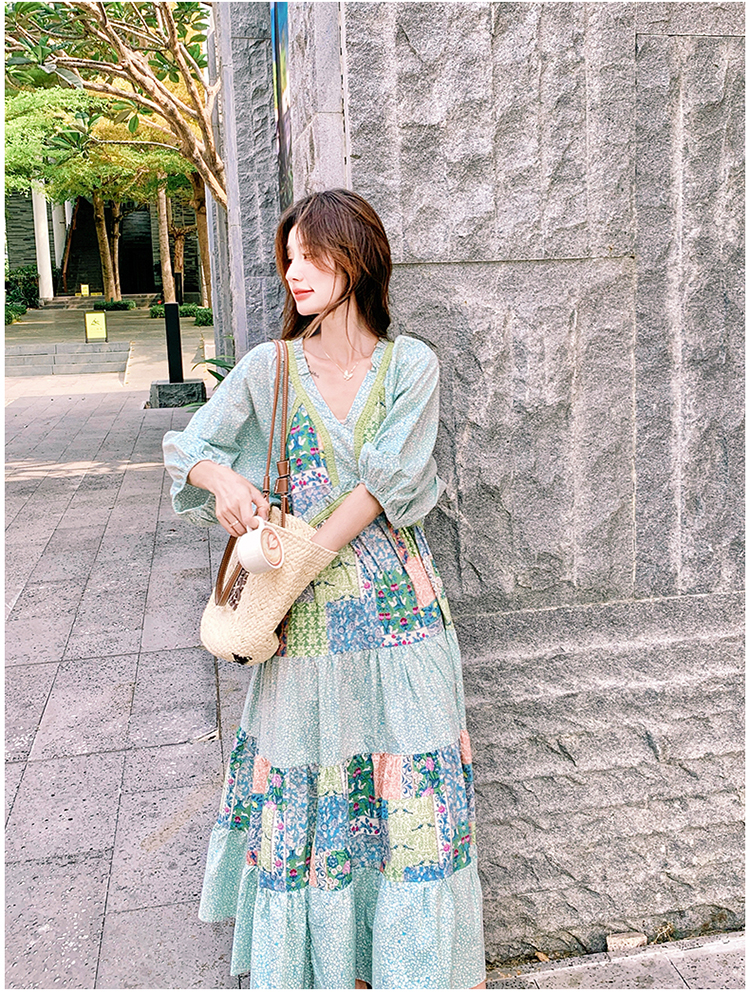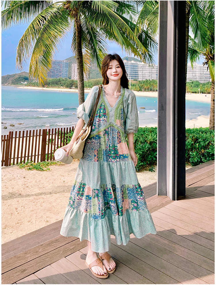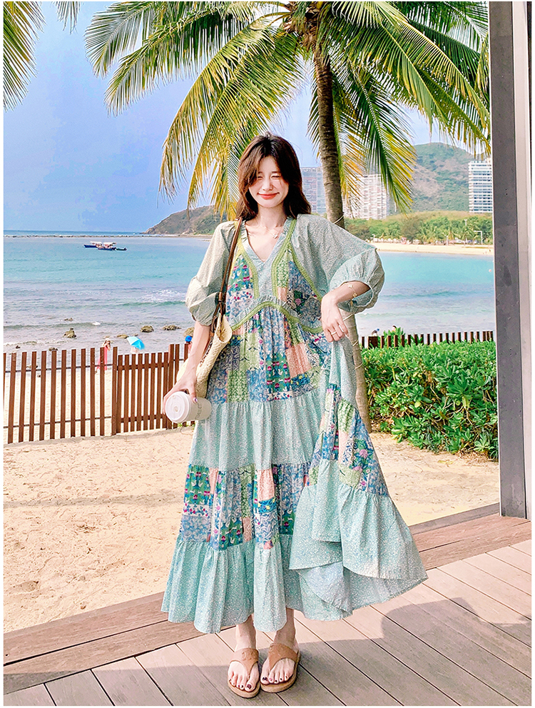 【ワンピース】森ガール風 ロマンチックグリーン切り替え 大裾Vネック 半袖ワンピース【SHシリーズ】