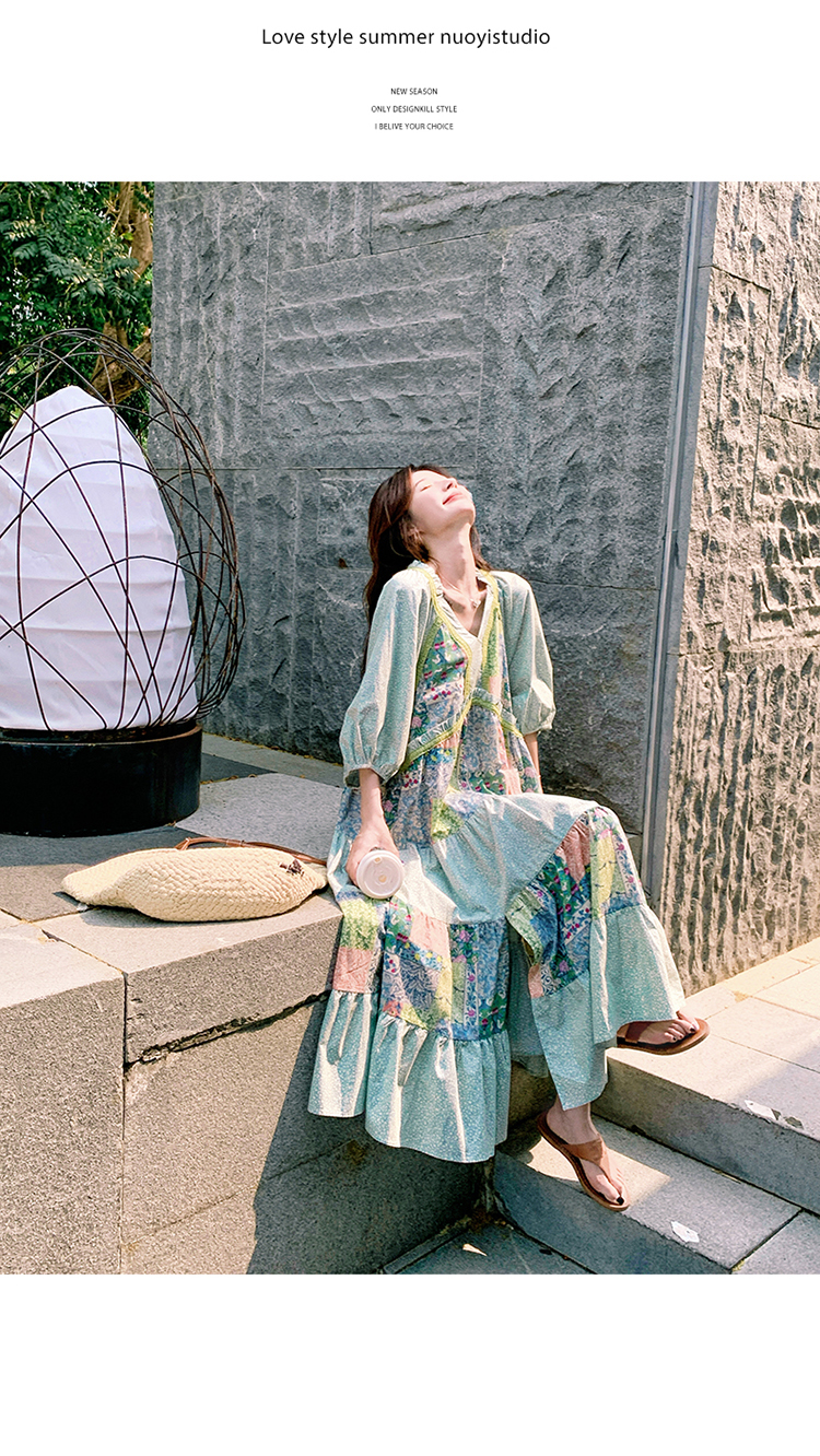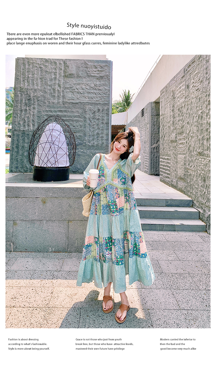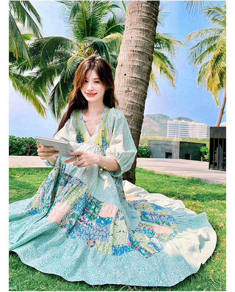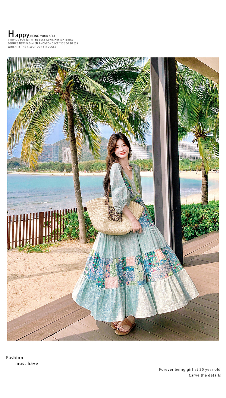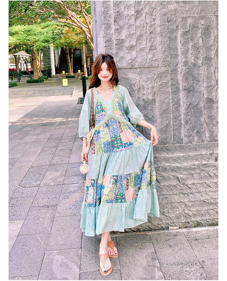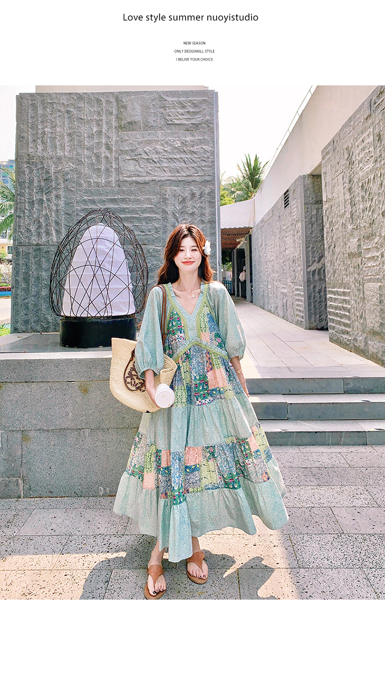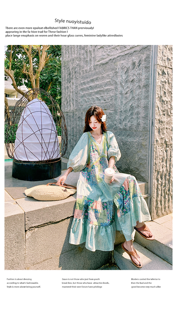 【ワンピース】森ガール風 ロマンチックグリーン切り替え 大裾Vネック 半袖ワンピース【SHシリーズ】