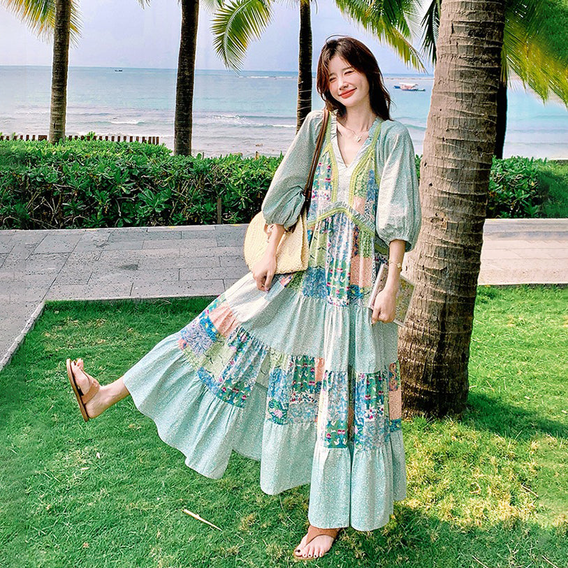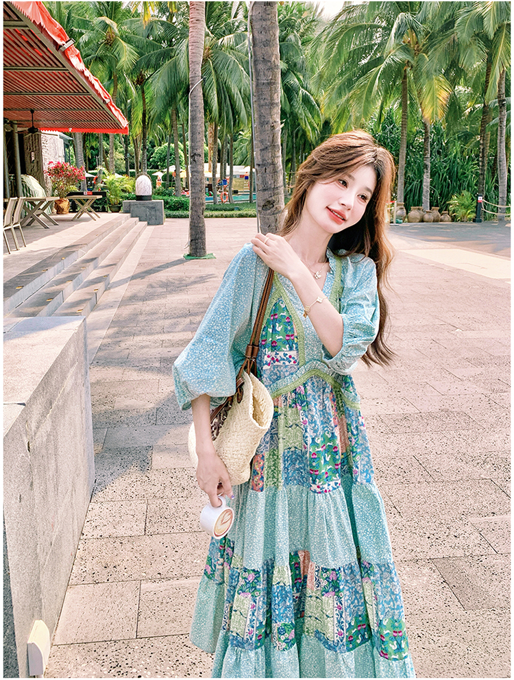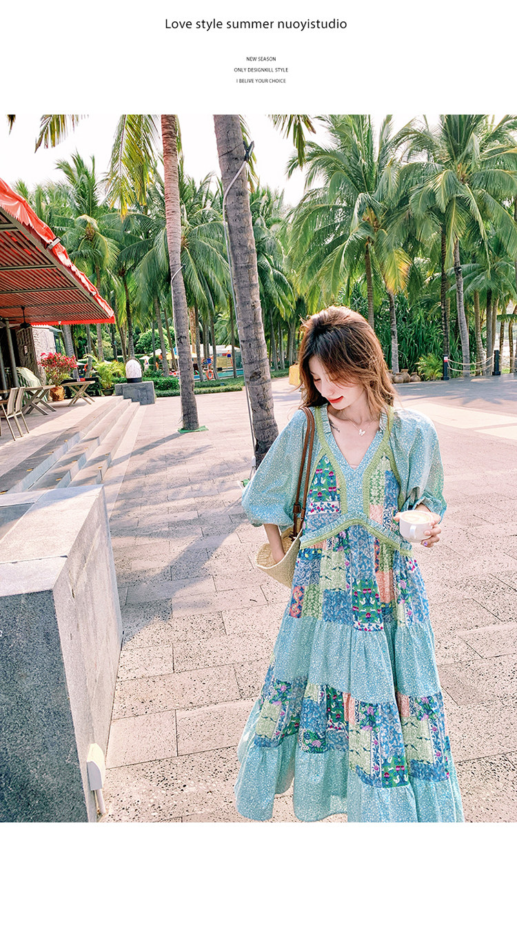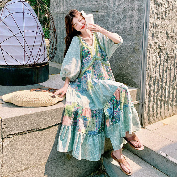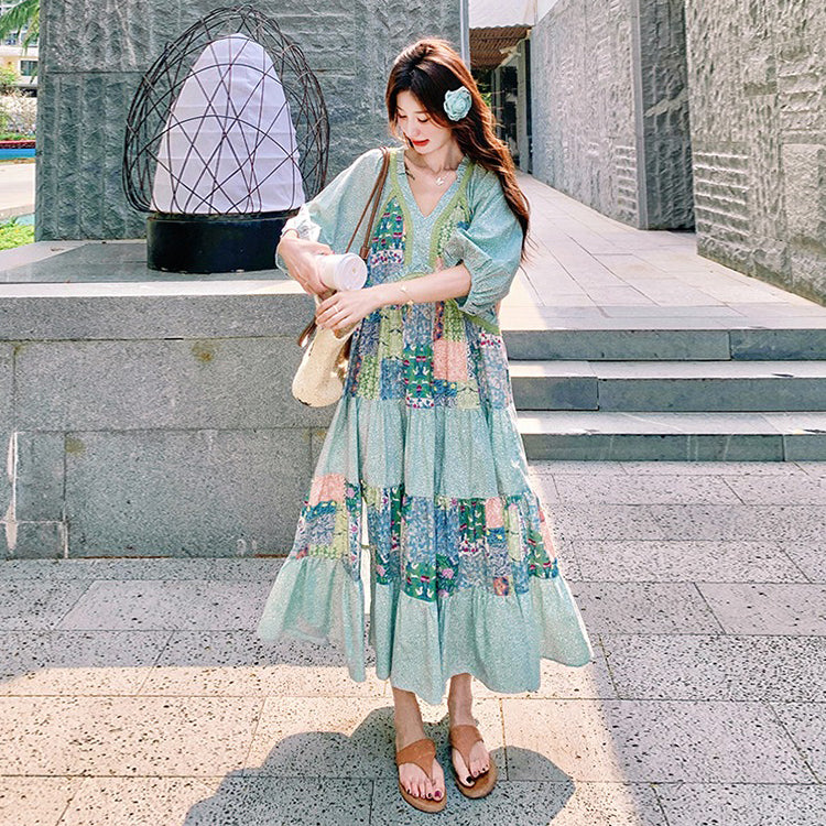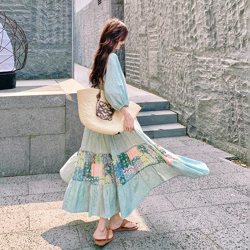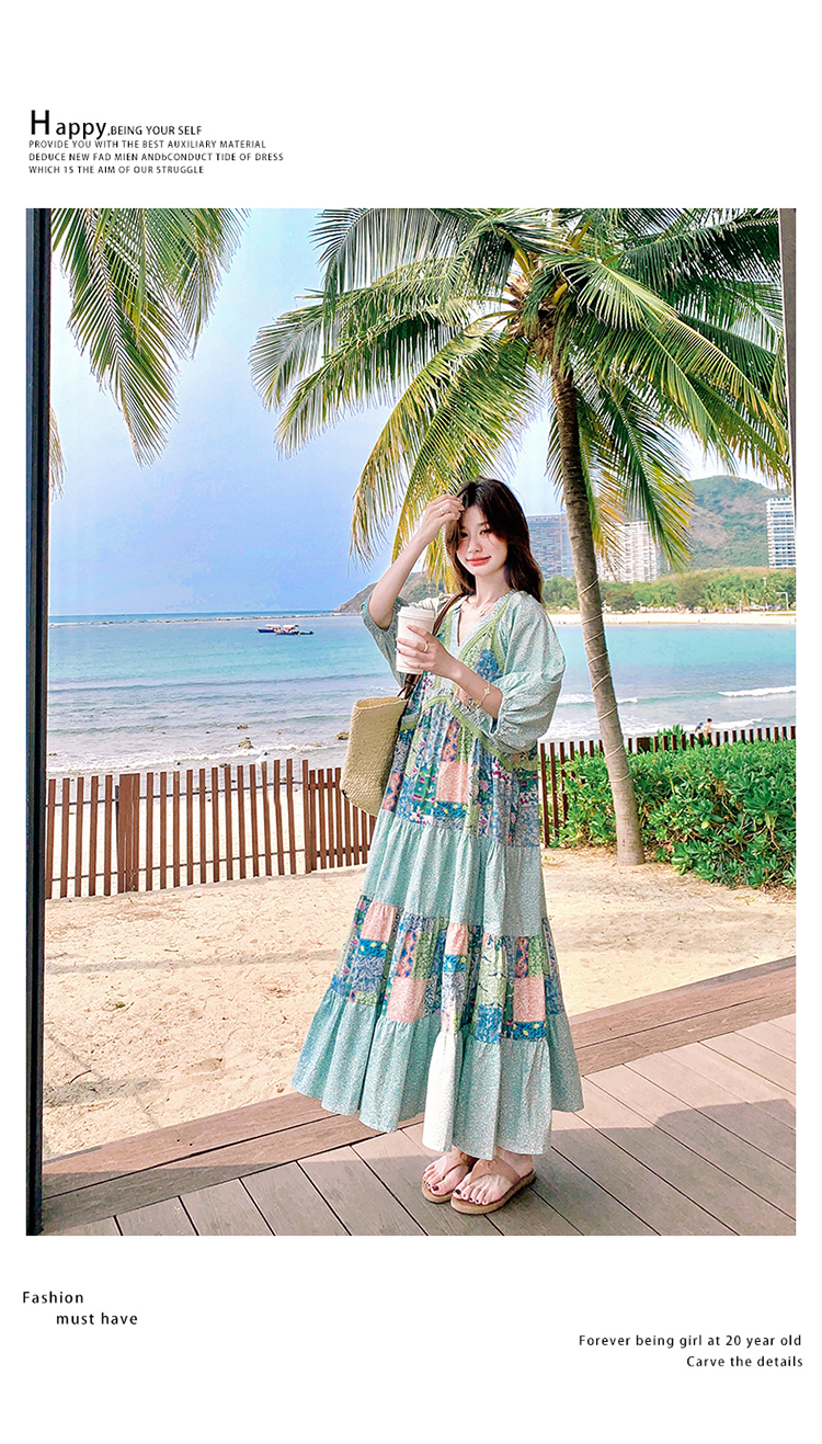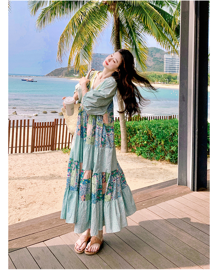 【ワンピース】森ガール風 ロマンチックグリーン切り替え 大裾Vネック 半袖ワンピース【SHシリーズ】