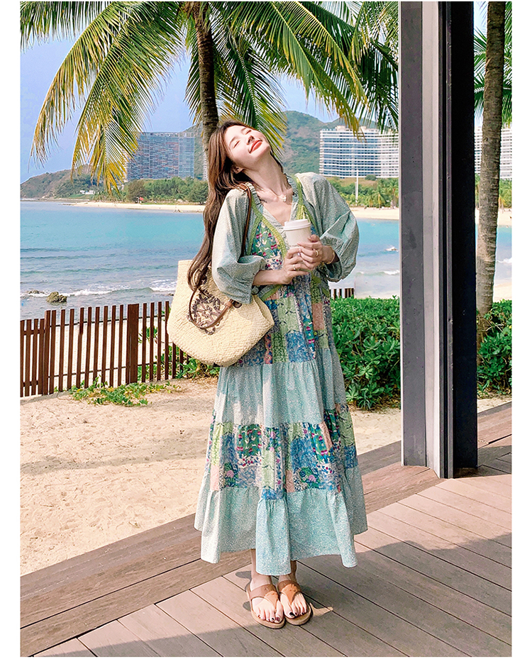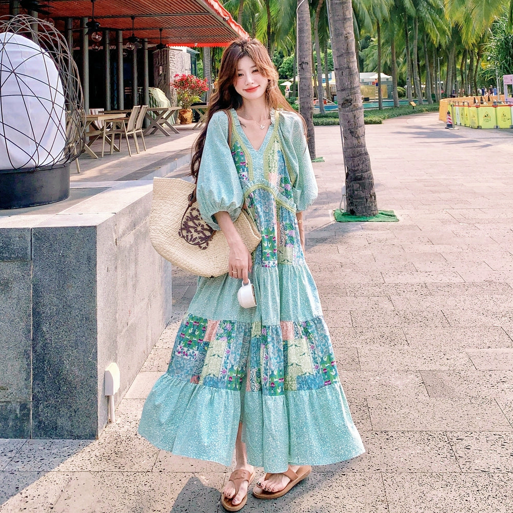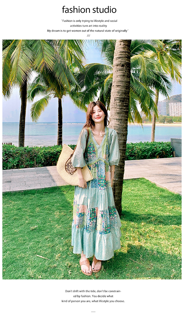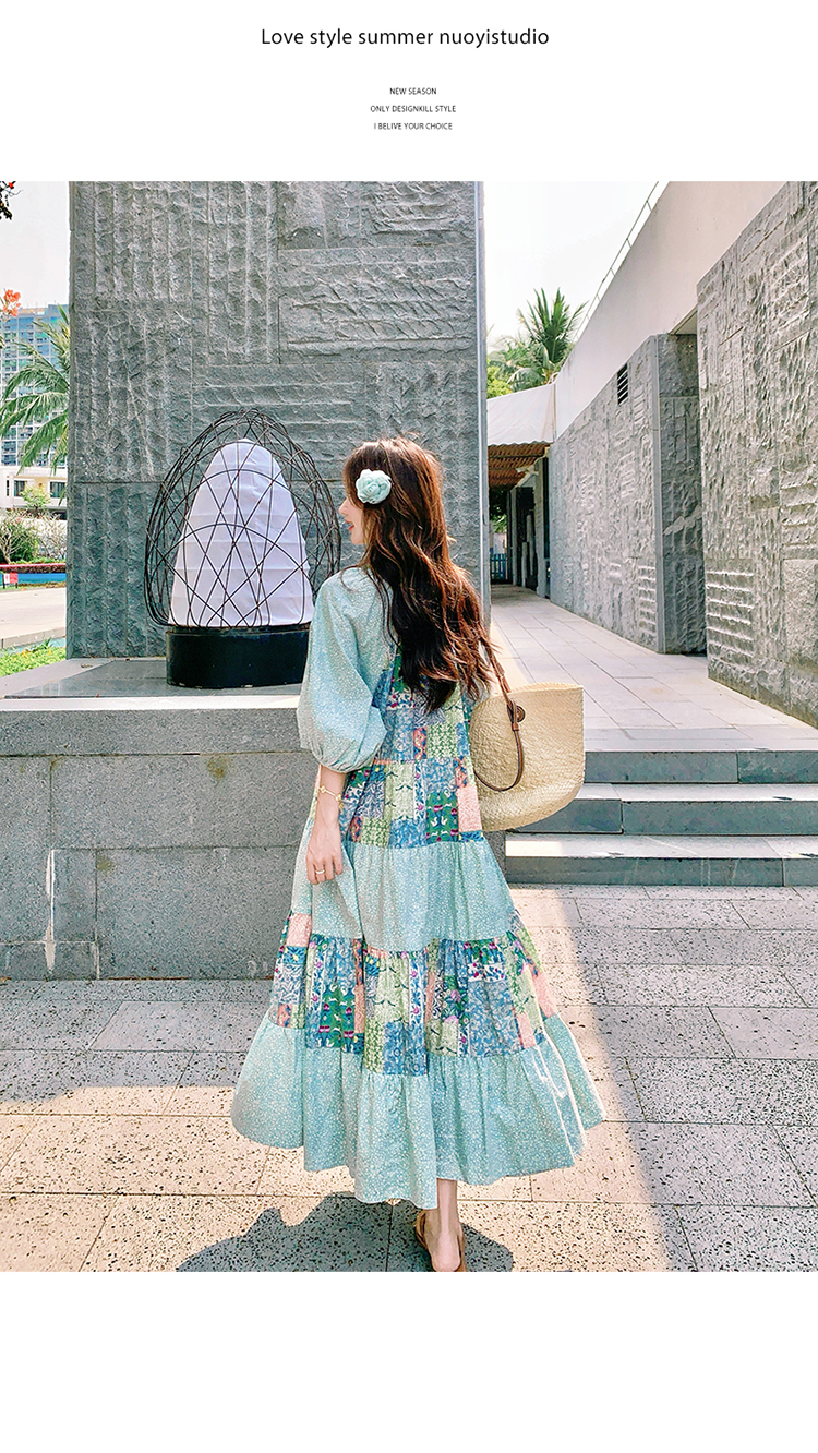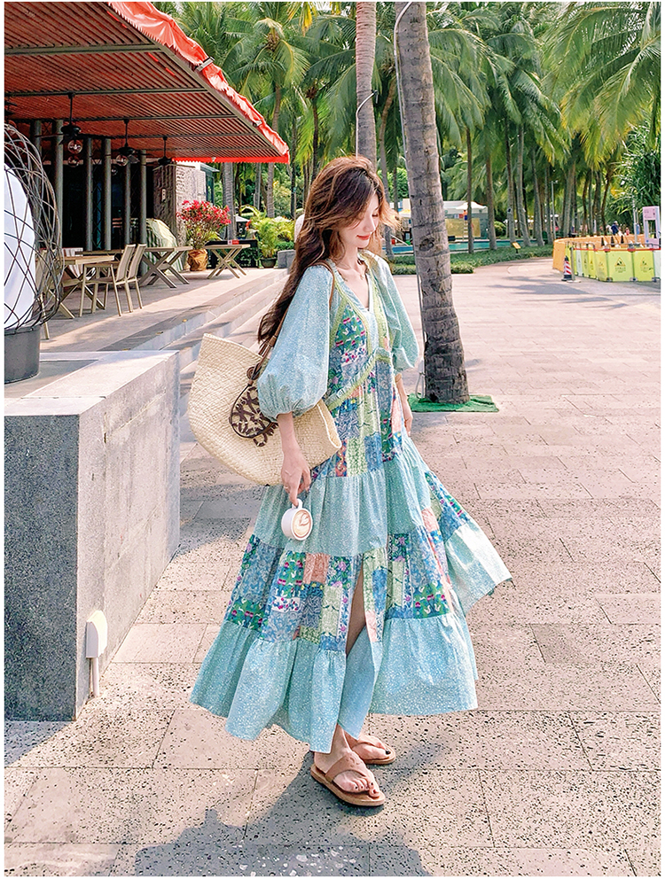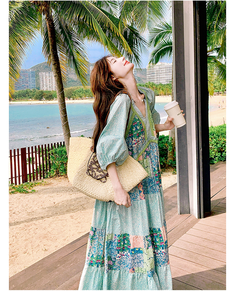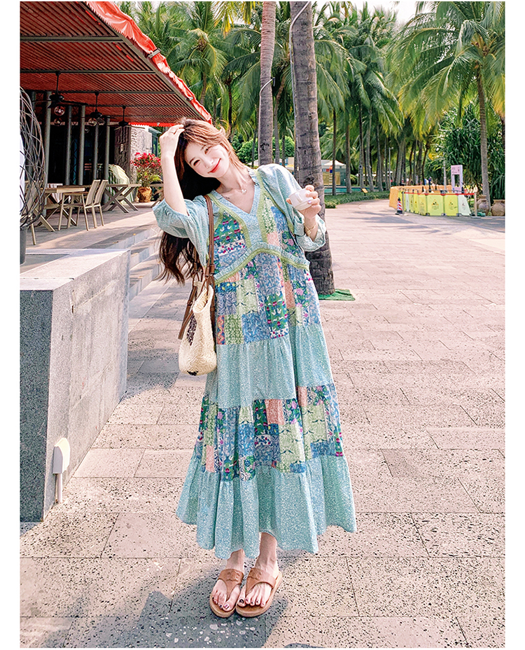 【ワンピース】森ガール風 ロマンチックグリーン切り替え 大裾Vネック 半袖ワンピース【SHシリーズ】