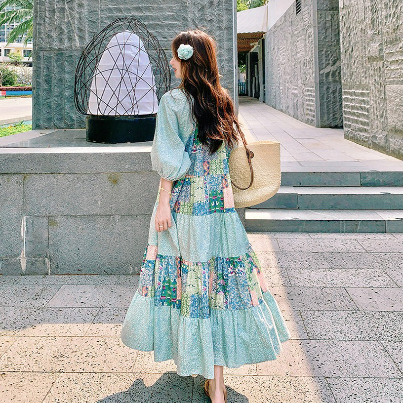 【ワンピース】韓国風 春秋新作 ゆったり大きめサイズ 体型カバー 花柄長袖ミディアムワンピース【SHシリーズ】