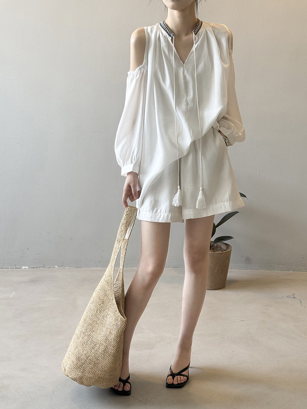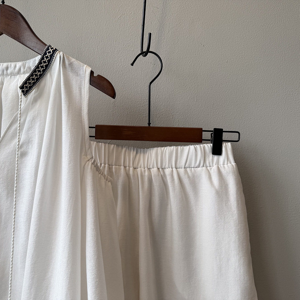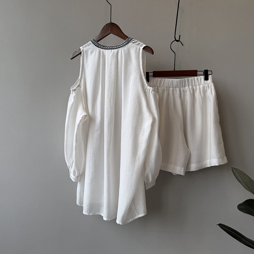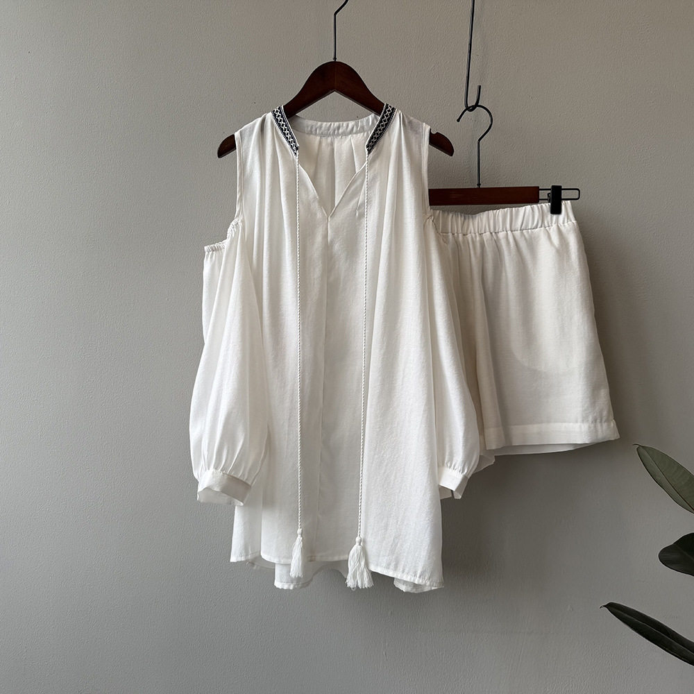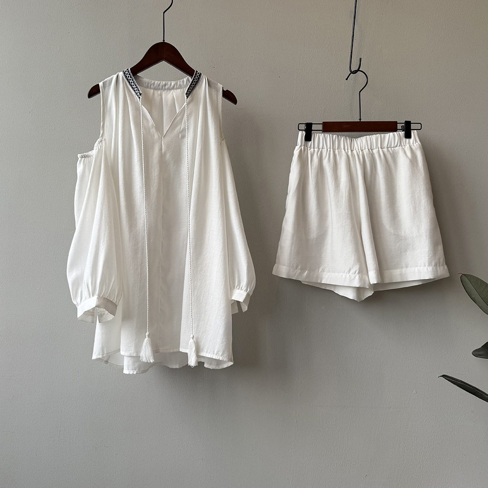 【商品名】3点セット!【ボトムス】夏新作 フレンチカジュアル 涼感シアー 天然素材シャツ+キャミ+ショートパンツ 3点セットアップ【JZシリーズ】