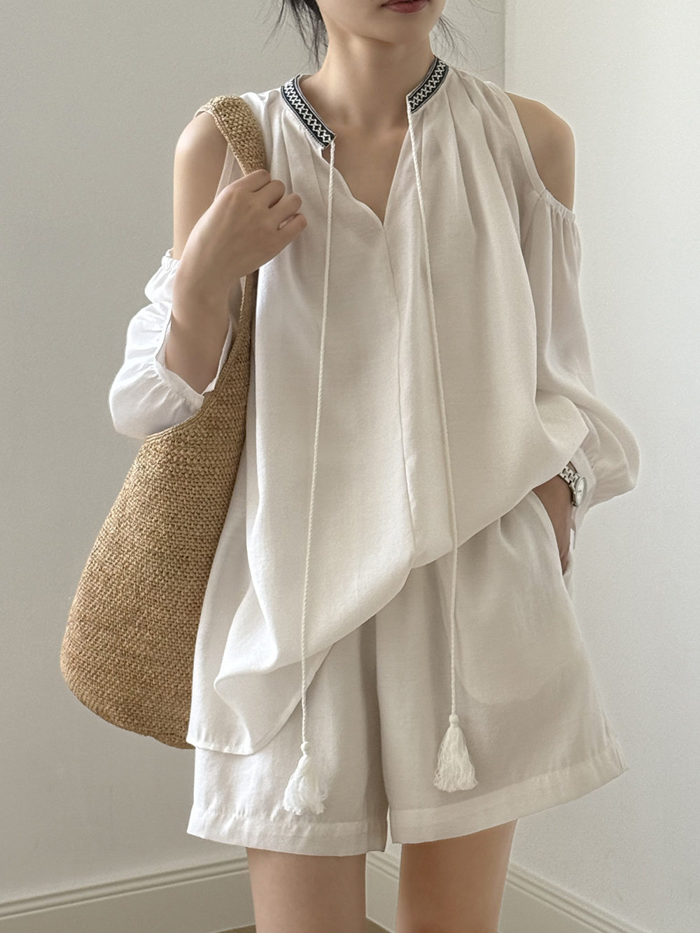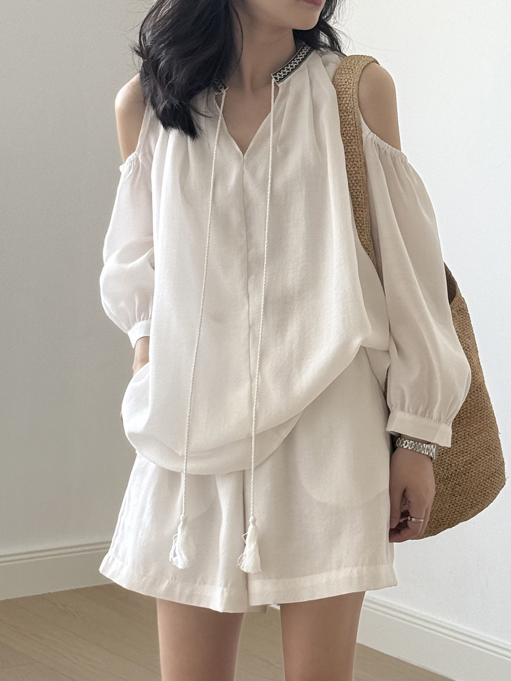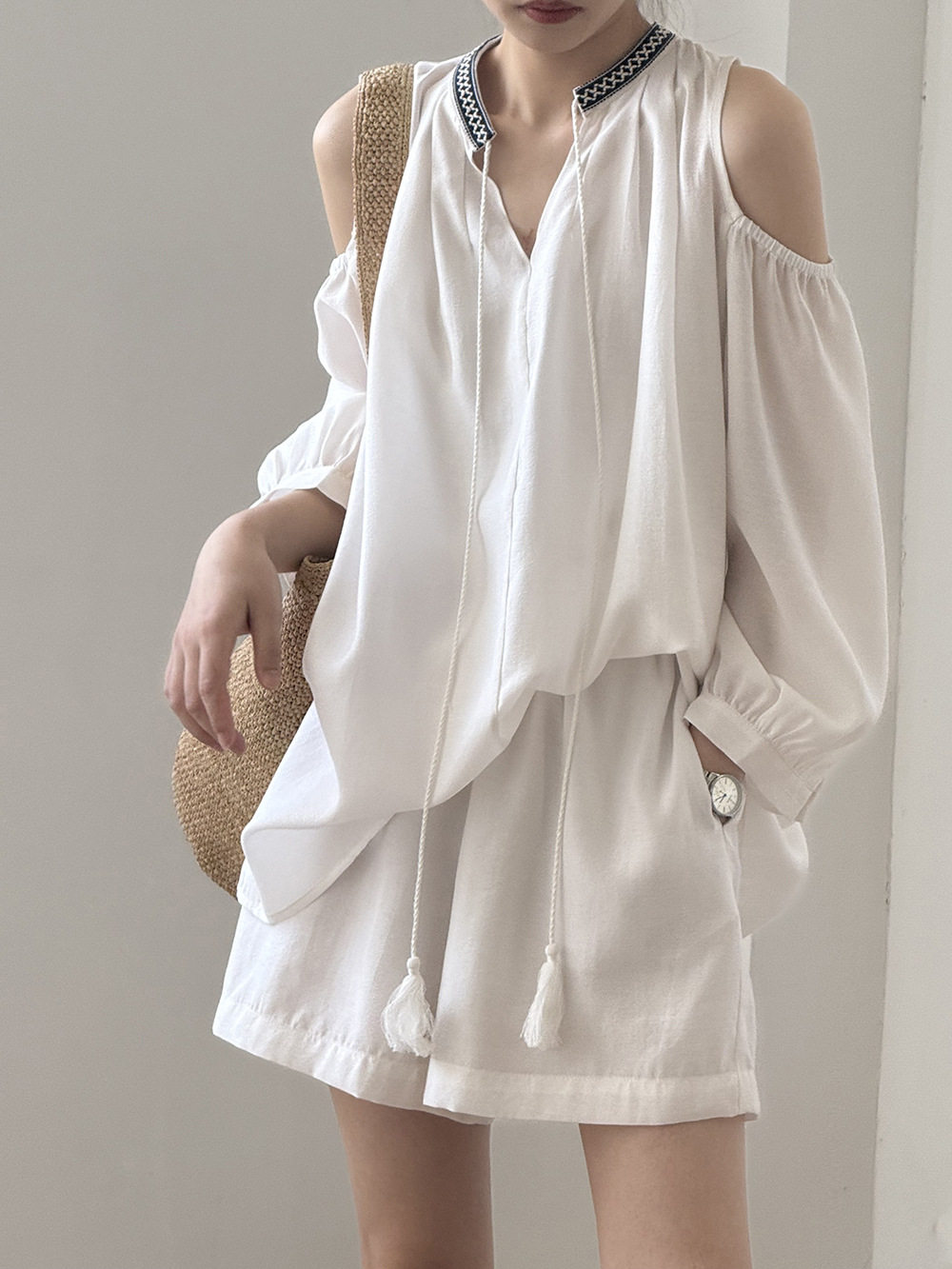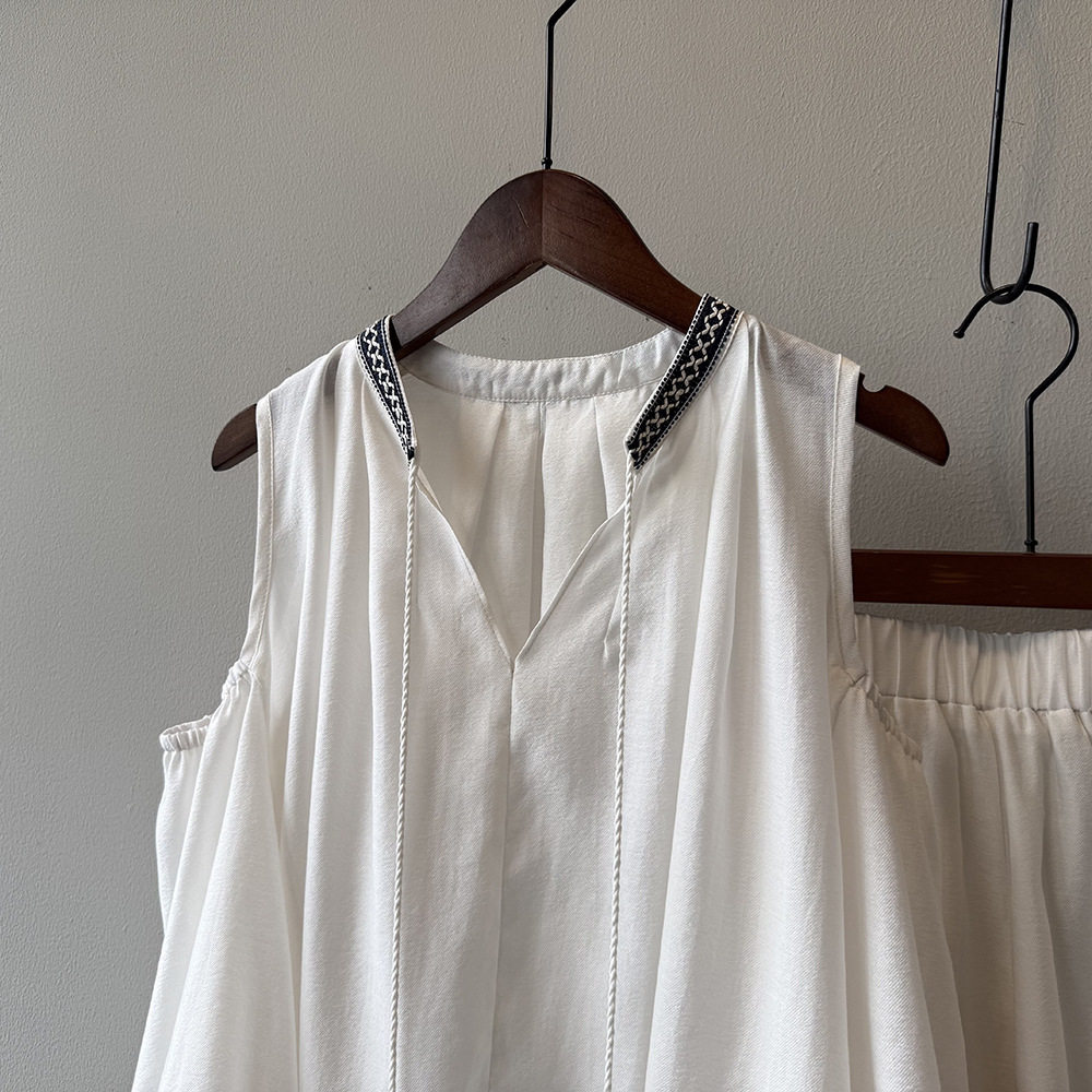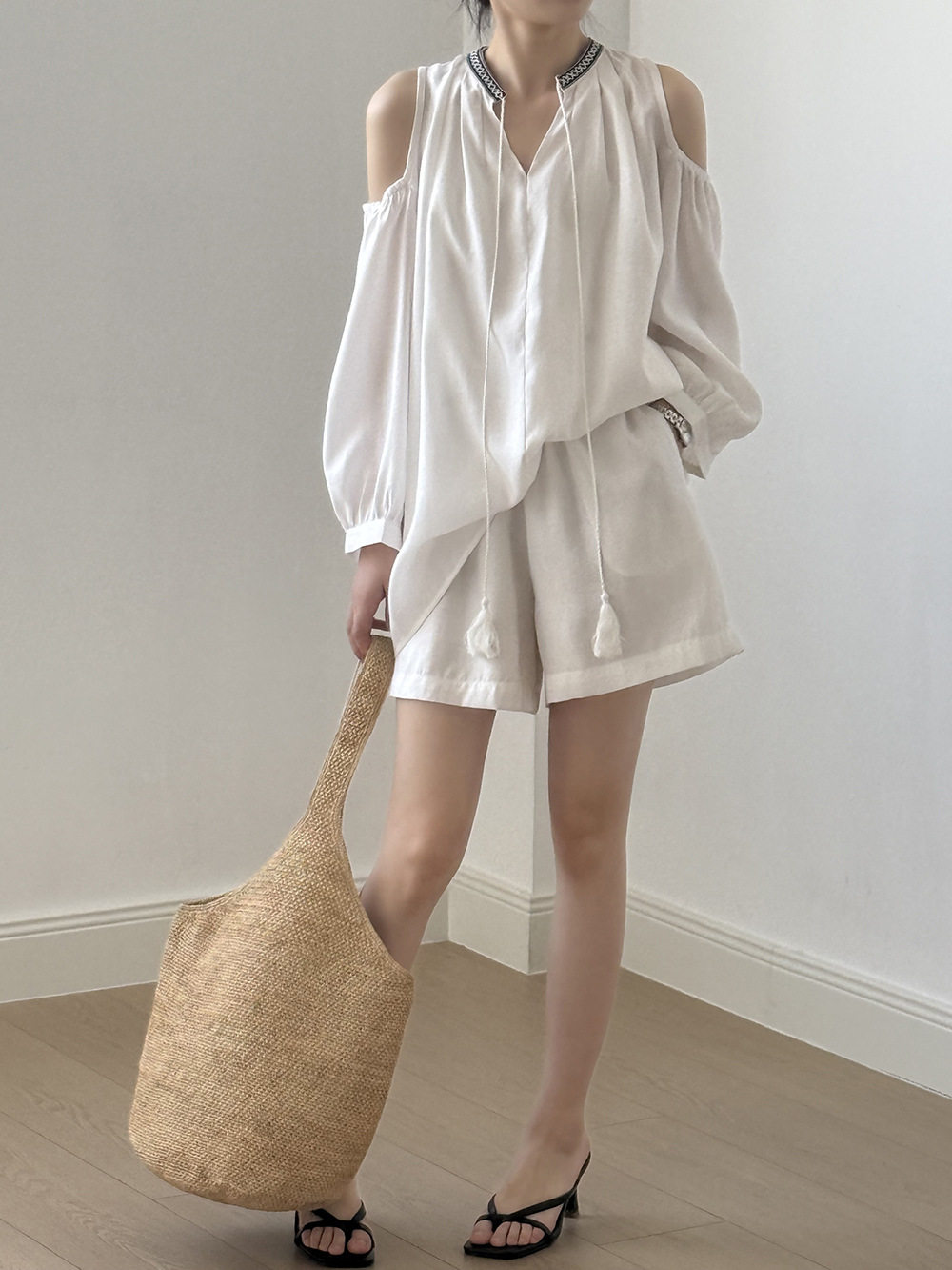 【商品名】3点セット!【ボトムス】夏新作 フレンチカジュアル 涼感シアー 天然素材シャツ+キャミ+ショートパンツ 3点セットアップ【JZシリーズ】